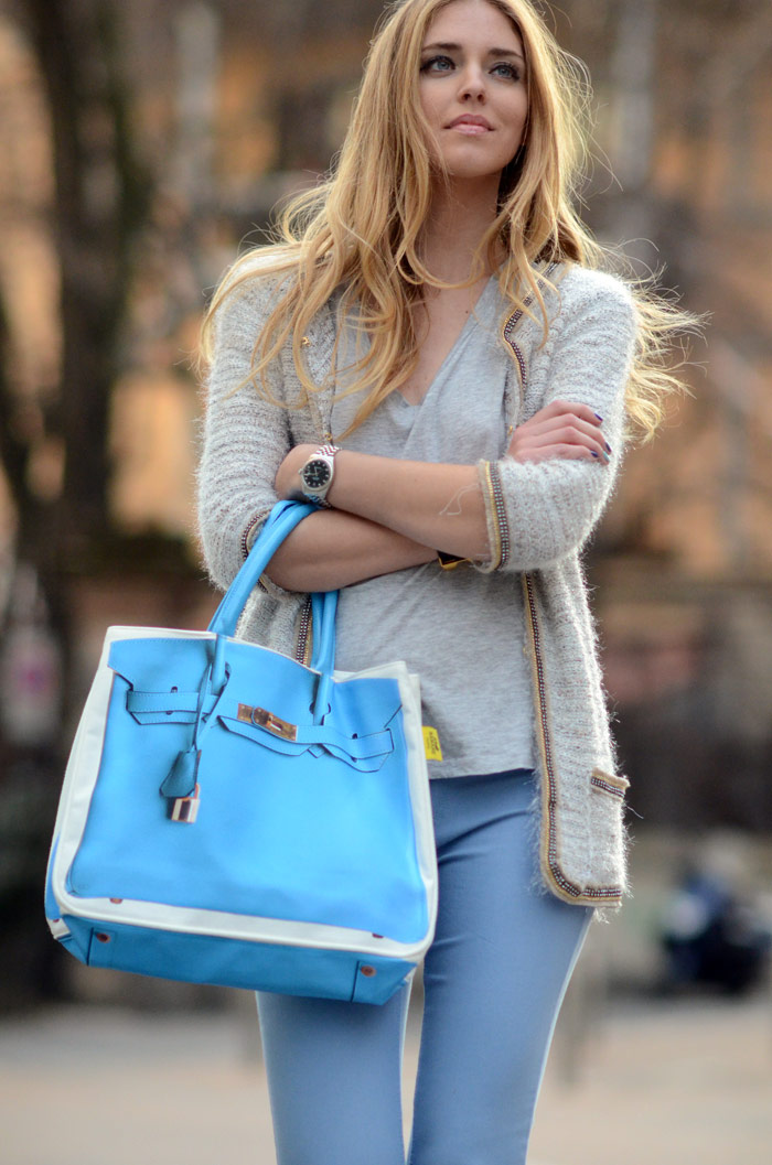Finalmente sono riuscita nella “mia missione”: sono di Banane Taipei e rappresentano in maniera simpatica e spiritosa (e decisamente economica) la borsa del desiderio, l’intramontabile Birkin, in tantissimi diversi colori. Io le ho scelte nelle varianti lake blue, grass green e midnight magenta e ieri, finite le sfilate, ho indossato la prima di queste con un look dai toni chiari in cui la mia Banane Taipei spiccava vivacemente ๐