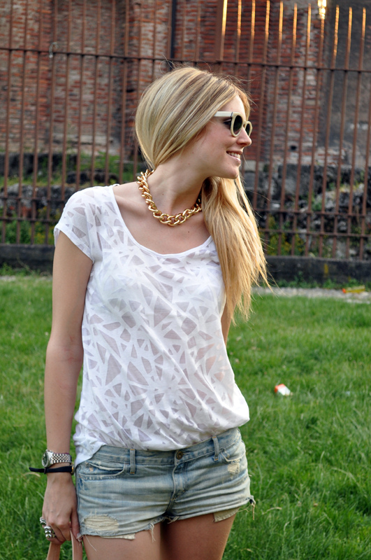 In questi giorni indosserei sempre shorts in denim: sono versatili, comodi e freschi, insomma perfetti per me. Questo è l’outfit che ho indossato ieri pomeriggio, in un tranquillo sabato. Le trasparenze mi hanno fatto innamorare da parecchio ed ora sto cercando di sperimentarle in maniera diversa, come su questa tshirt. Con me anche alcuni dei miei nuovi acquisti: la borsa/cartella di Su-shi, gli anelli di H&M di borchie (che però mi lasciano le dita blu :S ) e gli occhiali di Bob Sdrunk.