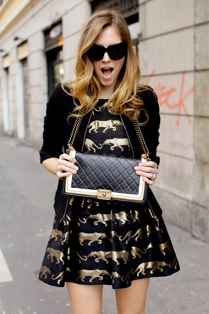 Metti insieme un vestito nero con ricami dorati di Minusey, la borsa Chanel dei tuoi sogni, delle decollete comode e sexy e dei maxi occhiali neri ed il gioco è fatto: come sentirsi una diva in cinque mosse.