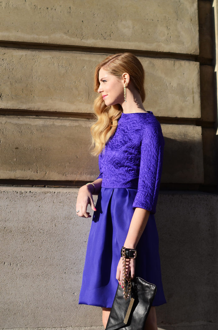 Dopo alcune indecisioni la mia scelta finale è stata quella che vedete in queste foto di backstage: abito viola, pumps fucsia, maxi orecchino e clutch Werelse for MANGO.