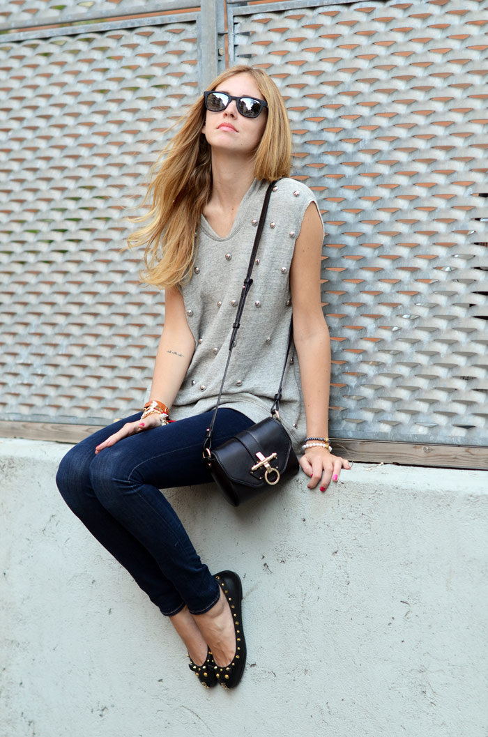 Talking about the look: I wore a 3.1 Phillip Lim studded top with Chiara Ferragni for Yamamay yellow bandeau bra underneath it, skinny jeans and mouse flats. Givenchy Obsedia bag is a new entry in my wardrobe, and it comes from an exchange with one of my best friends, Vero.
