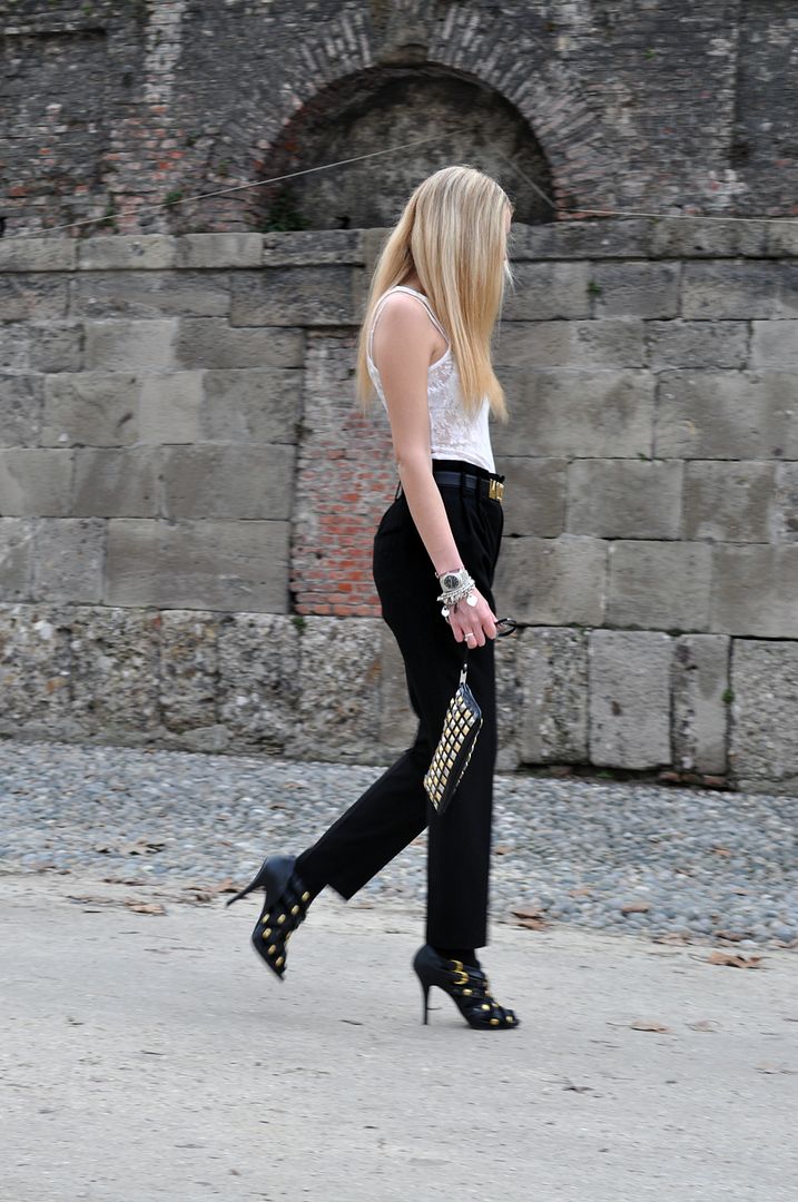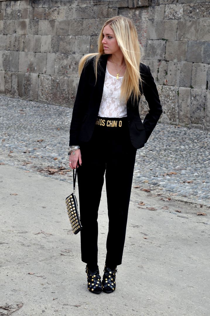Questo è uno dei miei outfits preferiti.Molto particolare e maschile, ma arricchito con qualche punta dorata qua e la. I pantaloni sono stati un regalo azzeccatissimo di Richie, era da tempo che ne cercavo un paio largo a vita alta cosi e questi mi fanno impazzire. Oggi è uscito il giornale “Gioia” con un articolo dedicato ai fashion bloggers, tra cui hanno inserito anche me, seppure l’articolo sia molto banale e tutti i links siano scritti in modo erroneo (si può sbagliare una cosa del genere?). Sono sempre più convinta che i giornali siano realmente impauriti dal fenomeno sempre più dilagante dei fashion blogs e secondo me troppo spesso, specialmente in italia, c’e’ una forte competizione tra il mondo internet e quello editoriale, mentre la cosa più saggia sarebbe coordinare due degli aspetti della moda in varie collaborazioni. In ogni caso questa è la prima uscita sui giornali grazie al mio blog, ed comparire tra Jane Aldridge e Garance Doré non può che farmi piacere 🙂