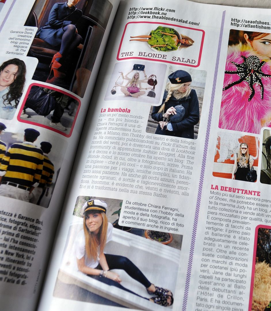 Today the italian magazine “Gioia” came out with an article dedicated to the fashion bloggers, in which they also included my blog, even If the article is really banal and all the links are written in a wrong way (can you make mistakes about this?). I’m sure magazines are so afraid of the fashion blogs phenomen and too many times, especially in Italy, there is a strong competition between the web world and the press system, while the wisest thing to do would be coordinating two of the sides of fashion in some collaborations. Anyway this is my first time on a magazine thanks to my blog, and standing out between Jane Aldridge and Garance Doré is such a pleasure 🙂