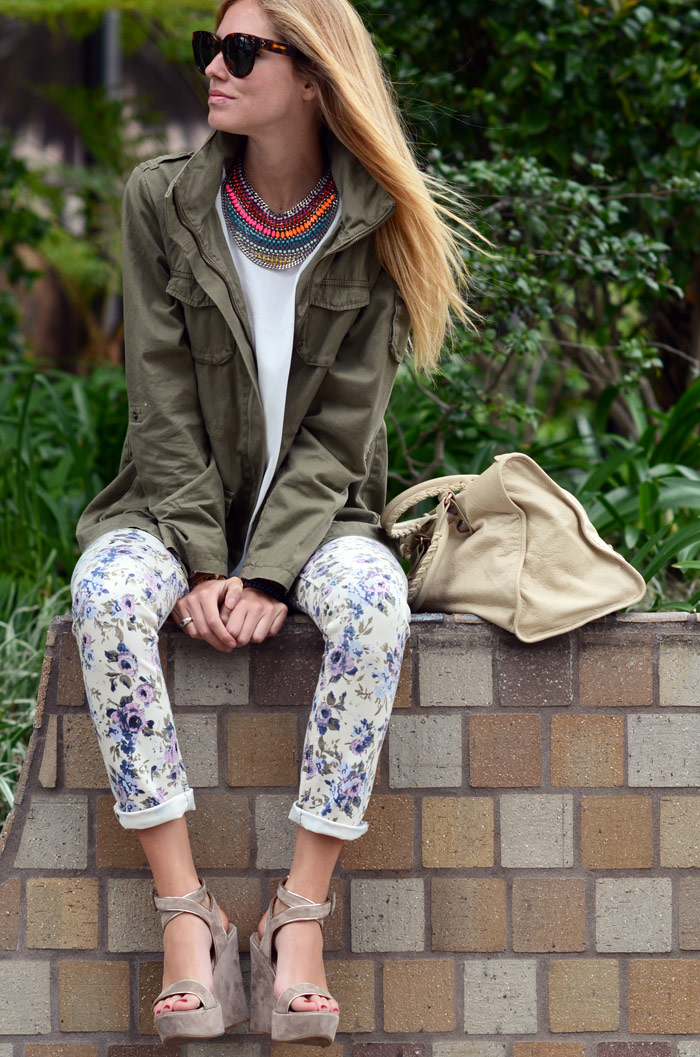 Siamo arrivati a Los Angeles lunedi pomeriggio e, inaspettatamente, il primo giorno abbiamo trovato temperature più fredde del previsto: ne ho approfittato per indossare i nuovi jeans floreali DL1961 con le zeppe crema della mia linea di scarpe , parka e gioielli Dannijo.