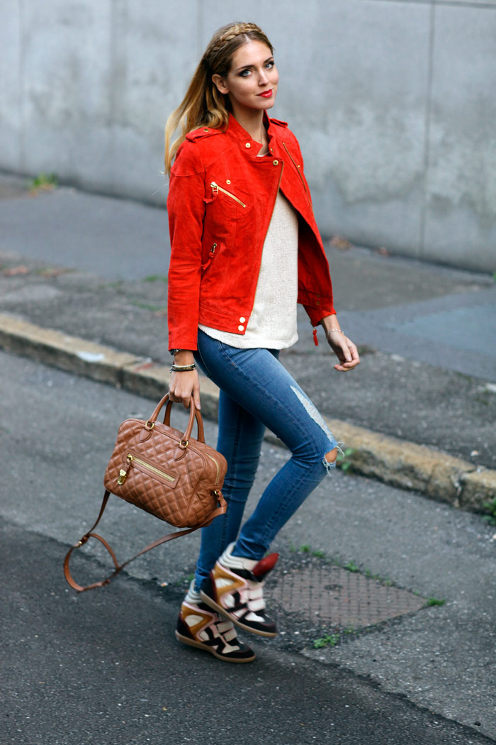 Today I’m still in Paris for a Louis Vuitton project, from Friday I will be in Russia and then off to Brazil.. This is the reason why I love wearing more casual clothes in Milan: my favourite skinny jeans, Isabel Marant sneakers at my feet, suede red jacket and the new Marc Jacobs bag ordered on Monnier Frères, comfortable and with the perfect shape 🙂