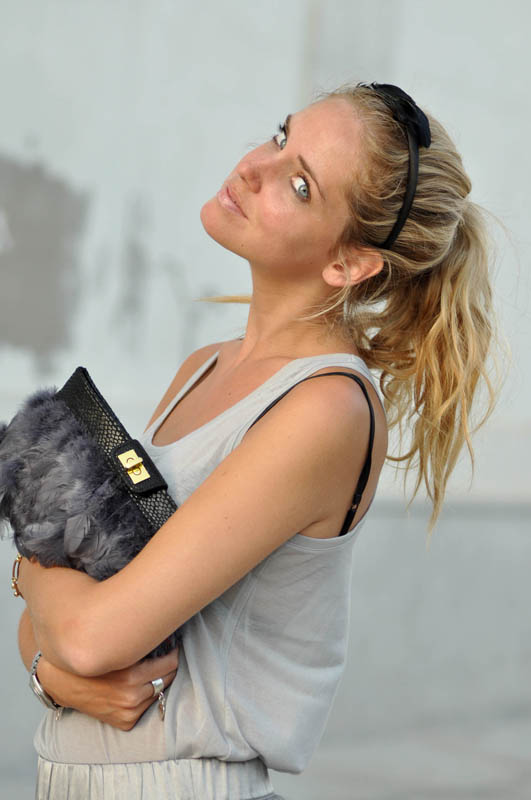 I bought this ballerina skirt last year and I’ve always wornt it with a black top and black flats, a bit boring. The other day I wanted to play with the different shades of grey, creating this outfit with some of my new online purchases, among them the perfect heels which go so well with all the colours and my feathers clutch, that i also got in a pale pink colour. As a top I finally wore this grey almost-transparent tanktop with a visible black lace bra, and I enriched my ponytail with a feathers headband bought last April in New York. My latest must-have are all here: I’m falling in love with clutches and I bought some amazing ones last week that you’ll see in these days (i brought 3 of them on holiday with me) and I’d wear anything (ok, not anything but almost) with feathers on. I’m even thinking about ordering a skirt entirely made of pale pink feathers, do you think it’s too much? 😀