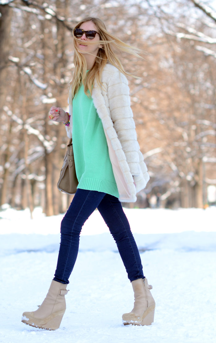 Foto nel parco innevato con il maglione color menta di Acne: fatto!