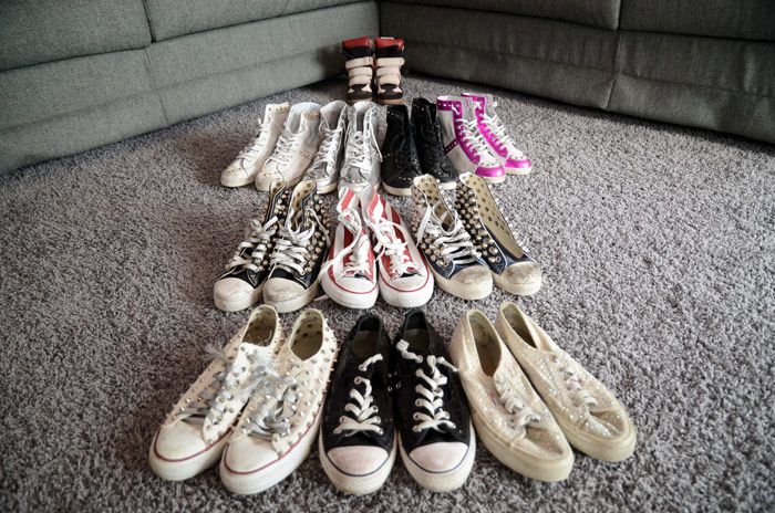 Le mie storiche Superga con swarovski, Converse nere con paillettes, Converse alte con la bandiera americana e Converse con borchie applicate.
