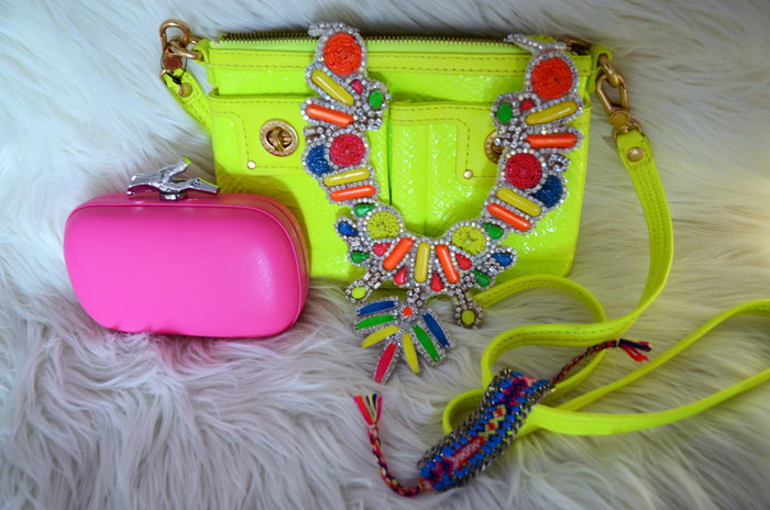 Pare che il neon sia tra le mie tonalità preferite della stagione: ho recentemente ricevuto da Shopbop una clutch di Diane Von Furstenberg fucsia (simile a quella leopardata dell’estate scorsa), un bracciale di Dannijo ed una borsa di Marc by Marc Jacobs, che ho fotografato insieme alla collana di Doloris Petunia.