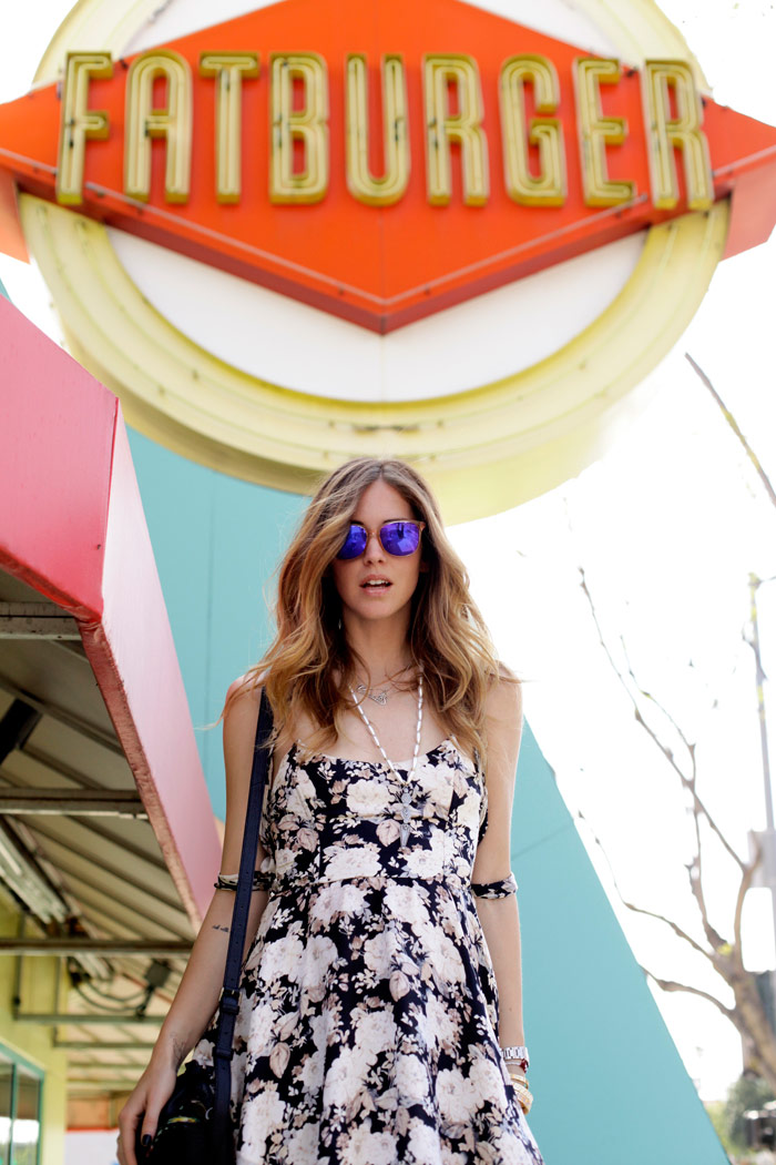 Ecco un altro dei cliché americani che tanto amo: venerdi scorso, guidando sulla Santa Monica Blvd e passando di fianco ad un vecchio ristorante Fatburger non ho potuto fare a meno di fermarmi, provare uno dei loro famosi hamburger e naturalmente scattare qualche foto di outfit. Indossavo un nuovo vestito floreale, occhiali a specchio ed i miei bracciali Sal Y Limon