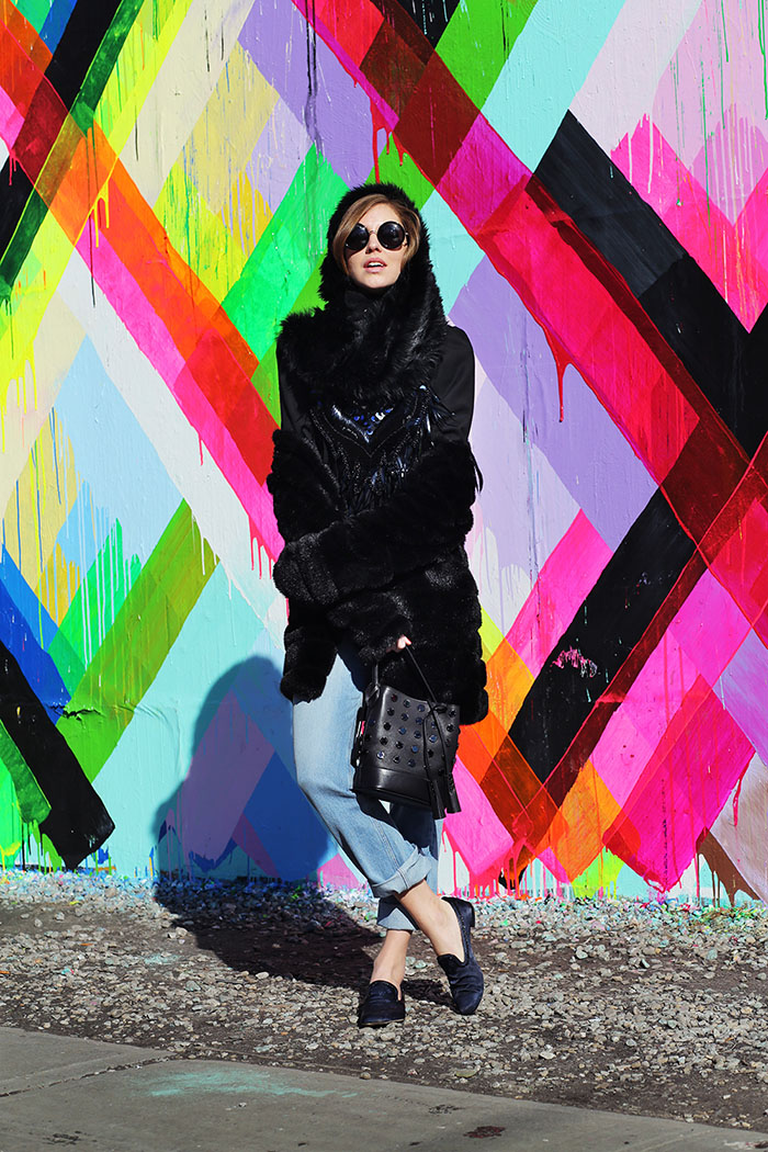 And while I’m walking from one show to the next one in Milano here is another one of the looks shot in New York.. I was wearing a total black look with boyfriend jeans from the Louis Vuitton s/s 2014 collection and I couldn’t opt for a more colourful location than the wall on Bowery 🙂