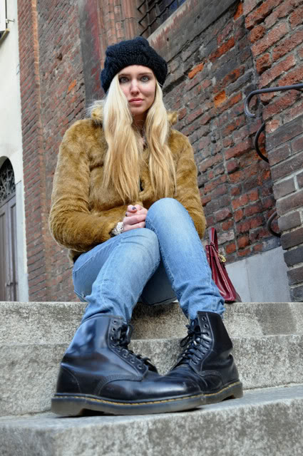 Even if these days are dedicated to a crazy and desperate studying I managed to take some photos yesterday afternoon, taking advantage of the sun that, once in a while, was brightening the atmosphere. I got my first exam of the semester in a few days (I study law and I’m at the 4th year, for those who asked me) so you’ll excuse me if I’ll post less than usual, the studying takes most of my time. For yesterday outfit I was able to wear the fur coat (faux) that I bought weeks ago, matching it with my old Dr.Martens and my adorable vintage Kelly bag that I love even if it should be fixed in some parts. I’m not completely used to fur coats, in some ways I was feeling like a little gorilla (you can see that in picture 3 😀 ) and I’d really like to find a similar one in black, but unfortunately right now I really have no time to go shopping. Yesterday night I anyway went to eat sushi and to the cinema with Richie and some friends: we went to see “Avatar” in 3d, that didn’t fascinate me a lot but then I found it really really nice. I recommend it 100%!