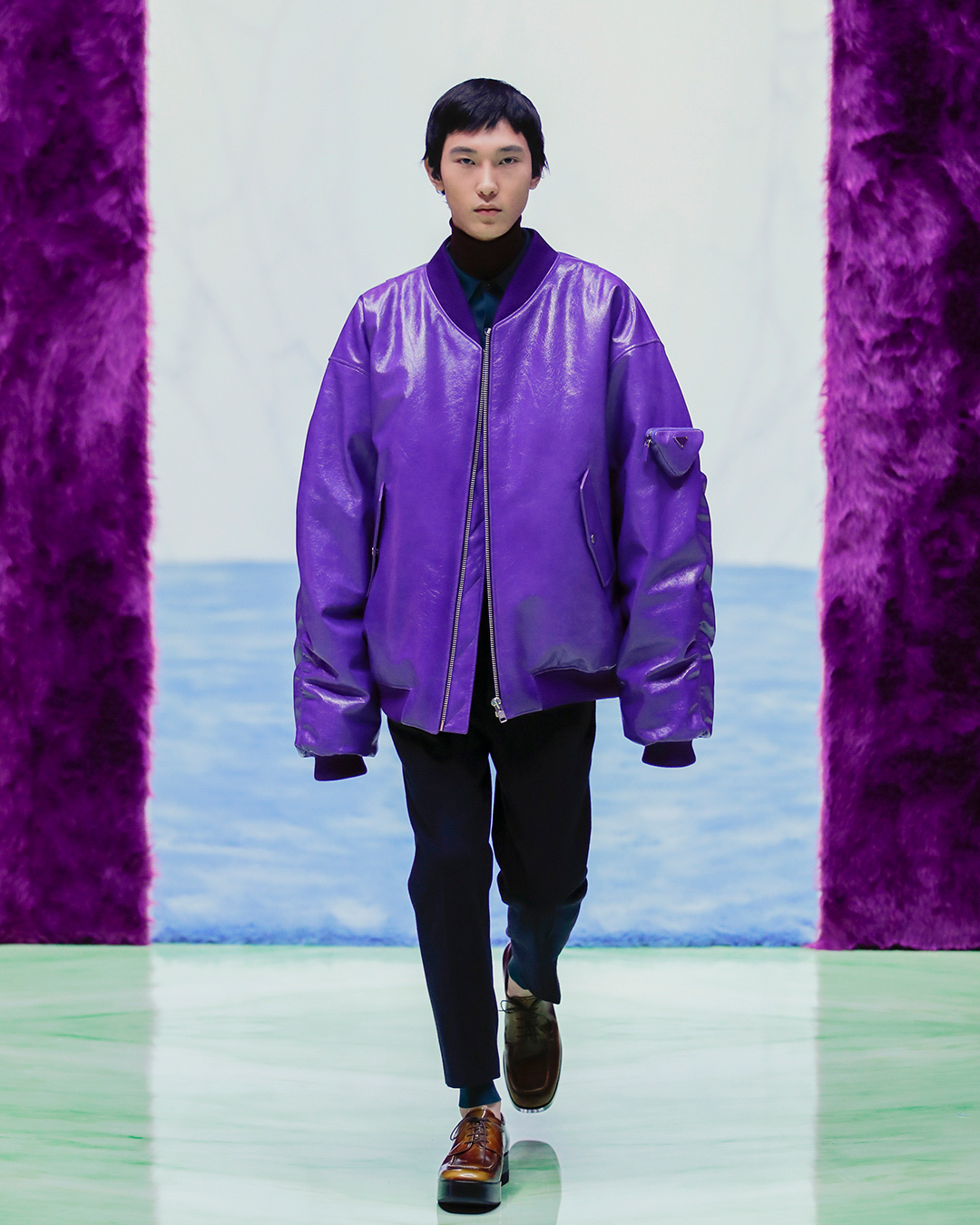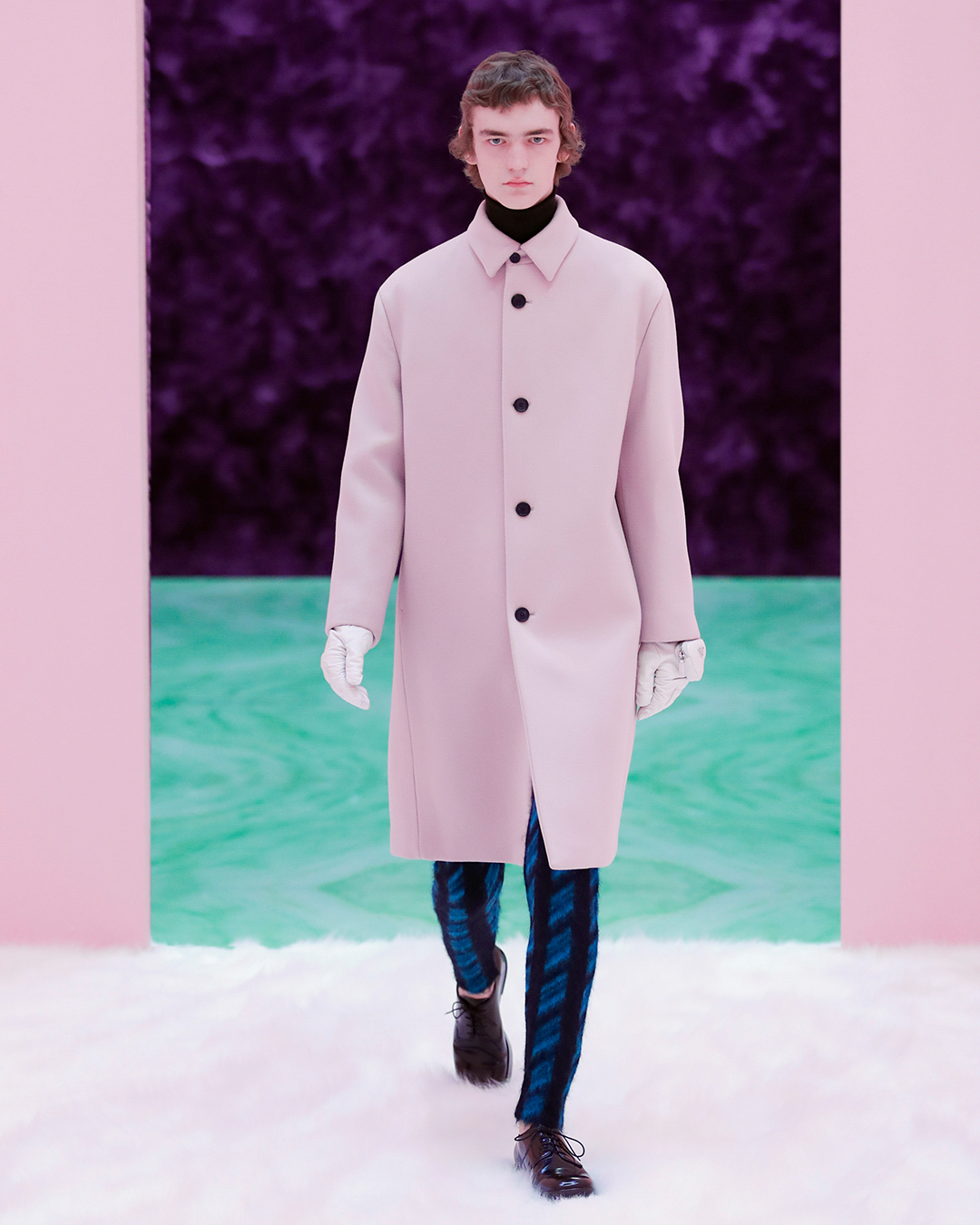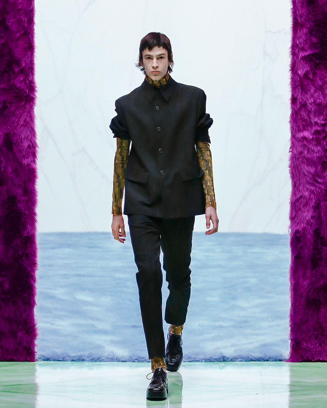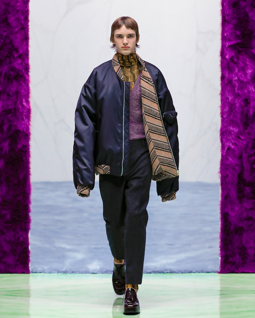 The looks play on overlaps: the pants are cozy but super enveloping, broken up by oversize sweaters overlaid with turtlenecks; and to close the bomber and blazer looks with rigorously oversized details. The digital show was unprecedented, in the wake of the latest Women’s SS 21 collection, but with new elements, such as the dancing interludes of the models that, to the rhythm of DJ Richie Hawtin‘s records, enhanced the “non-spaces” in marble and details faux fur designed by Rem Koolhaas and AMO. The Prada Menswear FW 21 collection also entered the hearts of the women present at the show, who have already spotted, as the supermodel Gigi Hadid confirmed, some items of the male wardrobe that are absolutely transversal and perfectly suited to the female universe.
