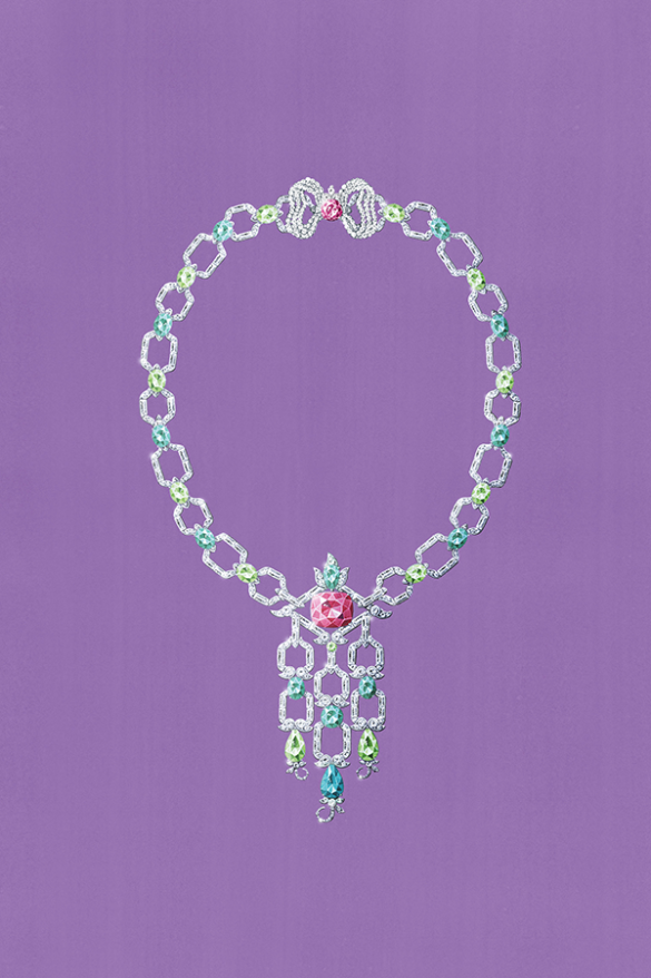 Then, the spring season reaches its peak during the summer, when the colors become even more pronounced and saturated. The new Allegoria jewelry collection represents precisely this explosion of colors, thanks to the predominant use of colored tourmalines, further embellished by diamonds. The jewelry features a mix of unique hues, stainless stones including yellow sapphire, pink tourmaline and tangerine garnet. Earrings, bracelets and majestic necklaces seem to take us back to a bygone era when jewelry and gems were cut by hand. En effet, some pieces in the collection exhibit a charming vintage feel, with delicate details that recall a time when jewelry was a handcrafted creation and a testament to timeless elegance.