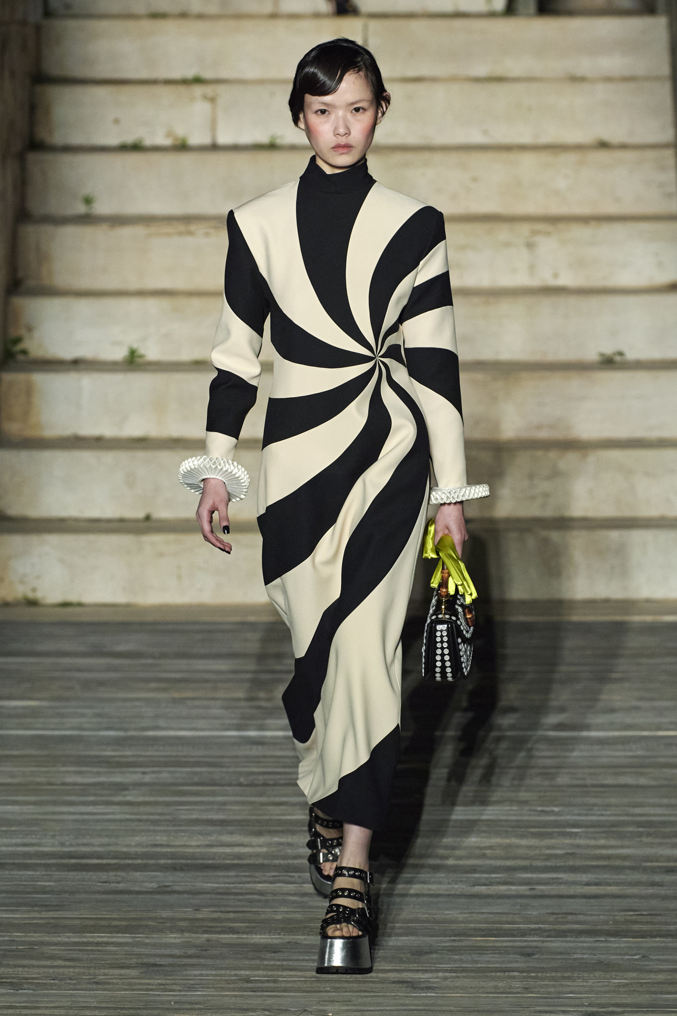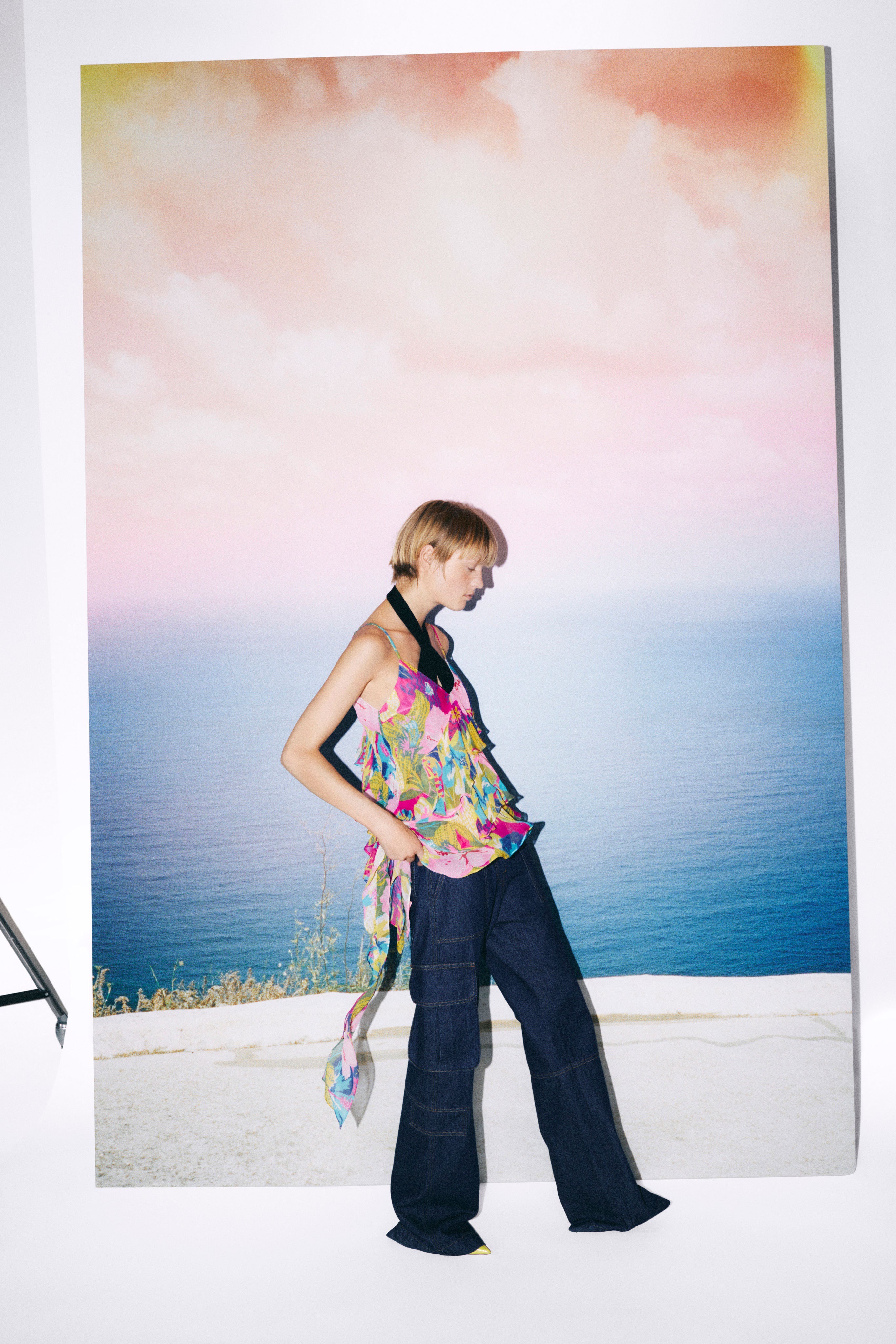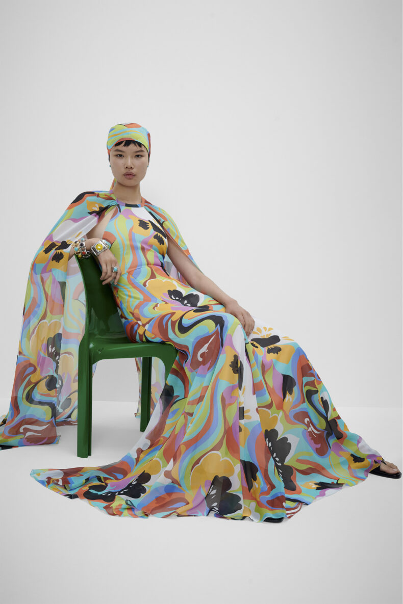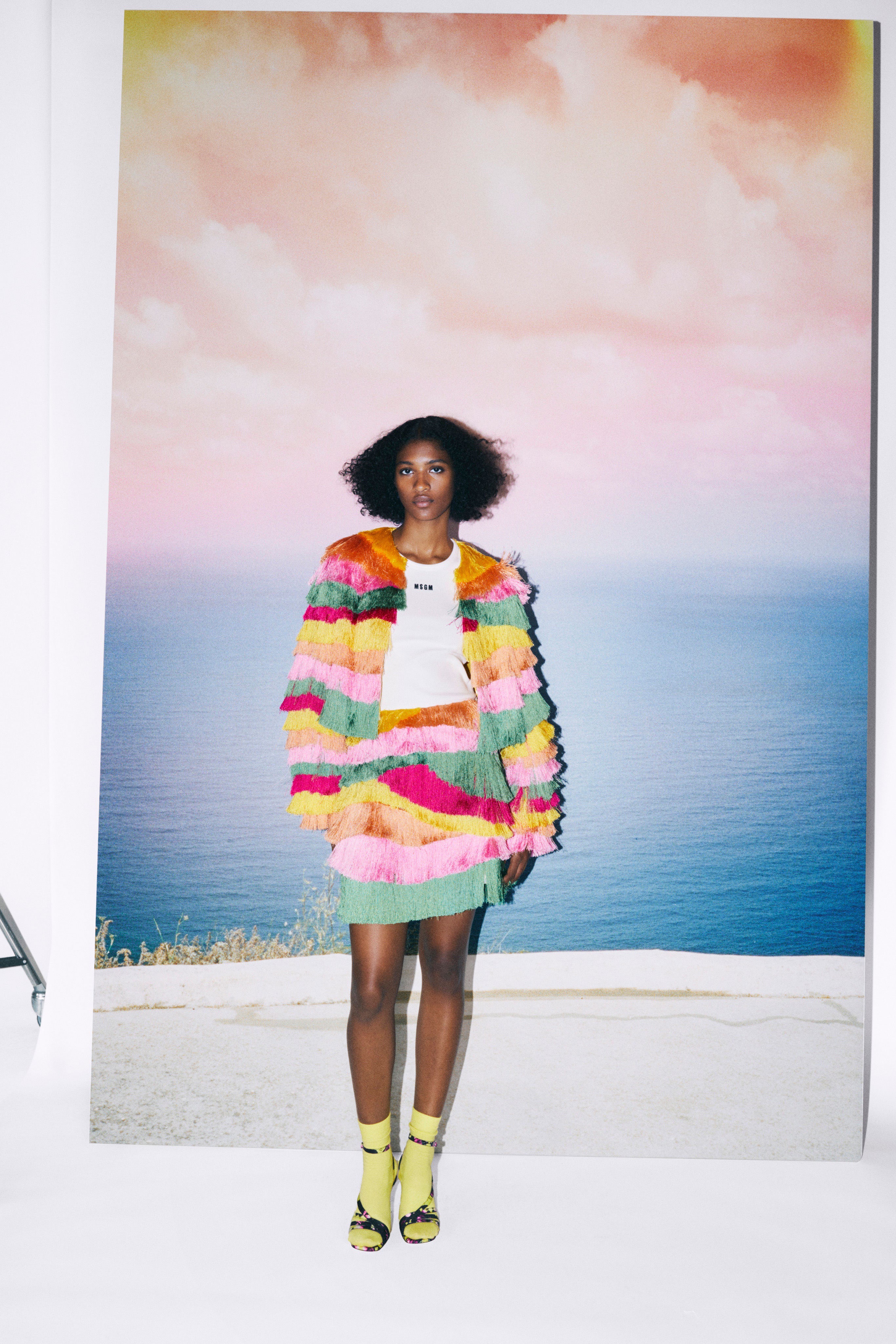 Massimo Giorgetti‘s collection for MSGM, amid shirts, tops, ruffles and chiffon, is a tale of psychedelic romanticism. Strong graphic elements, tropical prints, black, and a fashion that aims to make us feel good and have fun. A message of positivity linked to the art world and the archive. Giorgetti’s influences for his 2023 resort include the work of Irish artist Yuri Pattinson.