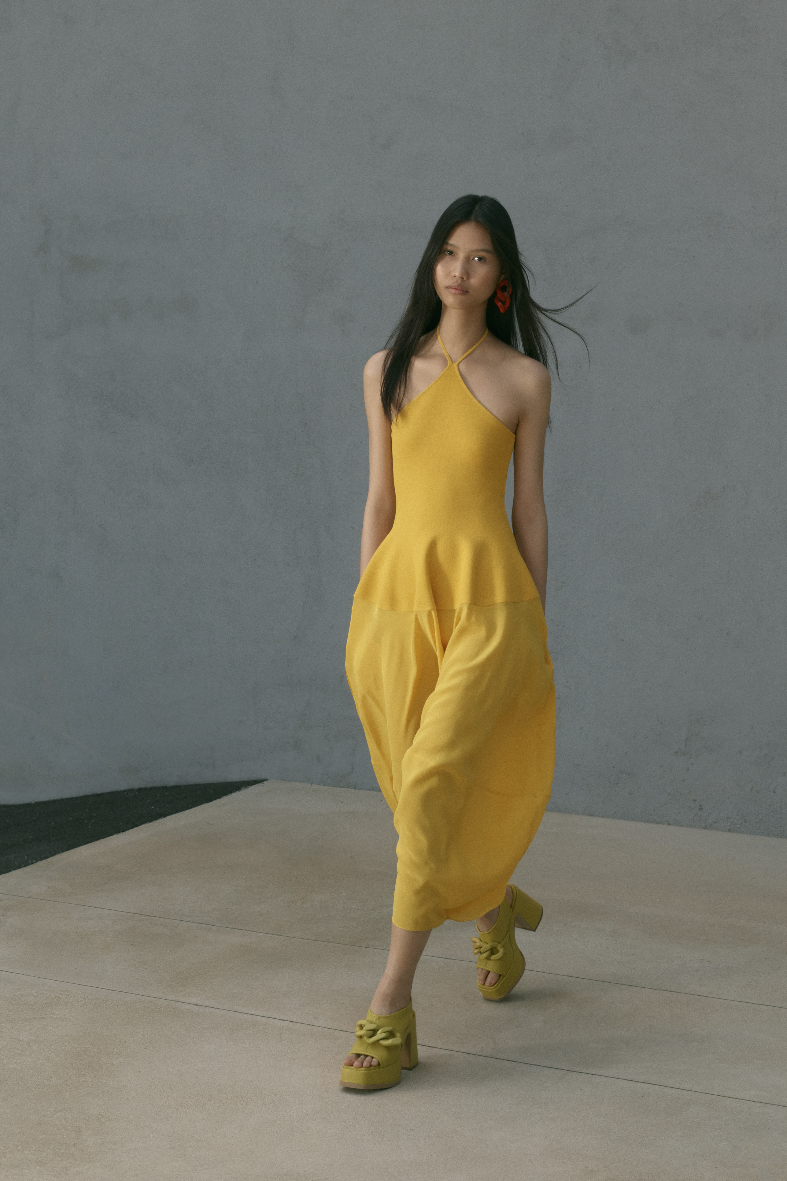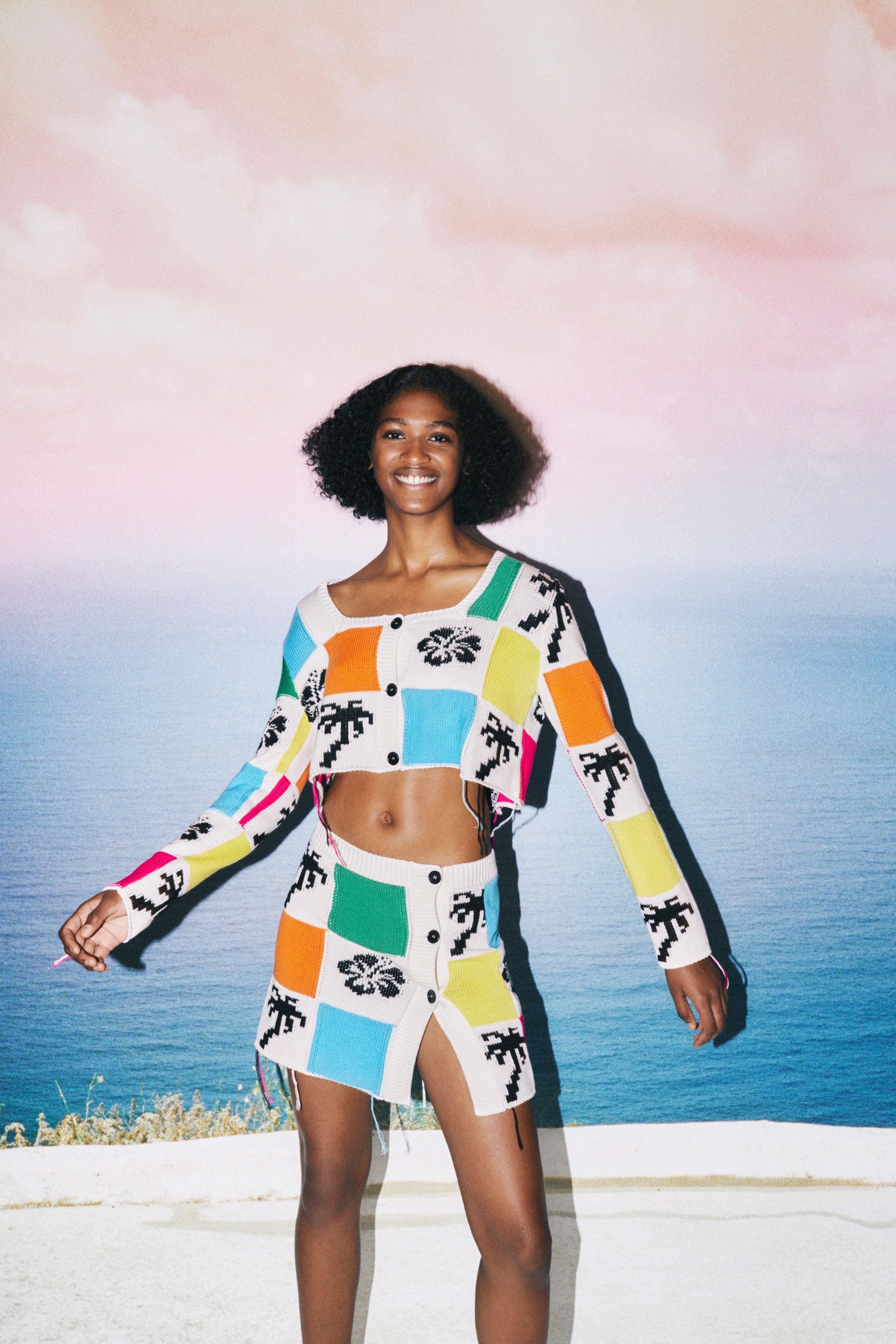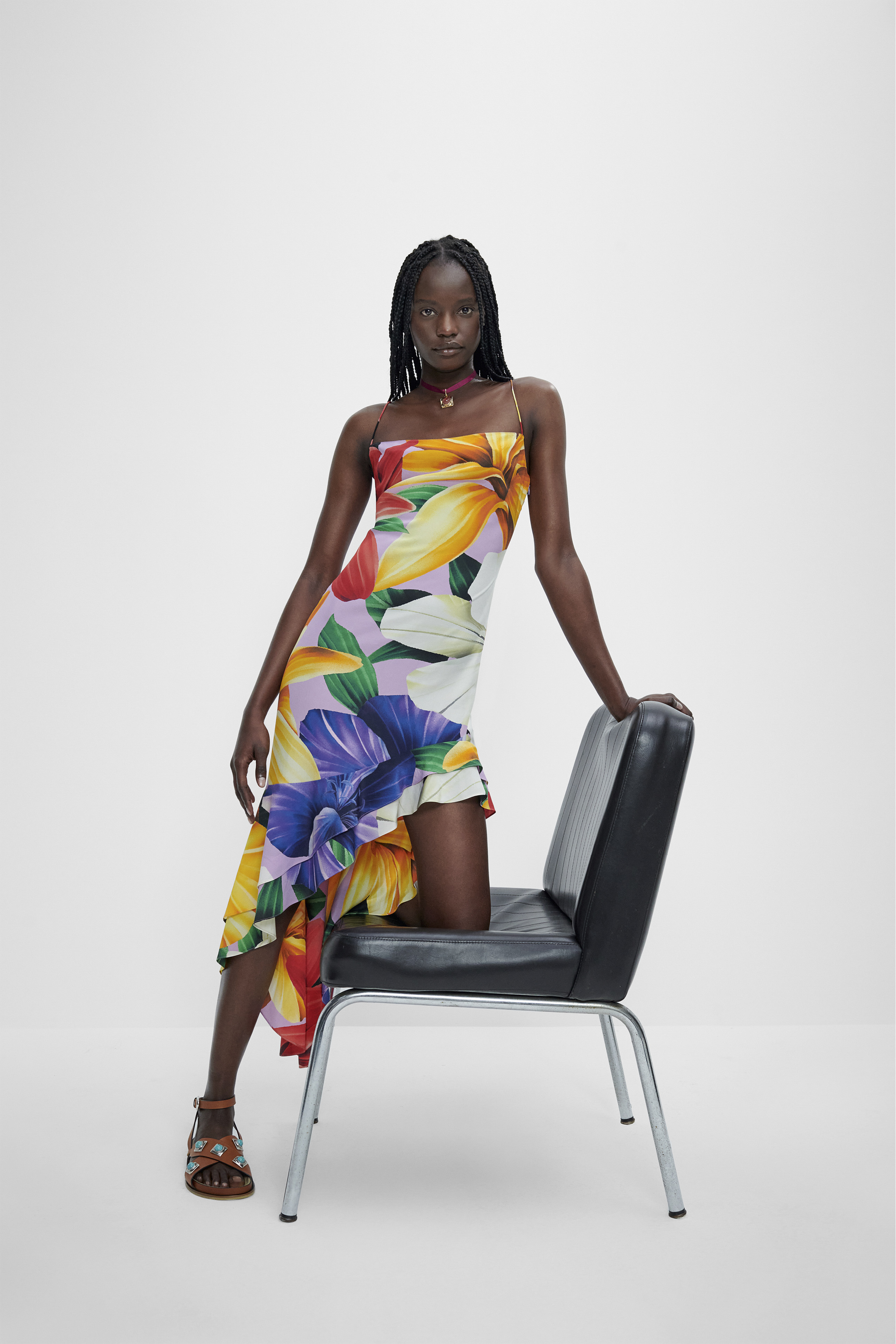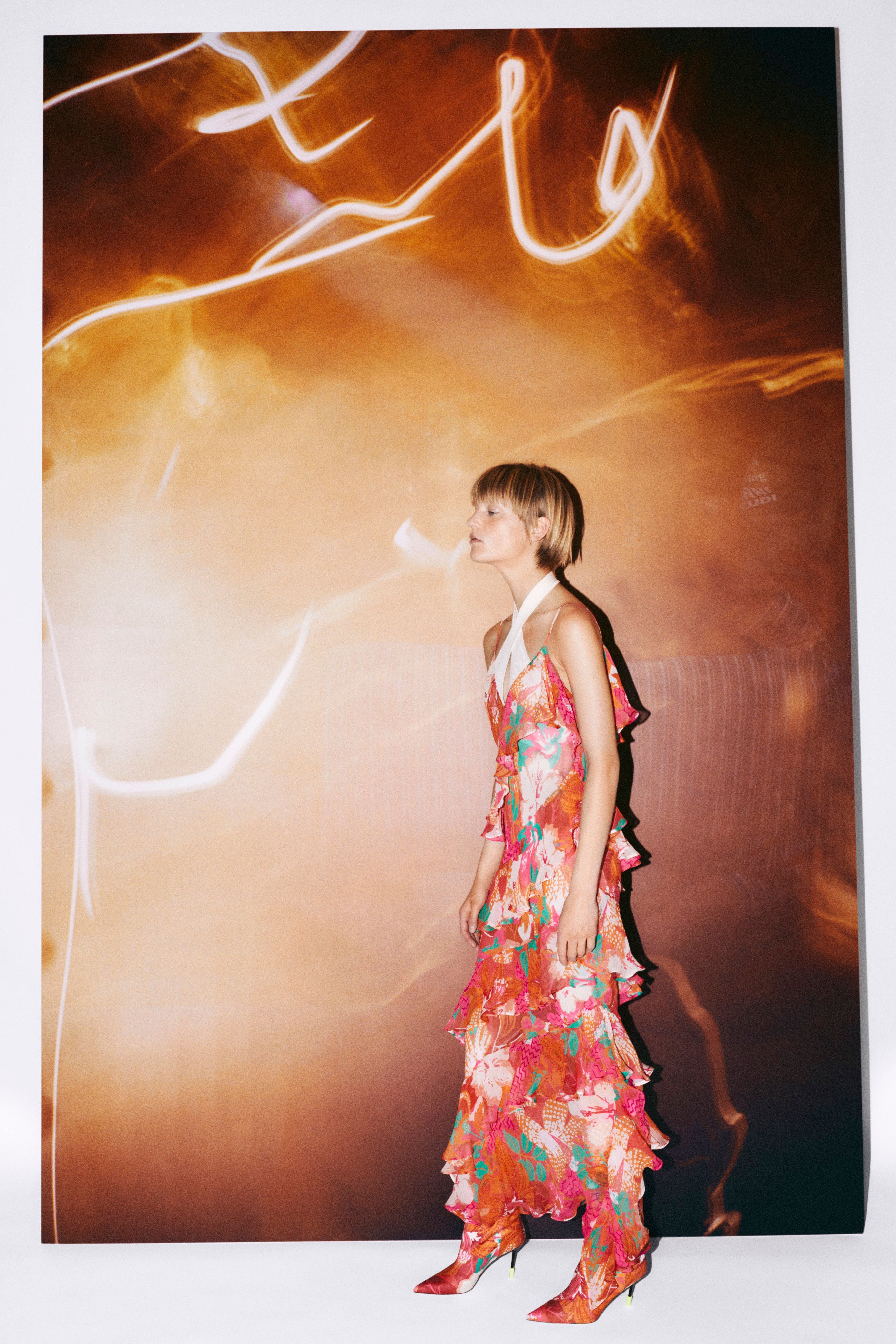 Massimo Giorgetti‘s collection for MSGM, amid shirts, tops, ruffles and chiffon, is a tale of psychedelic romanticism. Strong graphic elements, tropical prints, black, and a fashion that aims to make us feel good and have fun. A message of positivity linked to the art world and the archive. Giorgetti’s influences for his 2023 resort include the work of Irish artist Yuri Pattinson.