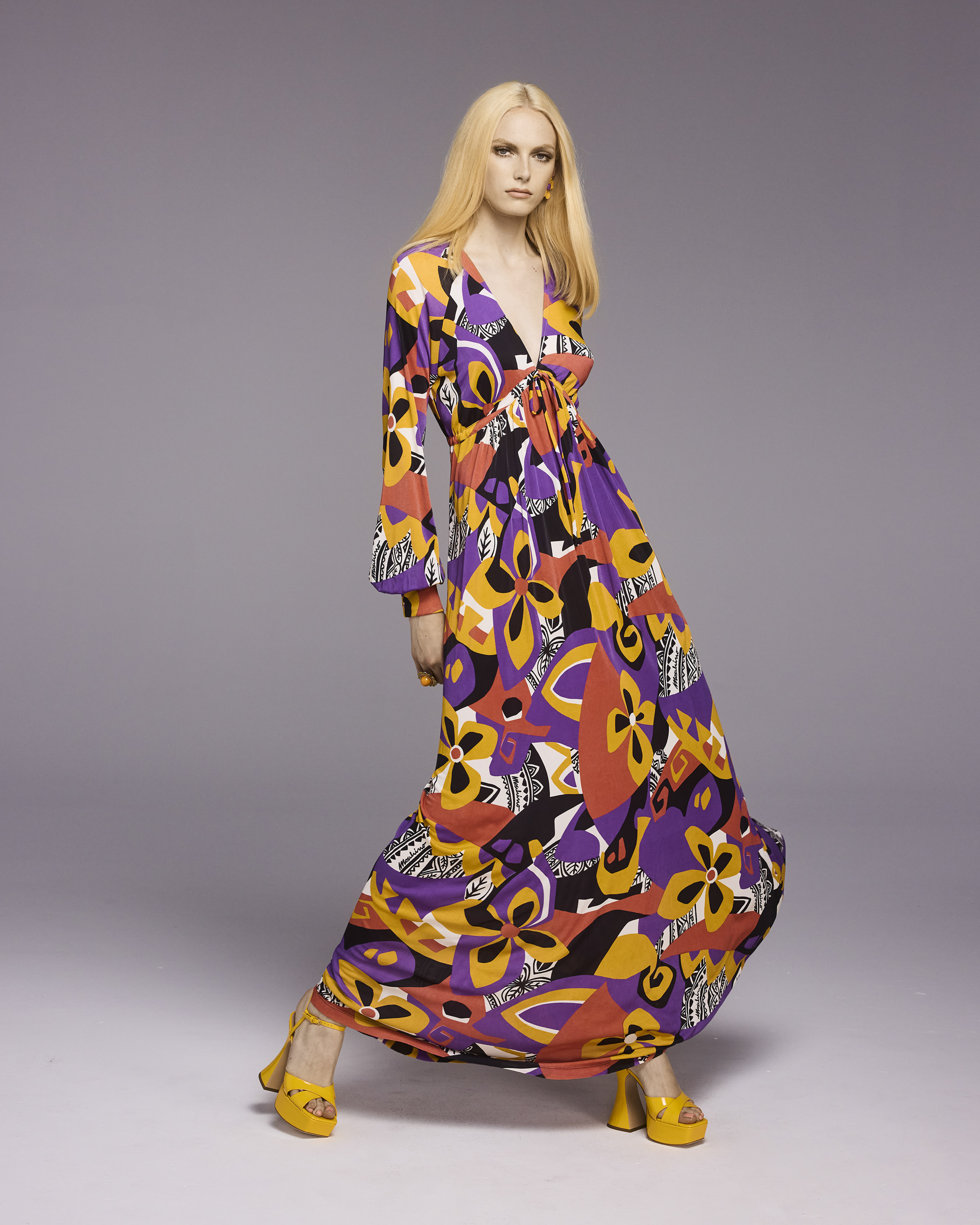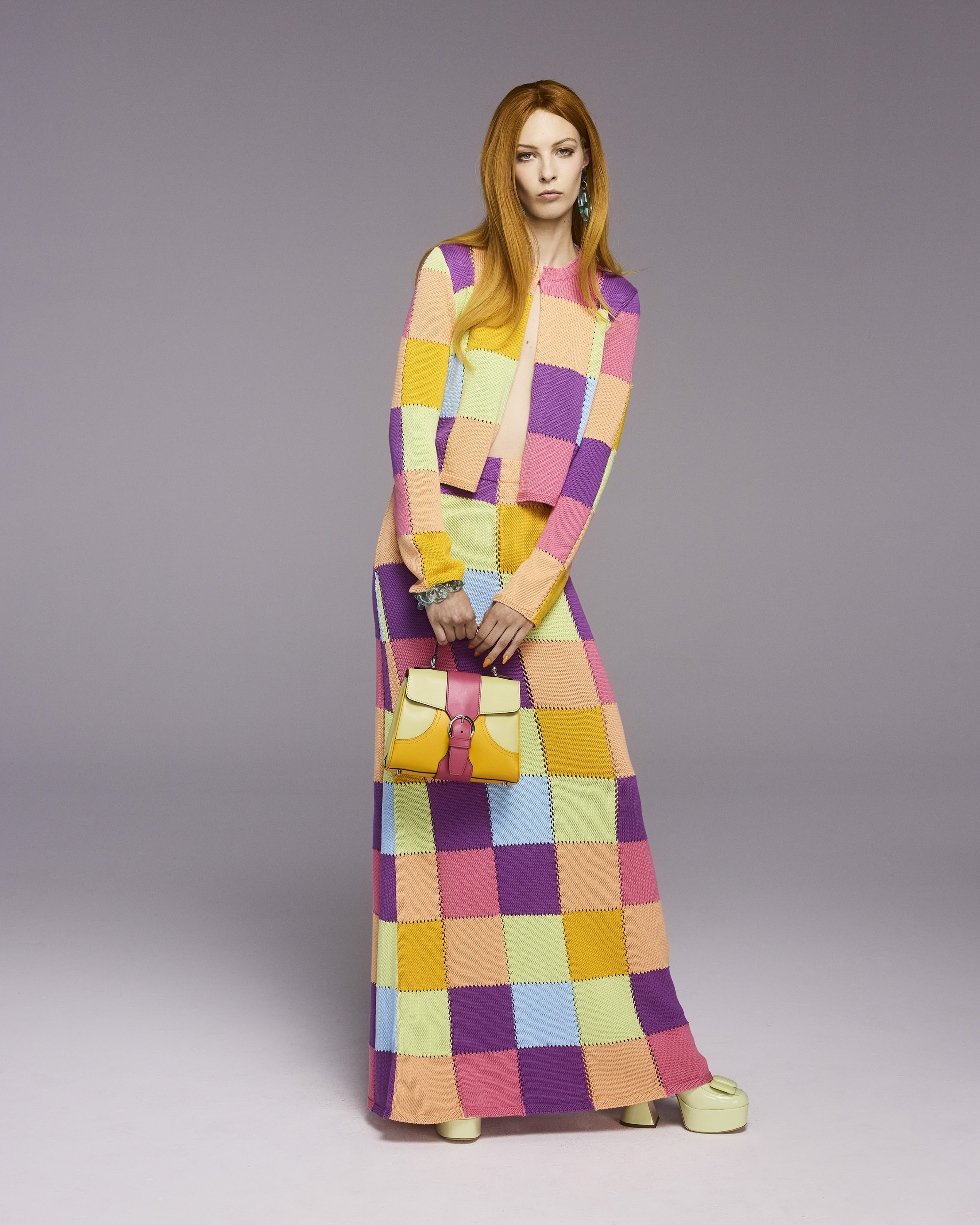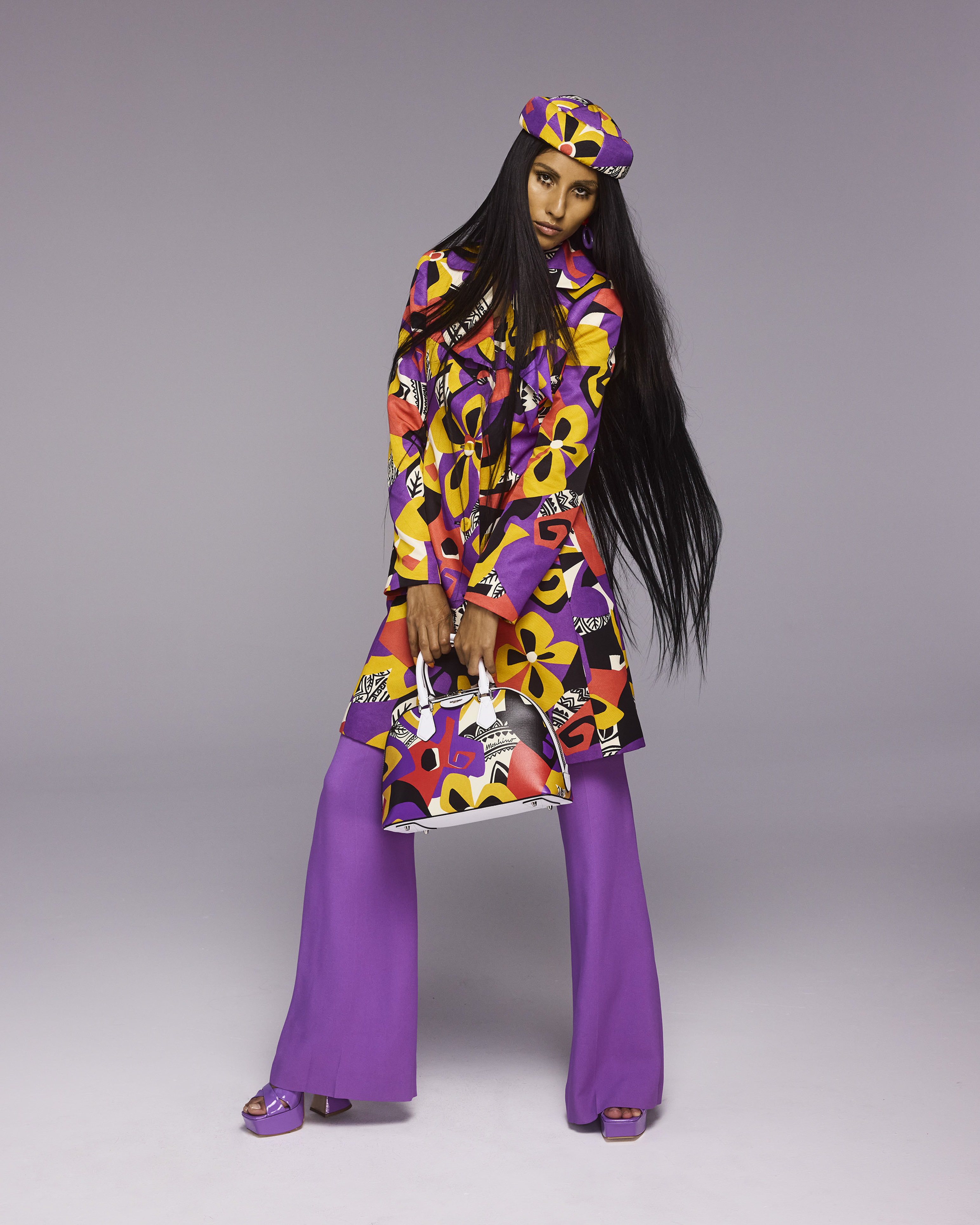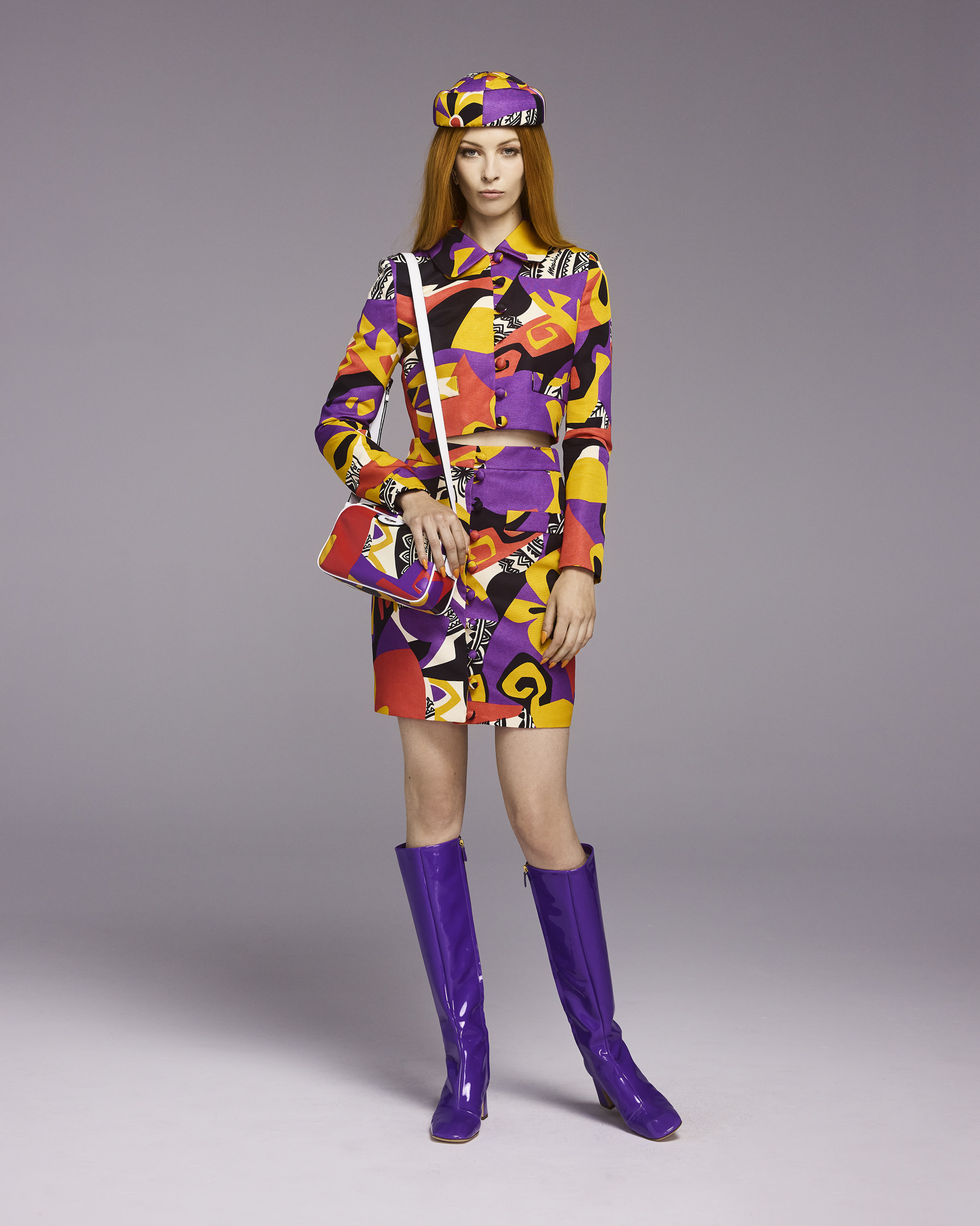 Designer Jeremy Scott transports us on his journey through the 1960s and 1970s, in a unique imagery that reminds us of stars of the calibre of Cher and Diana Ross. The inspiration comes from that precise moment in history when celebrities with a mock casual air walked out of airports wearing brightly coloured suits, boots, mini and long dresses often embellished with the famous collars that were symbols of that era.