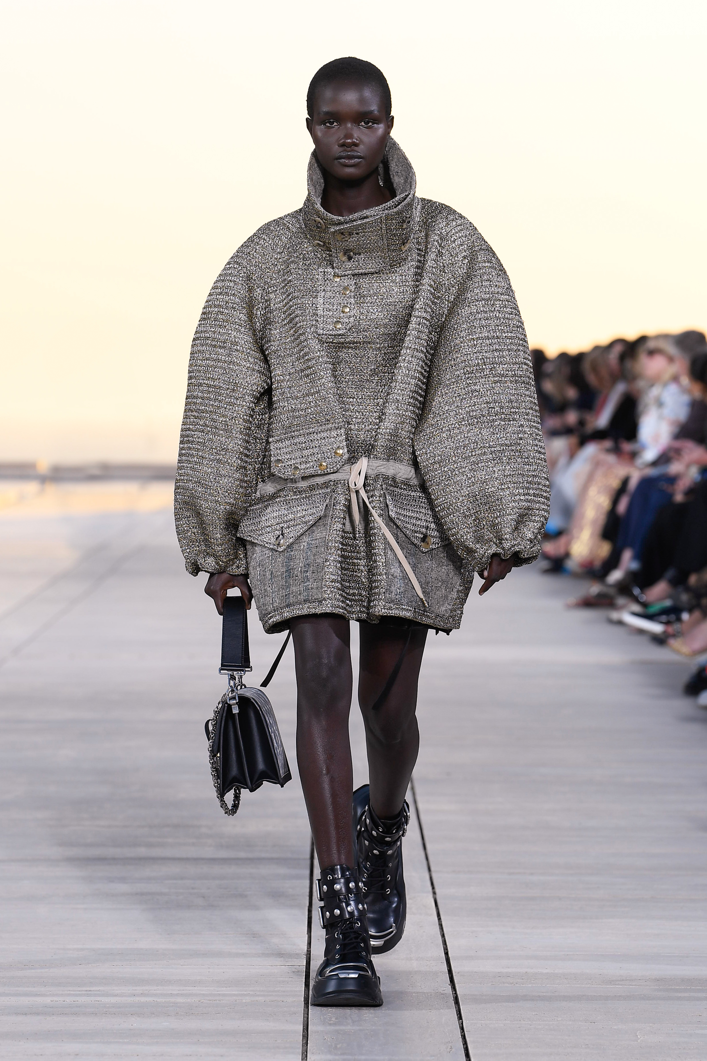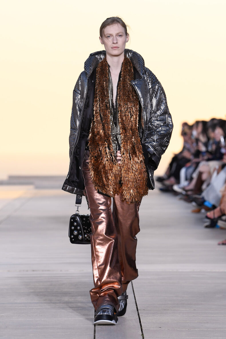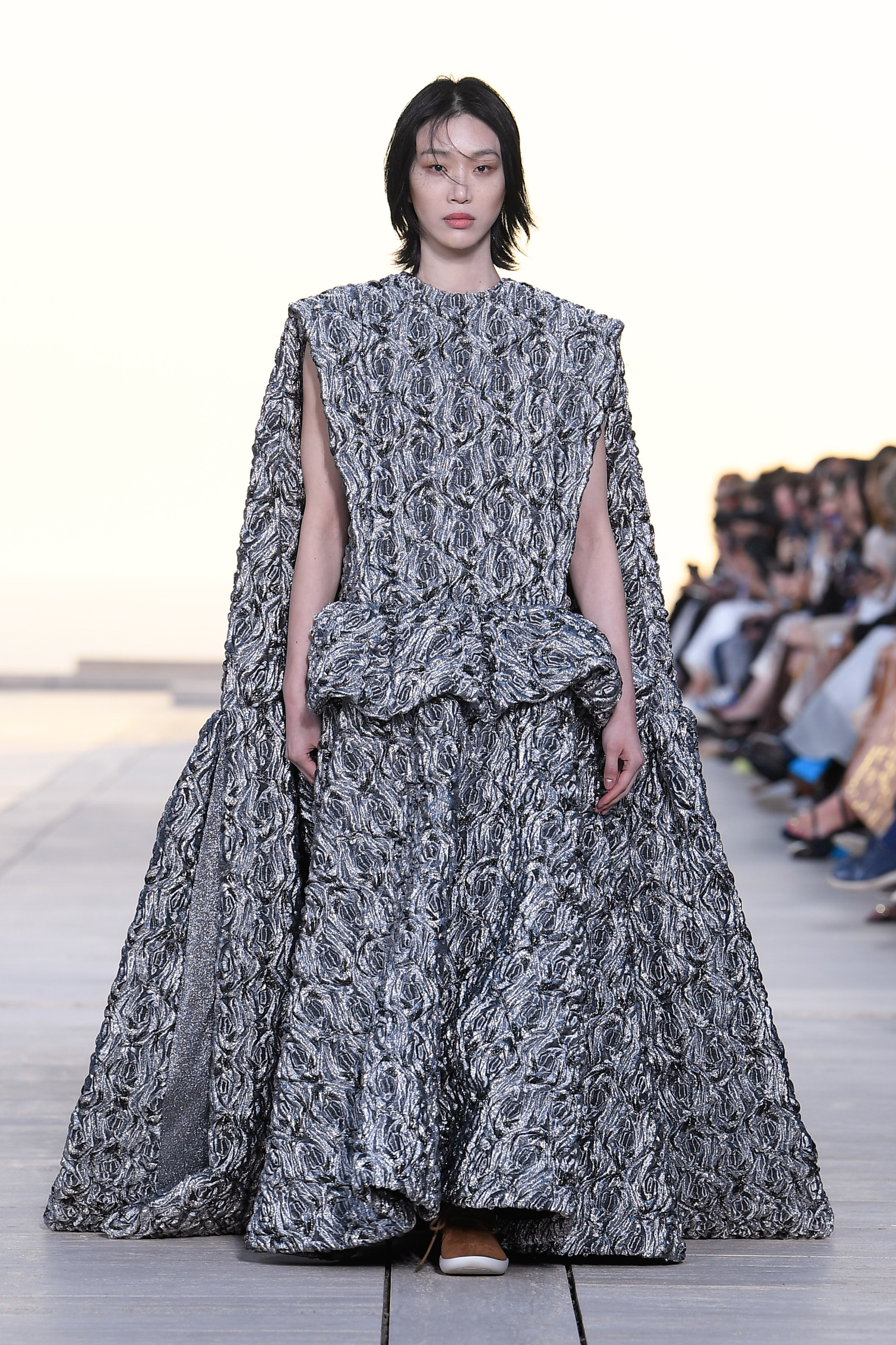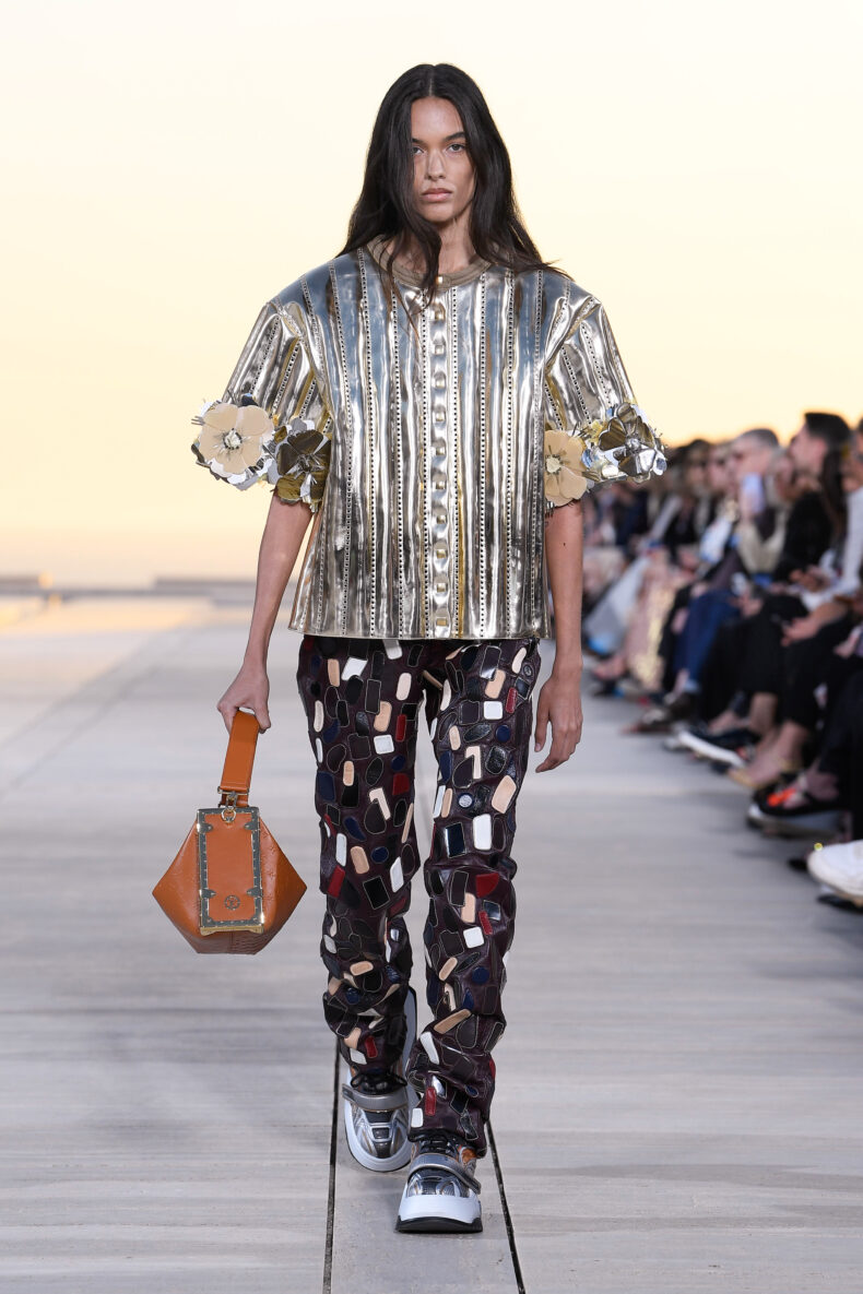 The fil rouge of Louis Vuitton’s 2023 resort collection is the sun, the California sun. In San Diego, Nicolas Ghesquière presented a selection of daring looks. From boleros, a parachute seems to open in flight, metallic textures, unusual geometries and overlays, crystal fringes. This collection is a clear representation of oxymoron, even in the choice of location. Not surprisingly, Louis Khan’s architectural Brutalism is even more emphasised by the Pacific Ocean at sunset. In fact, even the clothes/clothing present strong contrasts, both in fabrics and colours.