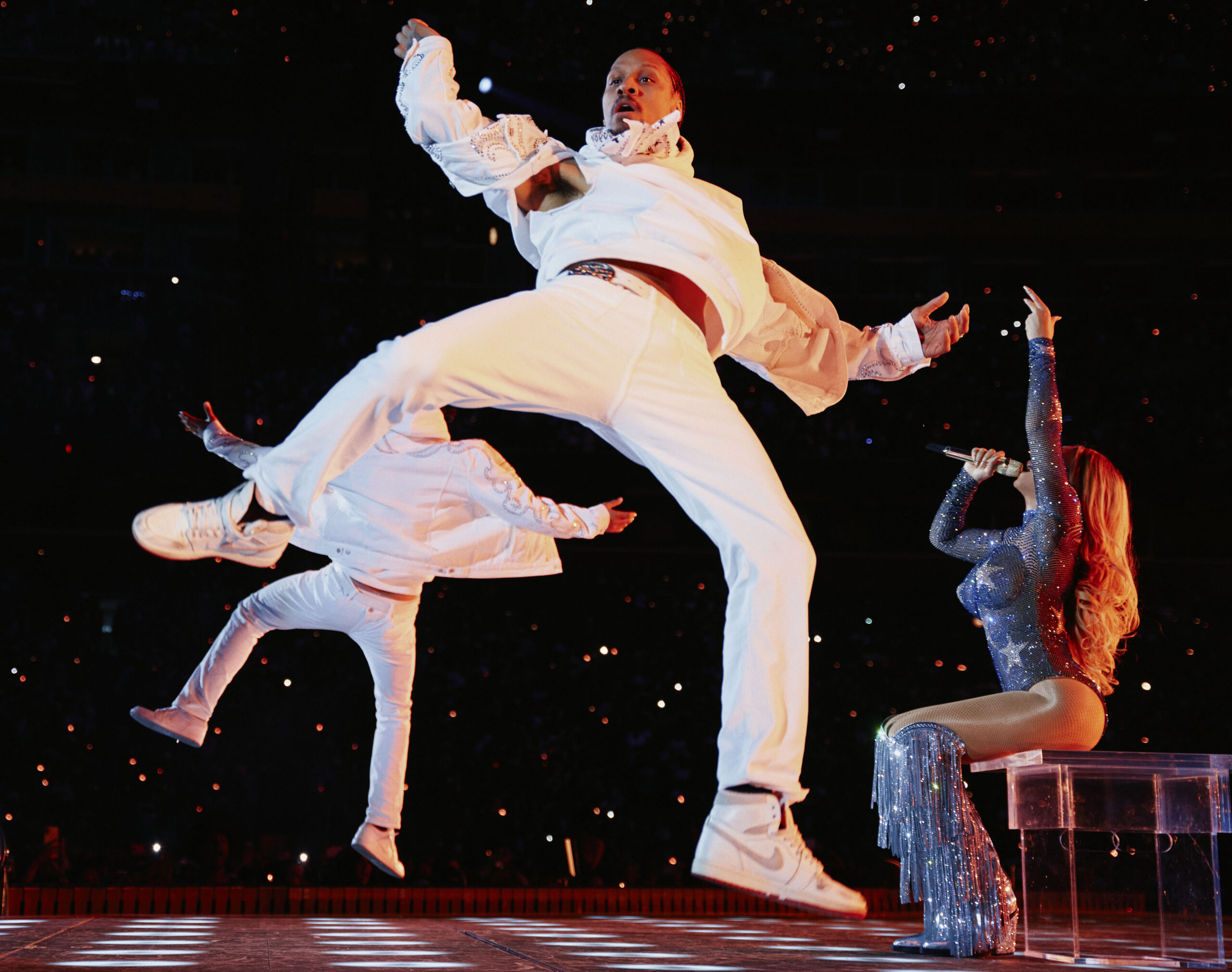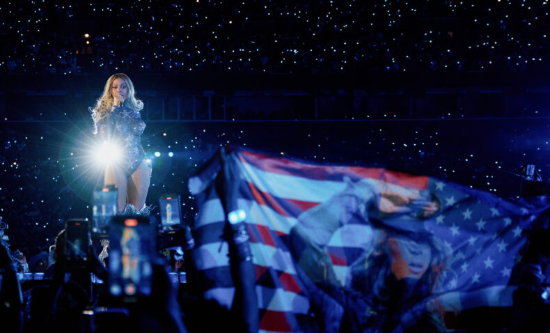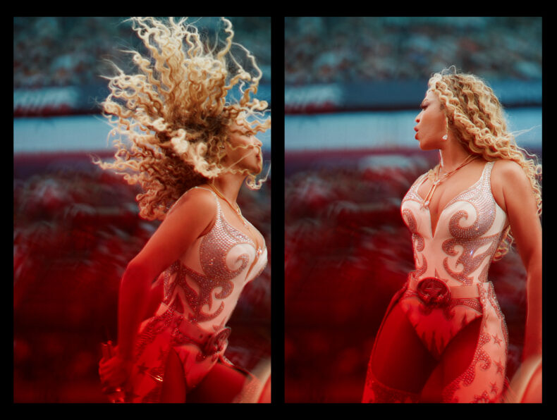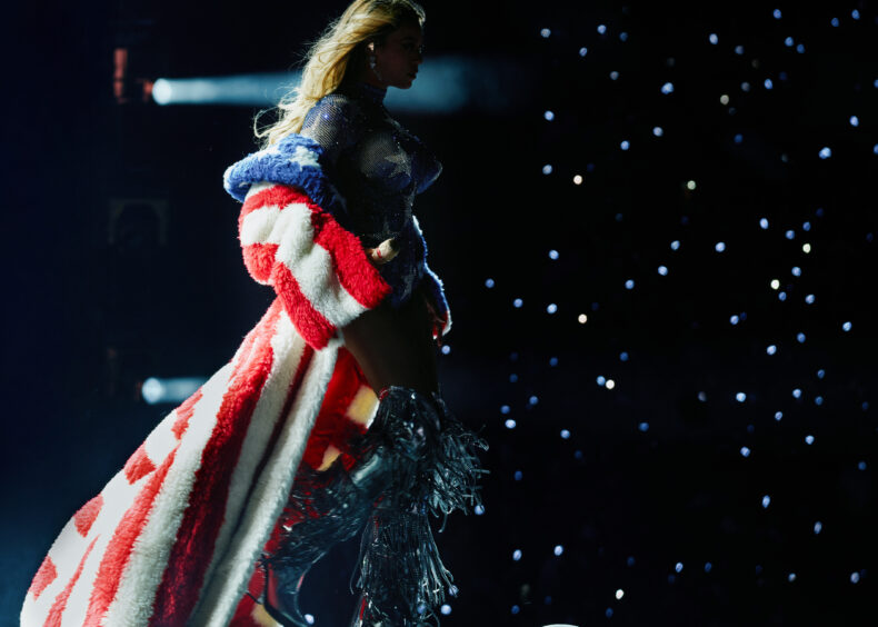 There are patriotic flourishes too: rhinestone-covered red, white and blue outfits, and a Levi’s collaboration crafted from upcycled denim, complete with patchwork cape and crystal-studded hat. These aren’t just costumes — they’re cultural commentary, reframing American identity through a Black, feminine lens.