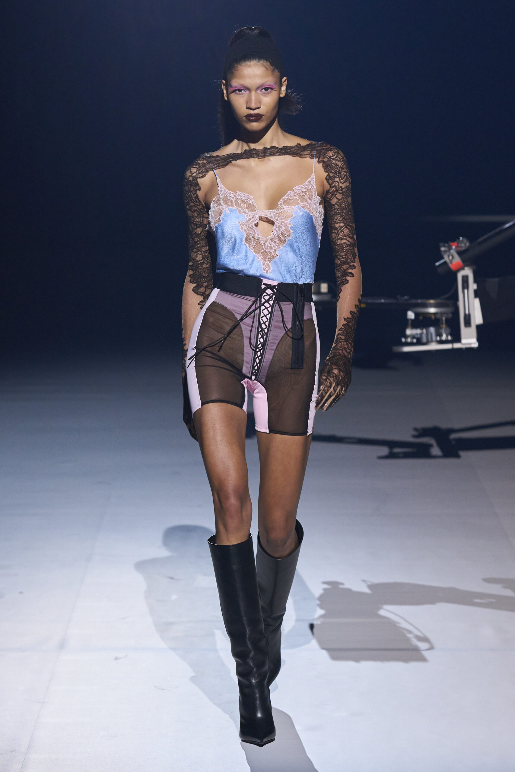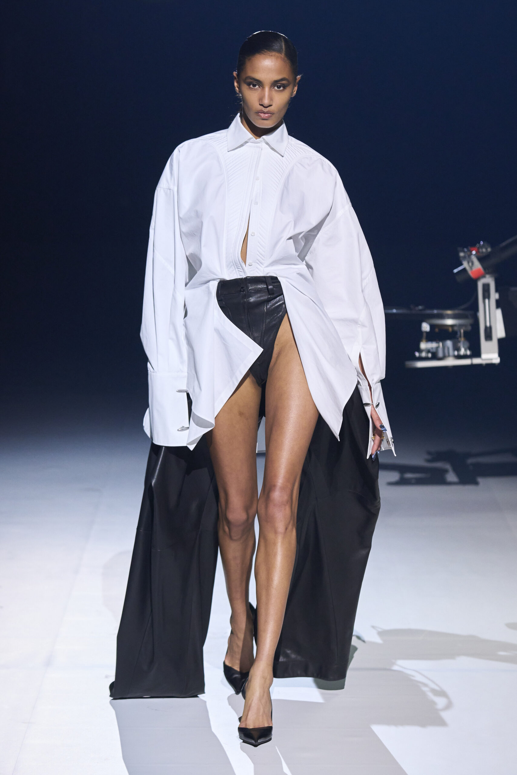 During this fashion show, the creative director took the opportunity to present his first bag for Mugler, its name is Spiral Curve 01. This leather and sculpturally shaped bag could certainly rival the iconic models of a few decades ago. Among the most visually striking garments, we could not fail to notice those made of lace, then plenty of room for denim, cotton poplin, corseted shorts, cuts and various applications of different fabrics.