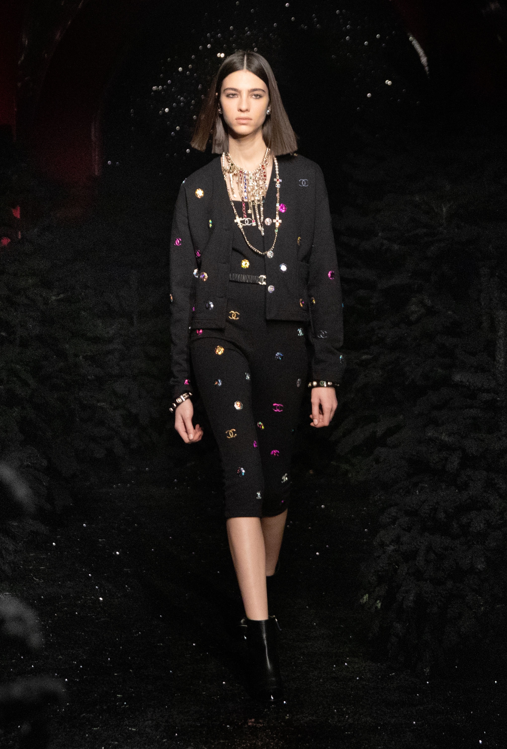 Contrasts are the protagonists not only of the mood of the entire short film but of the collection itself, which mixes volumes, materials and spirit. Tweed is a great protagonist of the collection, revisited in a more comfy and enveloping way, on oversized coats with a relaxed fit, or on coordinated suits embellished with lurex threads. The dresses all have spaghetti straps and sheer textures that reveal sophisticated bra and fitted bodices in lace and sequins. The big news of the collection are the quilted overalls-suits, reminiscent of snowwear, with red and blue motifs or in fuchsia tweed, worn with strappy sandals embellished with black chains and bows or décolleté adorned with a camellia. Blouses in chiffon or crêpe de Chine are combined with pieces inspired by winter sportswear, such as wide trousers with side pockets and tweed cropped jackets to be worn with faux fur boots. Winks at snowwear are also outerwear, declined in nylon and quilted trench coats, in cropped eco furs and oversized and sleeveless puffer jackets. The color palettes play with the nuances dear to the maison: red, blue, fuchsia and black intertwine with multicolor patterns and total lilac outfits.