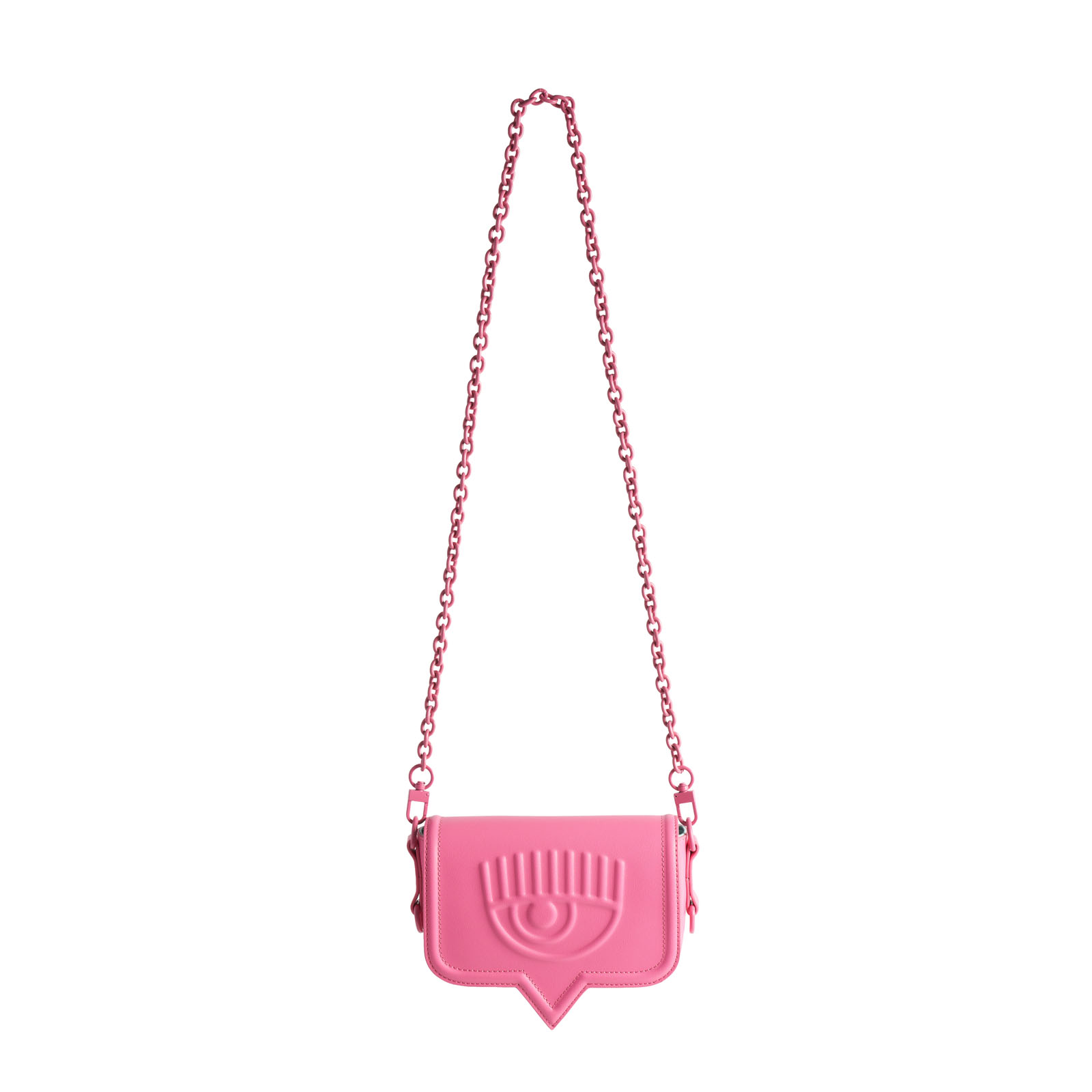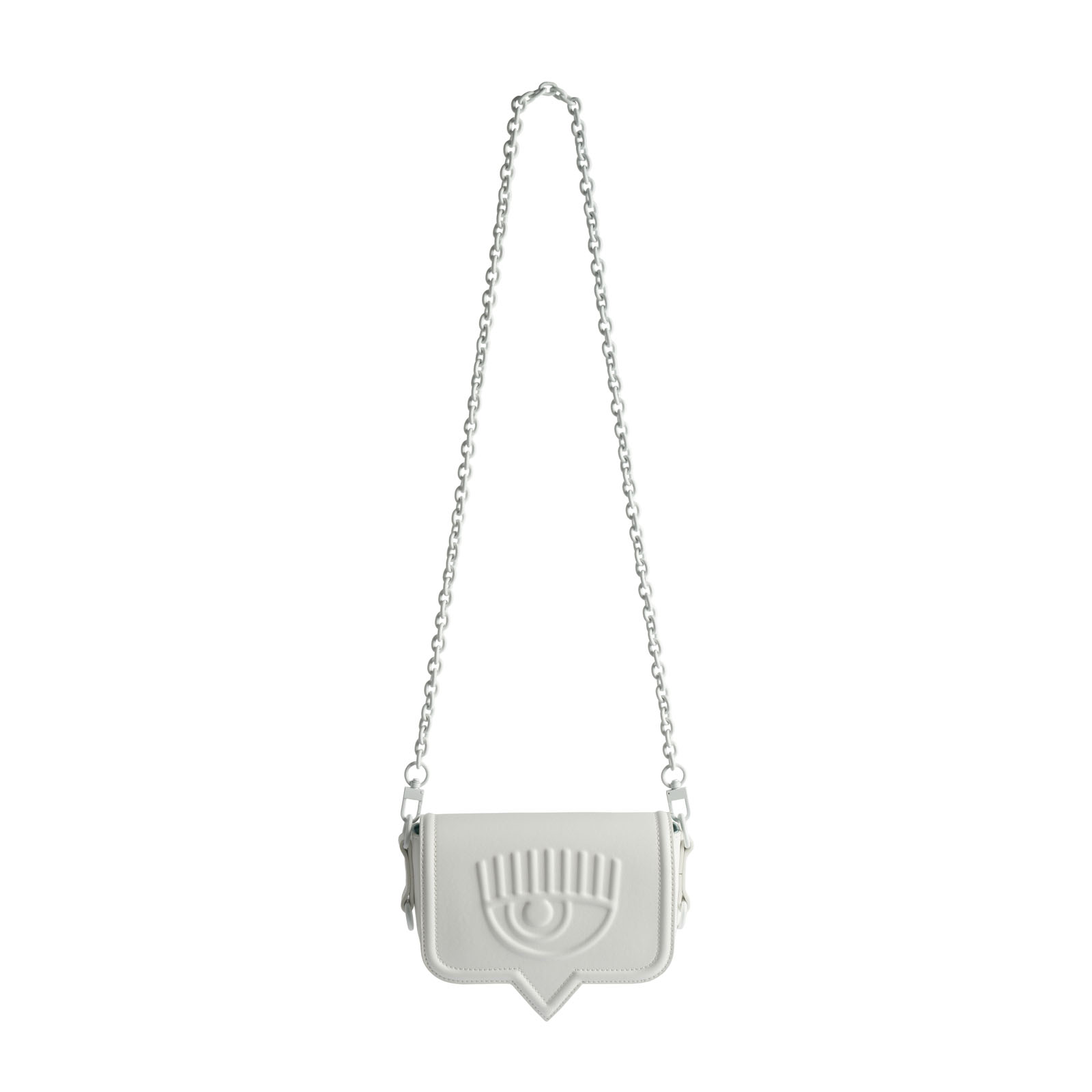 Available in two sizes, small and medium, both in eco-leather, the Eyelike Bag is available in six color variations: the inevitable light blue and pastel pink, the iconic glitter version and the more classy in black, white and red. But it is the details that make the Eyelike Bag a must-have: the bag has an interchangeable shoulder strap completed by a small detachable and adjustable chain in tone-on-tone enamelled metal with the accessory. The infinite combinations of shoulder straps and chain make it the best ally of each everyday look, allowing you to range from the most formal and chic versions to the most daring and unconventional ones.