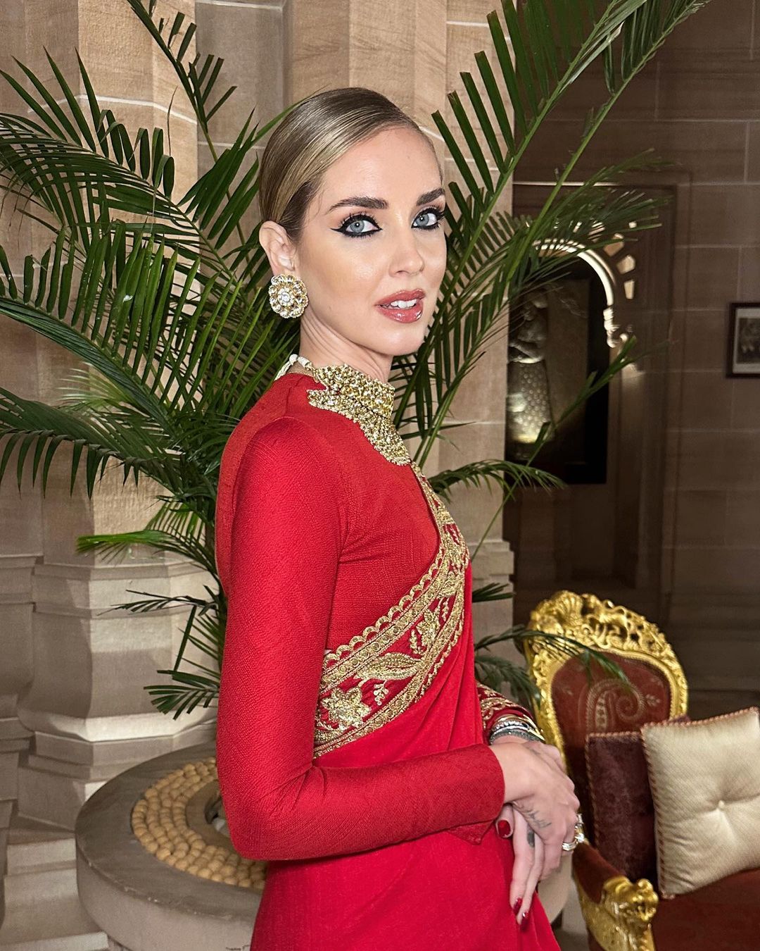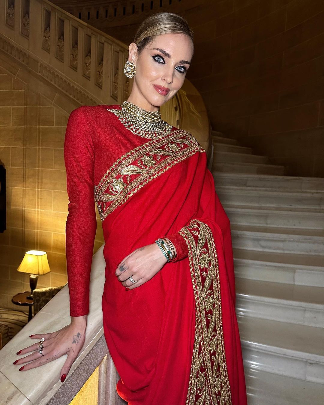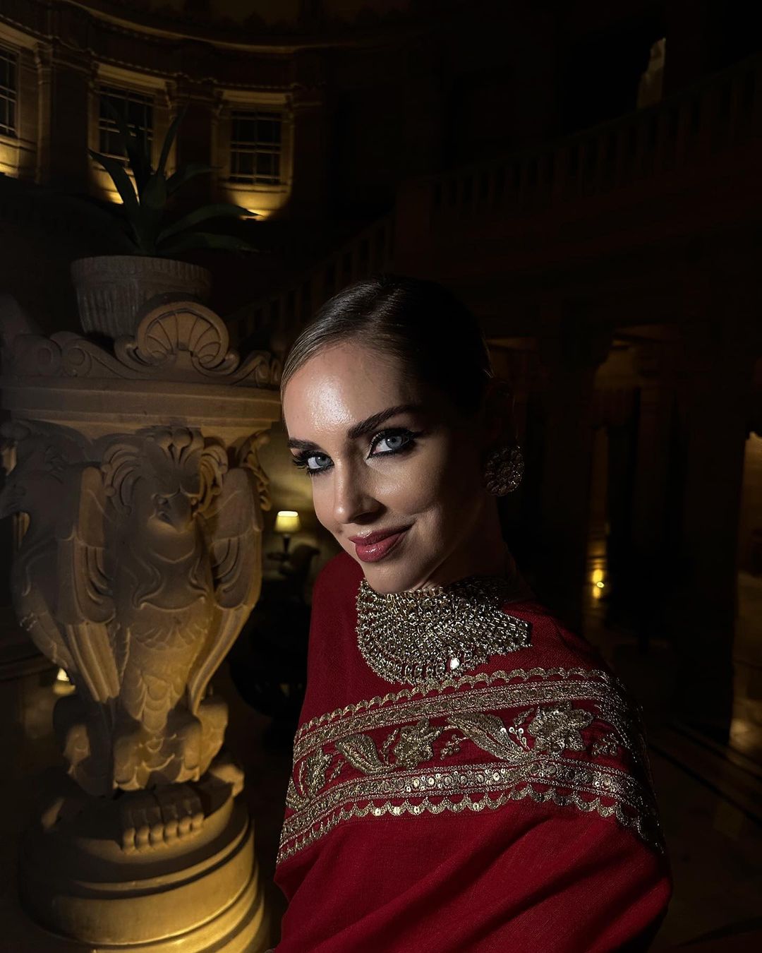 Chiara Ferragni continues her journey to discover the wonders of India. For her night in Jodhpur, she wanted to celebrate Indian culture and history by wearing a sari made by Sabyasachi. Two women helped Chiara during the dressing, telling her the history and how this traditional garment was created. The origins of the sari date back to 100 B.C. and it is one of the very few garments to have been handed down for so many centuries. It consists of a band of cloth about a metre wide, varying in length from four to nine metres, which is wrapped around the wearer’s body in methods that vary according to its function. The most common style of wearing the sari is the Nivi style and consists of wrapping it around the waist with one end going around the shoulder. The sari is worn over a petticoat and a short blouse called a choli. The decoration of the fabric, on the other hand, varies according to the different religions.
