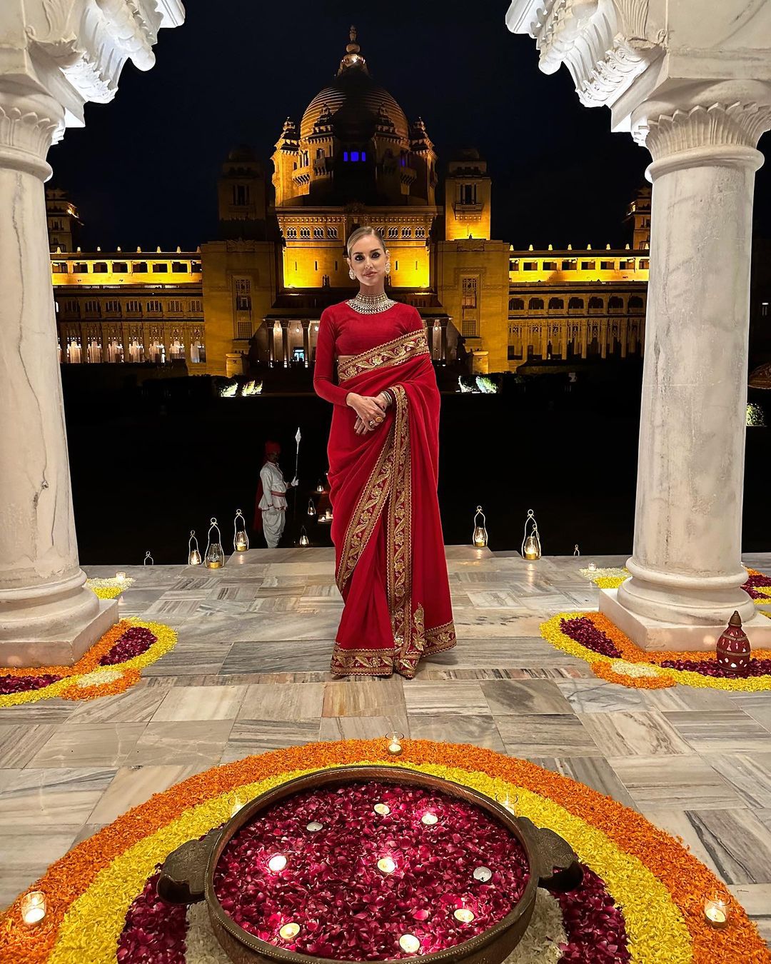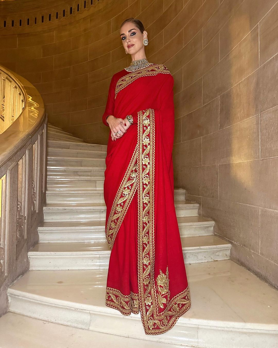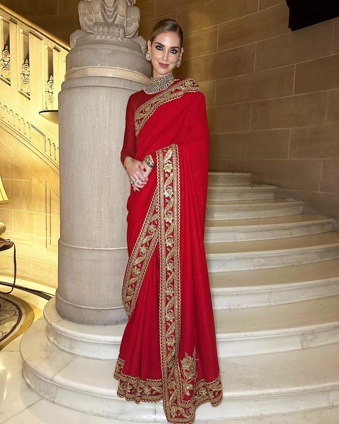 Chiara Ferragni continues her journey to discover the wonders of India. For her night in Jodhpur, she wanted to celebrate Indian culture and history by wearing a sari made by Sabyasachi. Two women helped Chiara during the dressing, telling her the history and how this traditional garment was created. The origins of the sari date back to 100 B.C. and it is one of the very few garments to have been handed down for so many centuries. It consists of a band of cloth about a metre wide, varying in length from four to nine metres, which is wrapped around the wearer’s body in methods that vary according to its function. The most common style of wearing the sari is the Nivi style and consists of wrapping it around the waist with one end going around the shoulder. The sari is worn over a petticoat and a short blouse called a choli. The decoration of the fabric, on the other hand, varies according to the different religions.