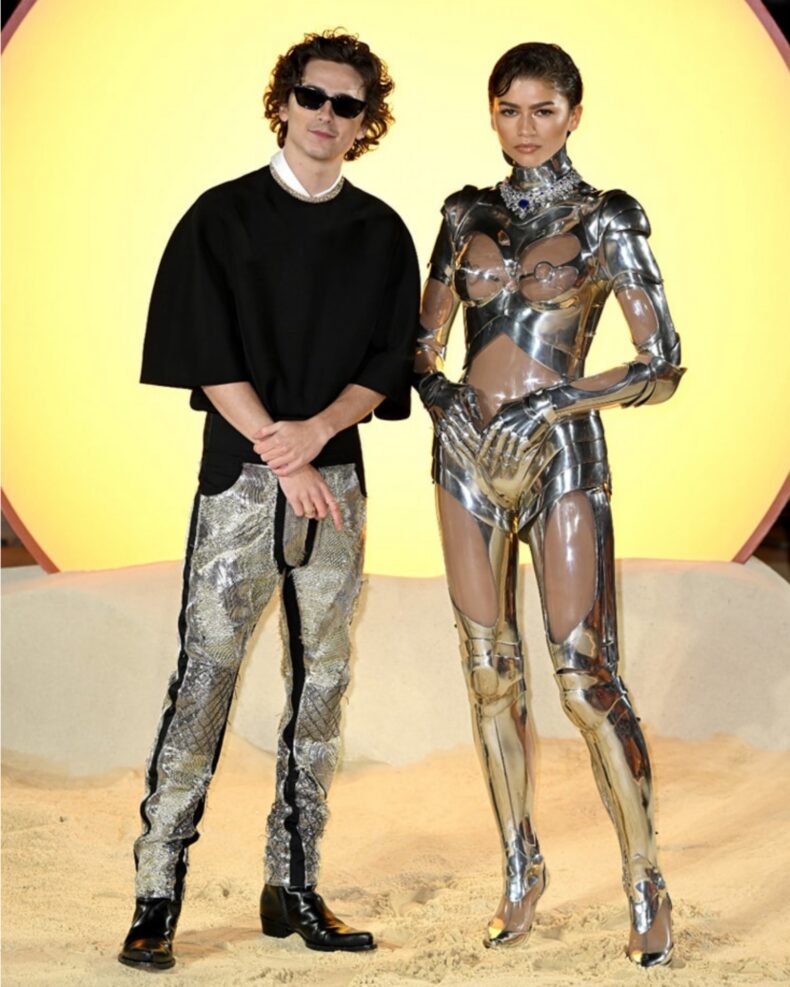 At the center of attention, the extraordinary Zendaya stole the scene with an outfit that narrated the story of fashion. The actress wore a masterpiece from the Haute Couture collection of Thierry Mugler’s Spring/Summer 1995, perfectly embodying the character of the courageous warrior Chani, with a futuristic elegance curated by her talented stylist, Law Roach.