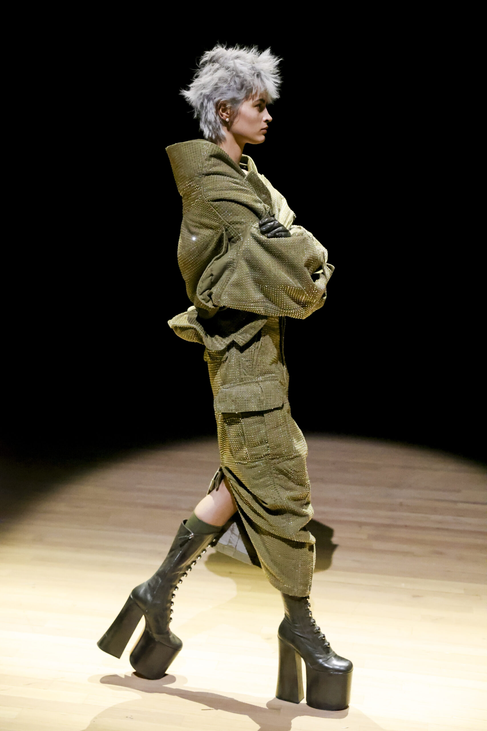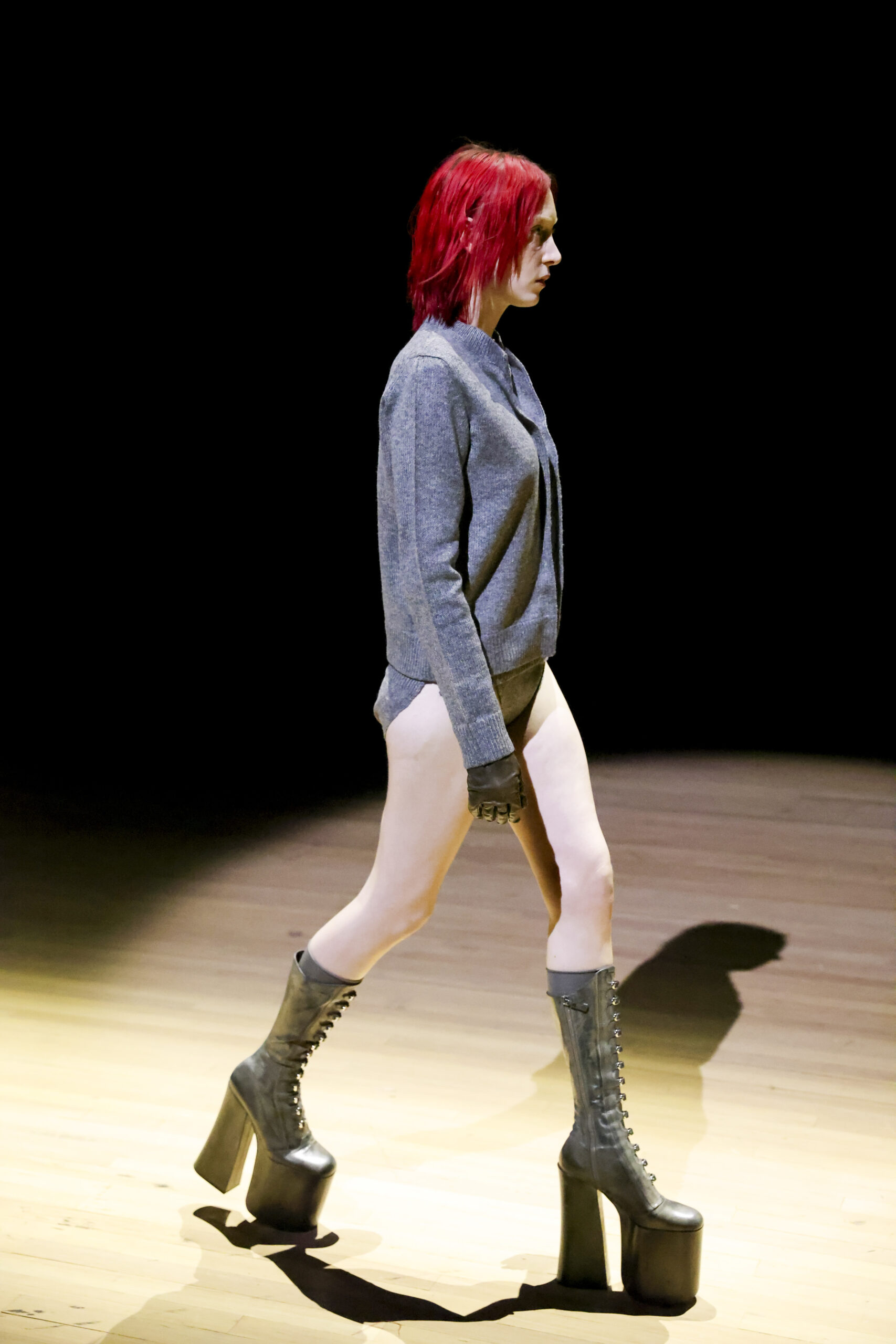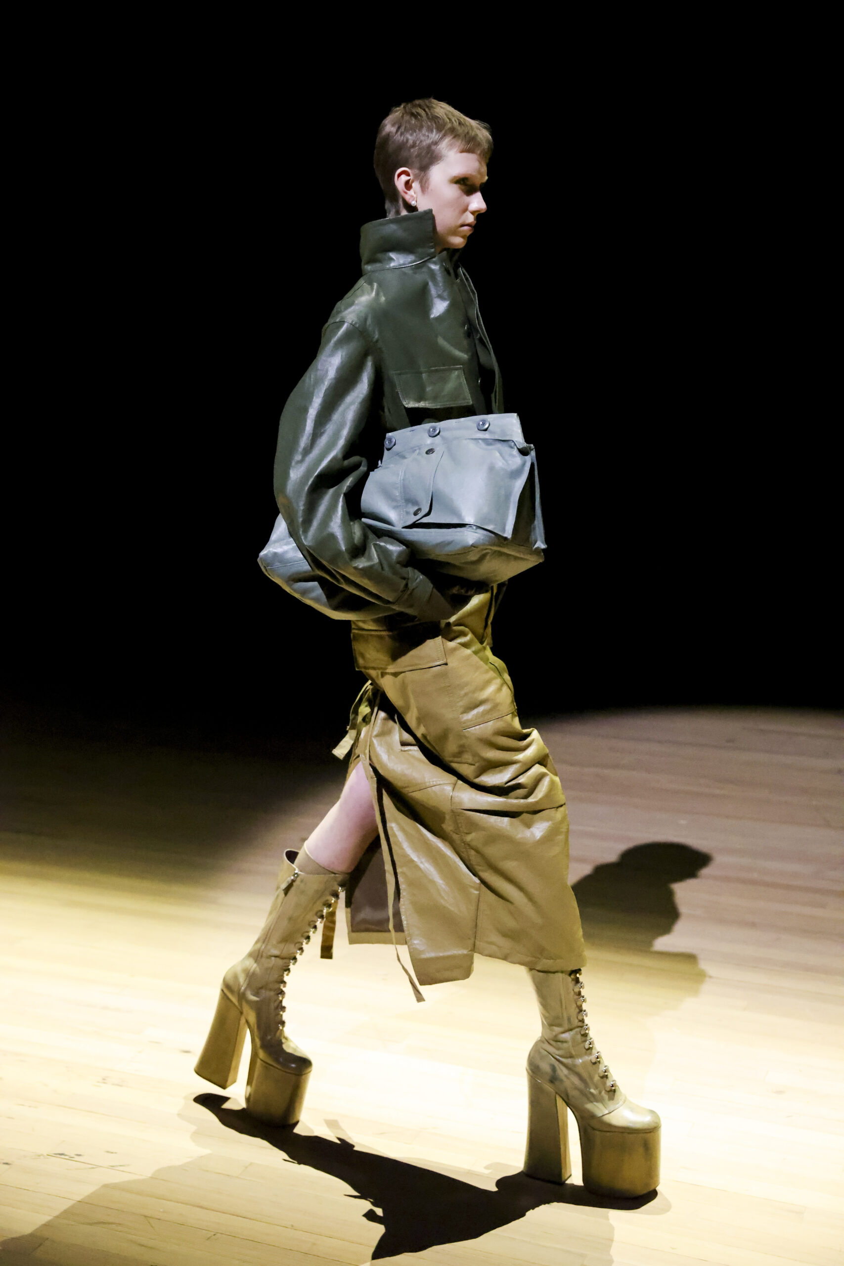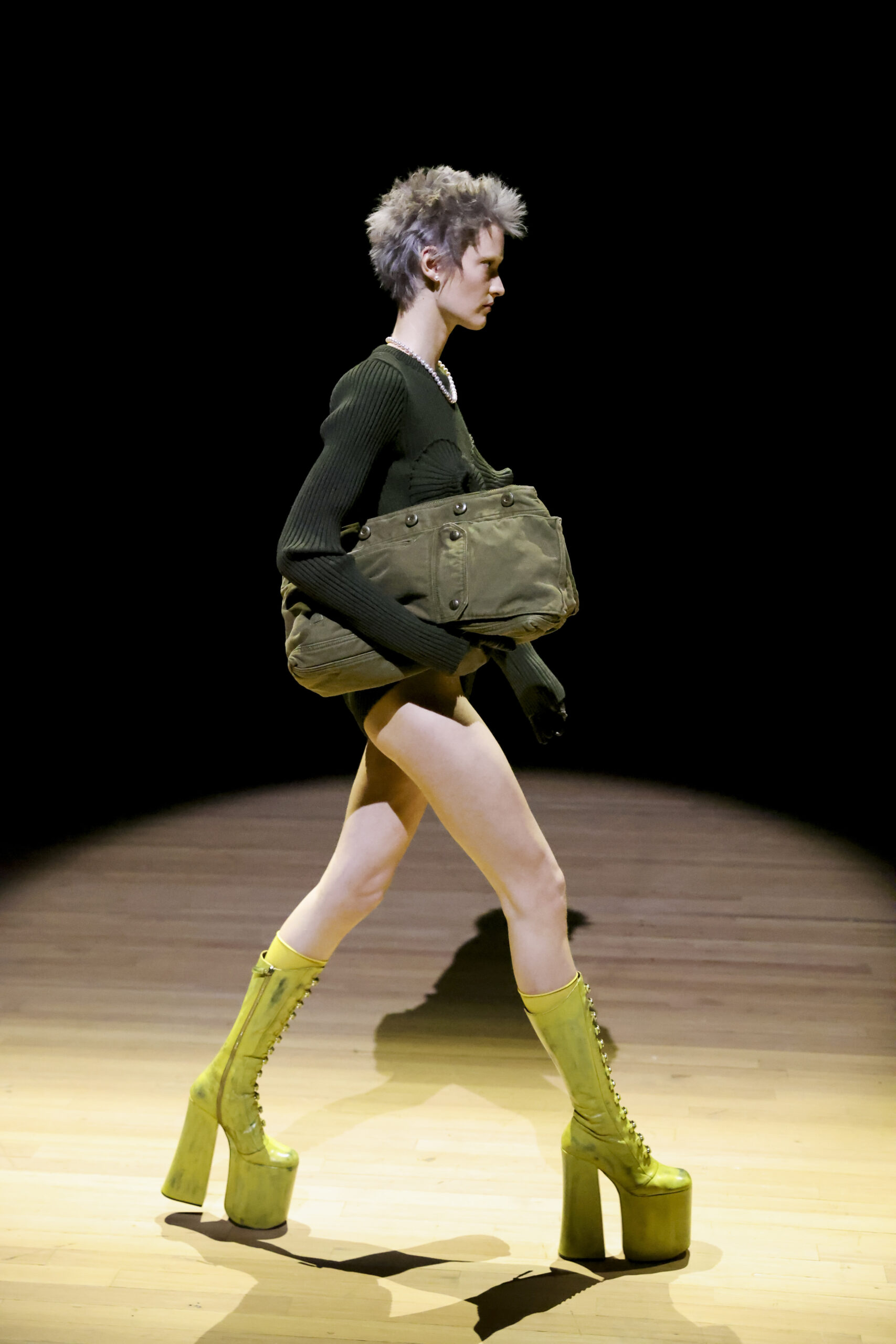 Among the details, we almost seem to recognise the same platform wedges sported by the stainless Naomi Campbell during Westwood’s Autumn/Winter 1993 collection – the very ones from the famous fall. And again, we loved the coats embellished with geometric denim patchwork, the bomber jackets, the incursion of a very bright red and, in conclusion, the two long dresses (so Vivienne) with polka dot print.