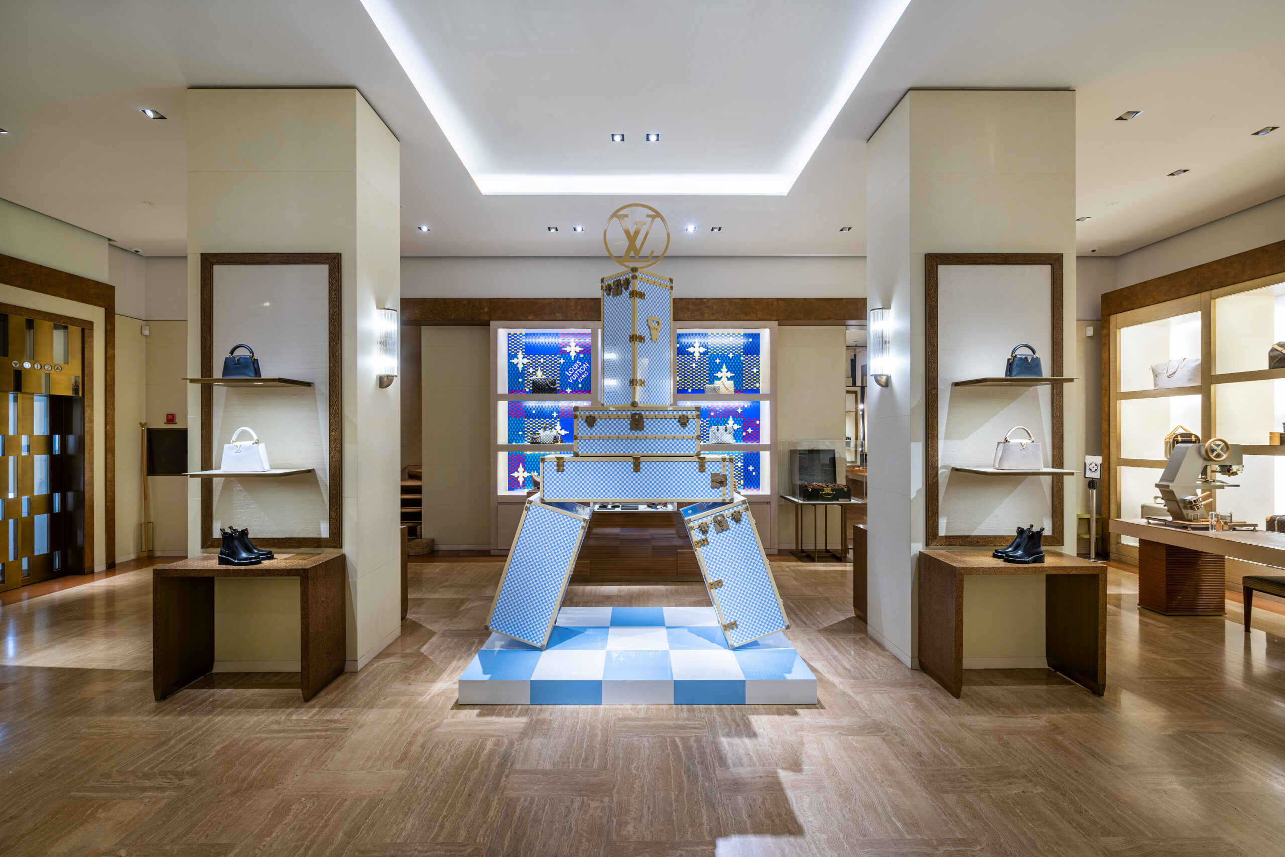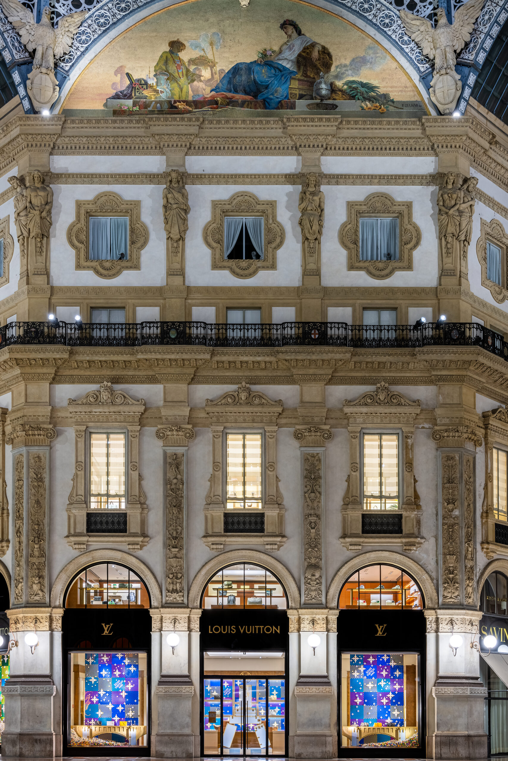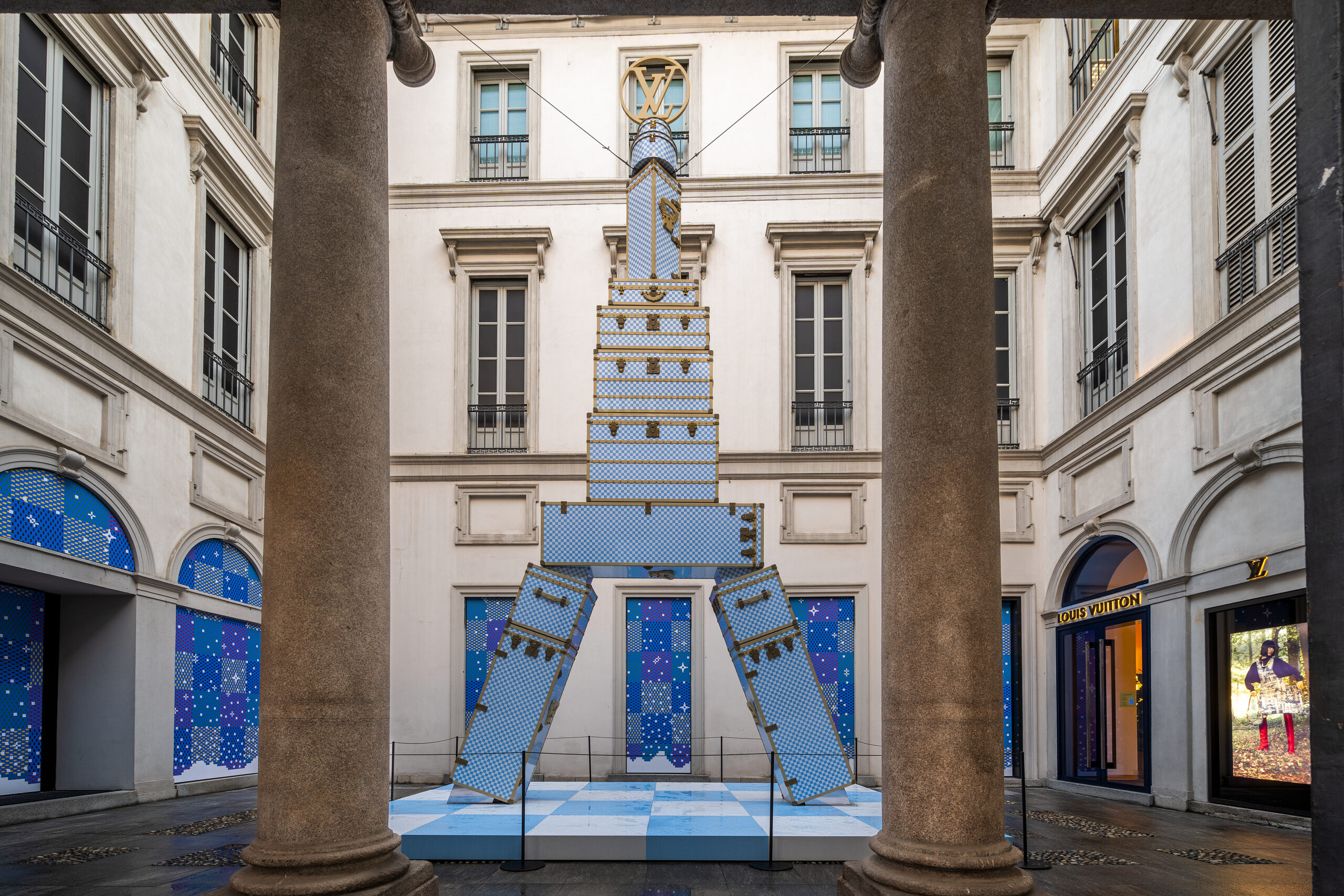 Where in Milan can you find these installations in Louis Vuitton’s shop windows? In the courtyard of the shop on Via Montenapoleone, or outside and inside the store in Galleria Vittorio Emanuele, where you can find a magnificent Eiffel Tower made out of trunks, a tribute to the famous photo by Jacques Henri Lartigue.