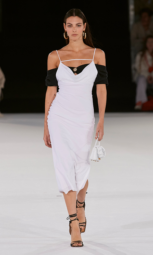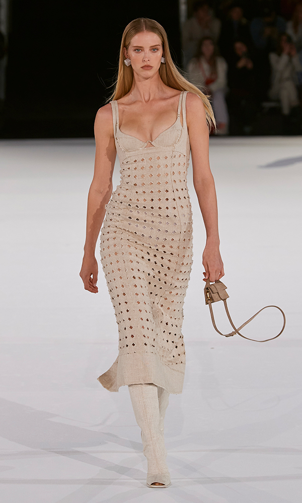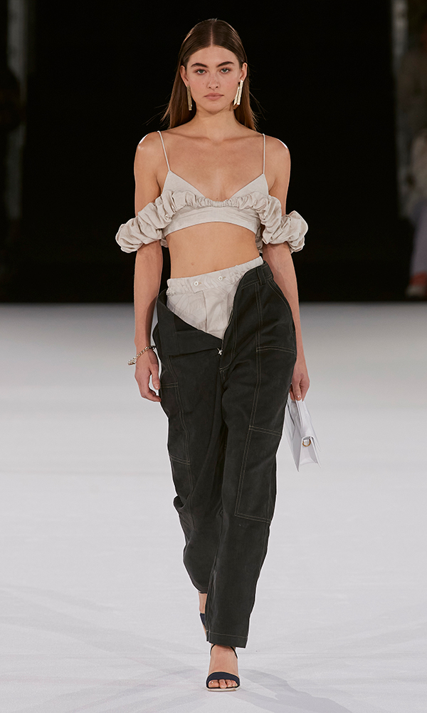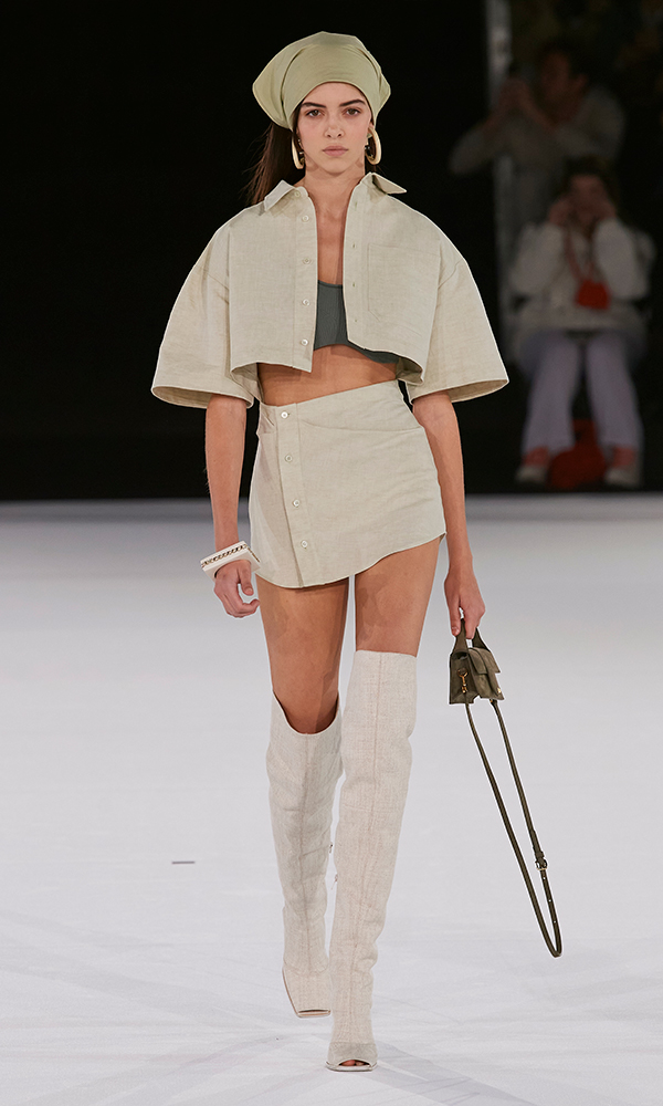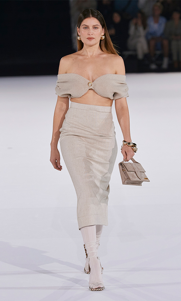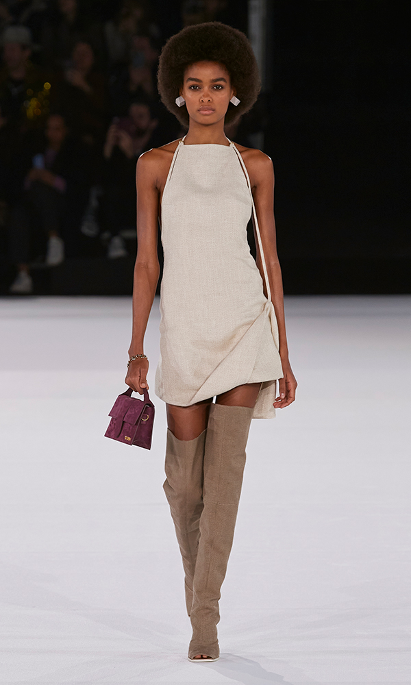 The idea that the collection emanates is that of a simple sensuality, femininity that does not use necklines but finds in the wearability of its garments its greatest value: crop tops and bras, micro wrap skirts and wide over the knee boots in suede. Together with them also tight sheath dresses, halter dresses and oversize jackets in contrast with micro bags, now considered icons of the Maison. The textures play with linen and cotton, the palettes instead are divided into colour blocks: ivory, khaki, midnight blue and points of fuchsia and lilac. To make the collection, even more, loved, the total look proposals that dress Jacquemus women from head to toe, accessories included! Super chic are in fact not only the new mini bags or boots but also the jewels, rigorously in the shape of mini Chiquitos. What is the extraordinary nature of the collection? In addition to its wearable garments, suitable for an every-day look and above all purchasable (reducing the price of the clothes was in fact the will of the designer, who says he does not want to “produce clothes at disproportionate costs to wear at a wedding or perhaps once more “), what we love is the message that Jacquemus’ FW 2020/21 collection brings with it. In fact, the goal is to return to something more pure and minimal, something that over time becomes a statement and not just a creation that leaves you speechless and then forgotten; the collection seems to want to propose a style, suitable for all women in the world, that clean, elegant and feminine has already made thousands of people fall in love with Jacquemus… The Blonde Salad included!