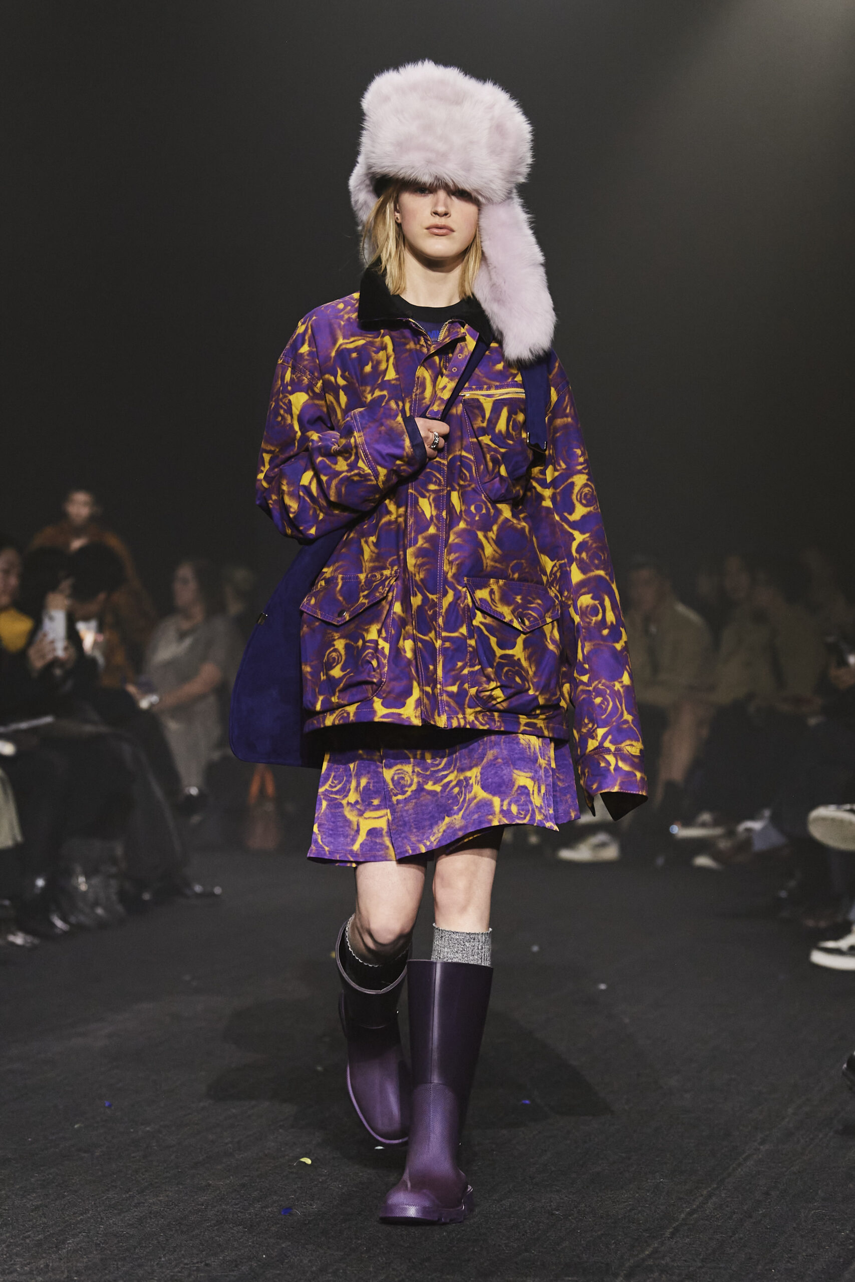 Among the signature garments of this Fall/Winter 2023 collection are the pleated tartan kilts and oversized coats, then soft Aran jumpers and fluffy hot water bags. Footwear includes equestrian-inspired boots, rubber rain boots and the signature square heeled sandals – embellished with faux fur and shearling.