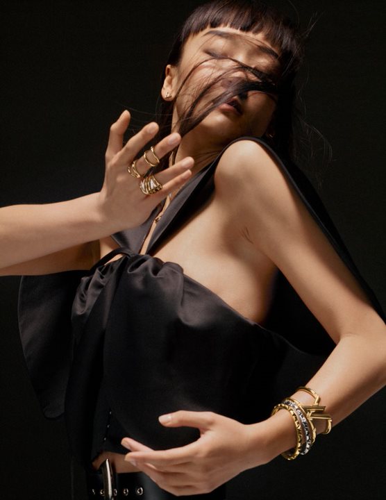 Conceived as a no gender line, therefore suitable for masculine as well as feminine looks, the LV Volt collection is an ode to the founder’s initials that become a metaphor for movement, an allegory for momentum, creating an architectural project in which the main lines become a universal language that transcends borders and genres. The collection plays with the initials in two different ways: the first, purer and more geometric, in which the golden initials intersect and unite in a diamond on necklaces and earrings; the second in which the initials become the link of a chain, assuming an almost prismatic shape which ends with the transformation of the letters into claws on bracelets and rings.