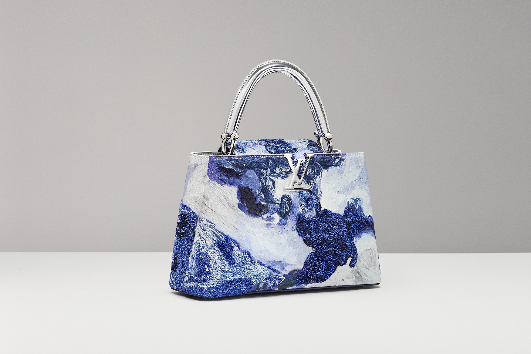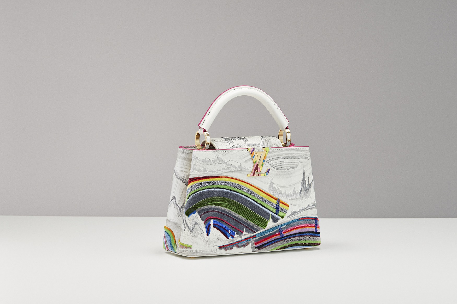 Huang Yuxing’s Capucines is based on a specially reworked version of his 2019 painting The Colossus Hidden Deep in the Hills. The stylized landscape outline of this new image, including the oval shape which is a signature of Huang, is first printed on gray-white leather and then embroidered with gray thread to add a sense of perspective. The rainbow-like mountains that cross the foreground are created using different depths of quilted embroidery to give texture and a tangible sense of movement to the design. The accidental drips of paint, another characteristic element of Huang’s images, are reproduced and enhanced through the thickly filled metallic thread bouclette stitch embroidery, which is woven into the tufting. The smaller sized Capucines BB, fitting the exuberant palette of his work, features a handcrafted metal LV signature, inlaid with brightly colored enamel and delicately rounded mirroring the flowing rainbow of the embroidery.