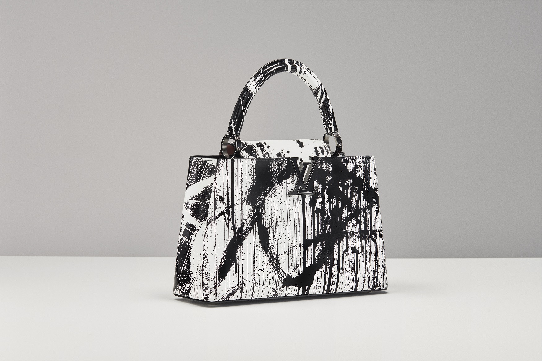 Gregor Hildebrandt’s Capucines elevates the artist’s love for vinyl records and his rip-off technique to an accessory. In fact, in his artistic creations Hildebrandt uses the magnetic powder of the recording tape to create striking black and white images. The result is meticulously screen-printed on the white leather of the bag in a black and white “positive” version on the front and the “negative” image on the back. The LV signature in gunmetal black is inlaid with real vinyl records, while the base of the bag and thin strap are crafted from textured patent leather reminiscent of the dark sheen of VHS tape that Hildebrandt often uses in his works. To complete the whole, the metal rings and their studs, as well as the hooks of the strap, strictly in gunmetal color.