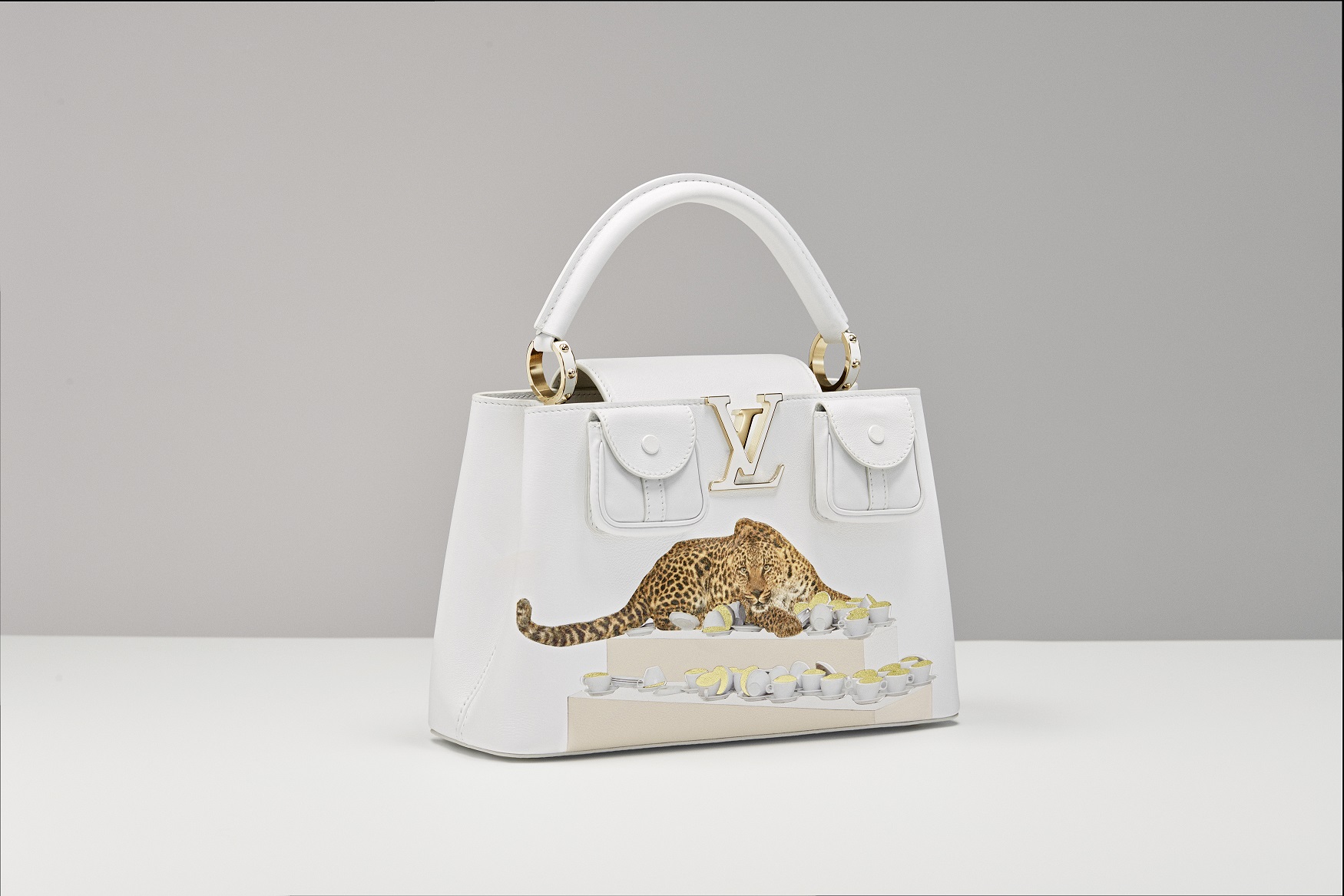 Paola Pivi’s Capucines plays with reality, altering dimensions and positions, using objects in new and unprecedented ways. The artist challenges the public to see and consider the world in a new way by placing an investigation of animals and their representation at the center of this sometimes disorienting and often playful reworking. For Artycapucines, Paola Pivi is inspired by her 2007 work One Cup of Cappuccino Then I Go. create a fur-like appearance. Each remaining part of the image was then expertly inserted separately into the leather structure of the bag, including the more than 30 porcelain-effect paint cups and saucers and the frothy tops of the cappuccinos, made of delicate gold-colored lambskin made with real gold leaf. ‘gold. The Pivi design also includes two comfortable safari-inspired pockets on the front, a first for the Capucines bag, with shiny metal snaps engraved with the Louis Vuitton name. The metal rings attached to the smooth white leather handle have white lacquered inserts that act as a frame to show the sheer majesty of the leopard.