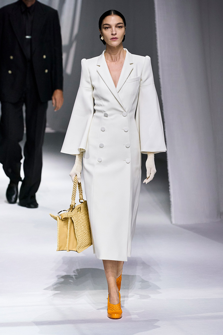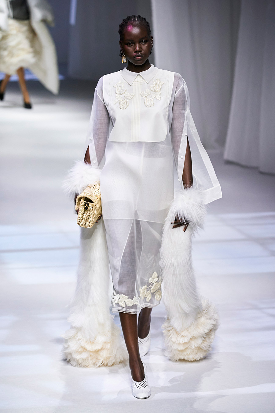 A dream in white the Fendi SS 21 fashion show. A reference to the brand’s archival silhouettes that are revisited in a patchwork look by Silvia Venturini Fendi. Rome is more present than ever in this collection, a symbol of the restart, and completes the identity card of a brand that recalls a forgotten refinement to look to the future. All shades of white are the protagonists, declined from time to time in cream, optical white and beige. To break, but not interrupt, the purity of baby blue, wisteria and brown outfits. Among the items on the catwalk, the undisputed star is the shirt that is declined in the caftan, jumpsuit and chemisier versions. Crochet and broderie anglaise lace embellish daytime outfits paired with 60s accessories such as hats with oversized brim and wide visors. Collars and midi lengths are the protagonists of the dresses enriched by floral embroidery in bobbin lace on the edges and slits. There is no shortage of outerwear too and take on romantic and soft shapes like coats with puffed sleeves and extra light cropped down jackets with collars (to love). The Baguette, definitely brought back into vogue, returns for next summer dressed in straw and woven knit, together with the new version of the iconic Pekaboo and bucket bags in lace and fishnet.