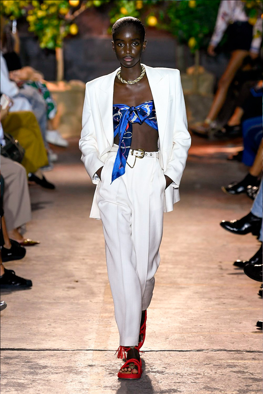 For this SS 21 collection Etro has chosen to celebrate the Italian summer, interpreted as a synonym of joy, happiness and roots. Perhaps fresh from the summer just passed, Veronica Etro, designer of the brand’s women’s line, has chosen to return to its origins by enhancing the charm of the Riviera style and the artistic and cultural heritage of the brand’s cradle. An unprecedented nautical theme was the red thread of the entire collection represented by motifs of ropes, marine chains, anchors, shells and stripes. A new protagonist has also been added, the Pegaso-Tritone, which becomes the logo of T-shirts and cropped sweaters. A return to origins also symbolized by the archive scarves combined with the iconic paisley motif revisited in a monochromatic key. The mood is generally linked to the 90s fashion with Bermuda shorts combined with printed bustiers and light twill jackets but also turned-up jeans worn with tight and hyper feminine swimsuits. Bikinis and skirts have retro shapes, more related to 1950s fashion, as if to enhance a return to the femininity of the past, symbolized by waist belts of ropes and chains. The color palette plays on maritime combinations of red and blue, combined with sorbet tones such as lime yellow, turquoise, orange, lavender and mint green. The accessories? Maxi straw bags and printed canvas tote bags to lose your head