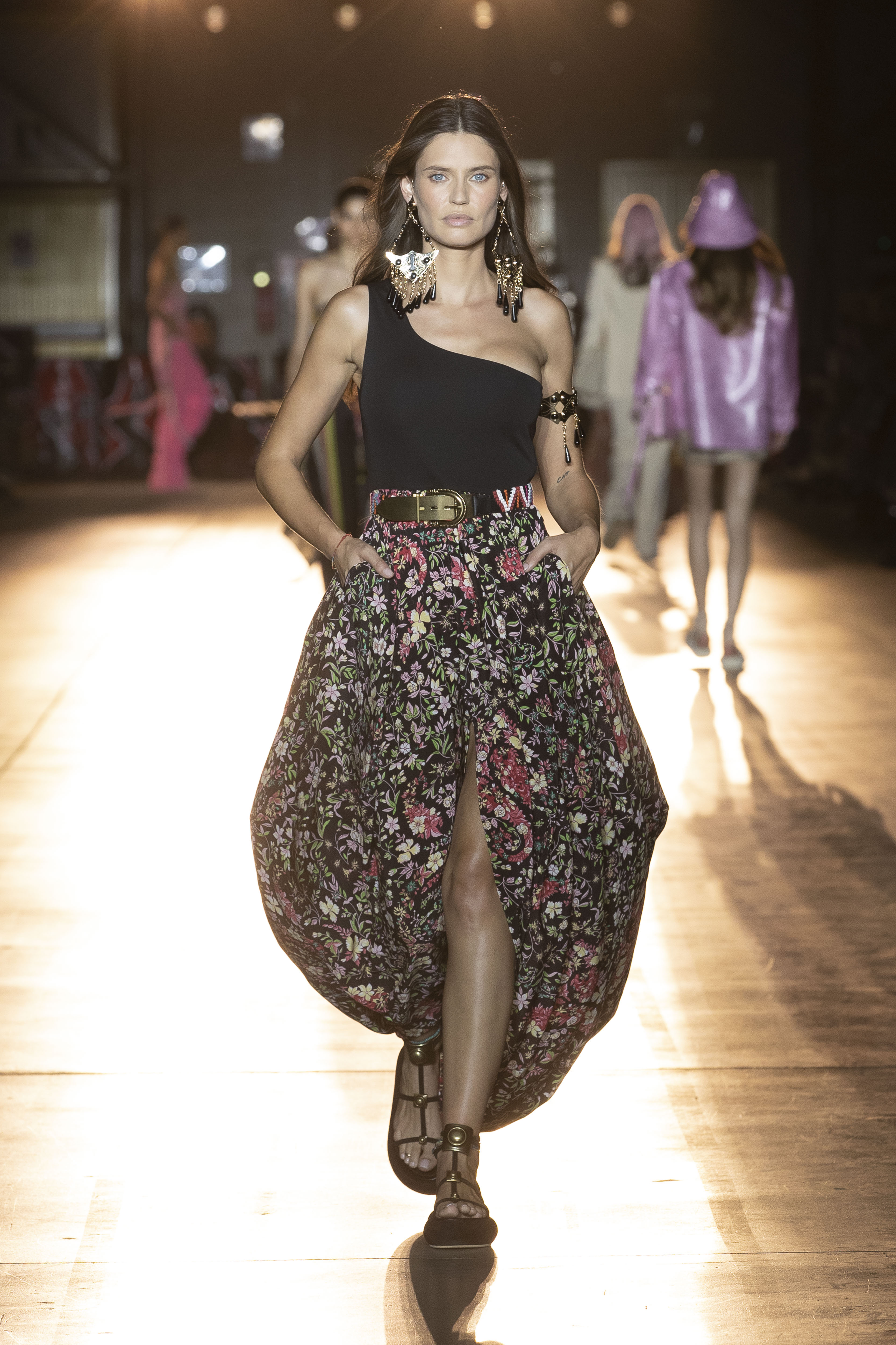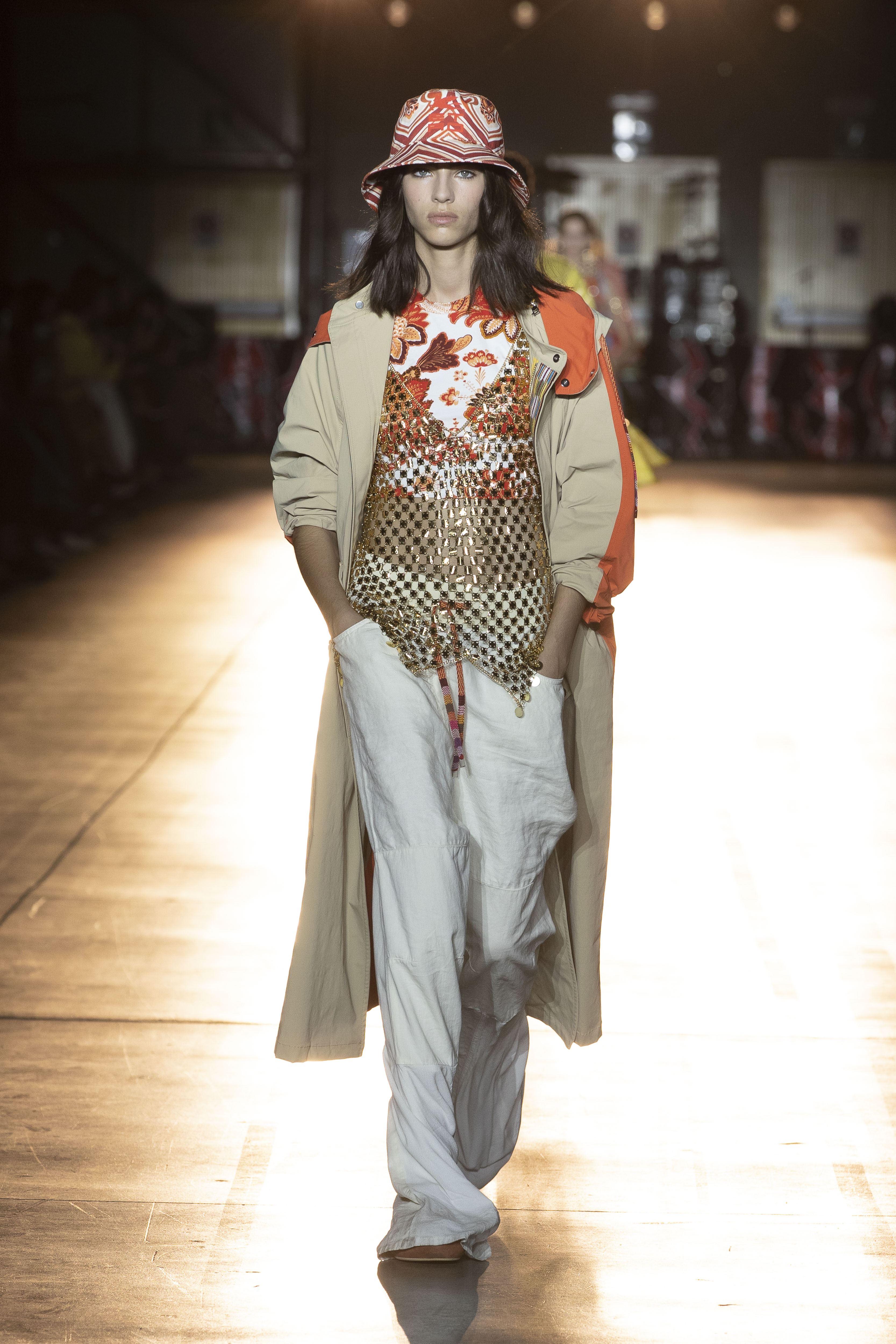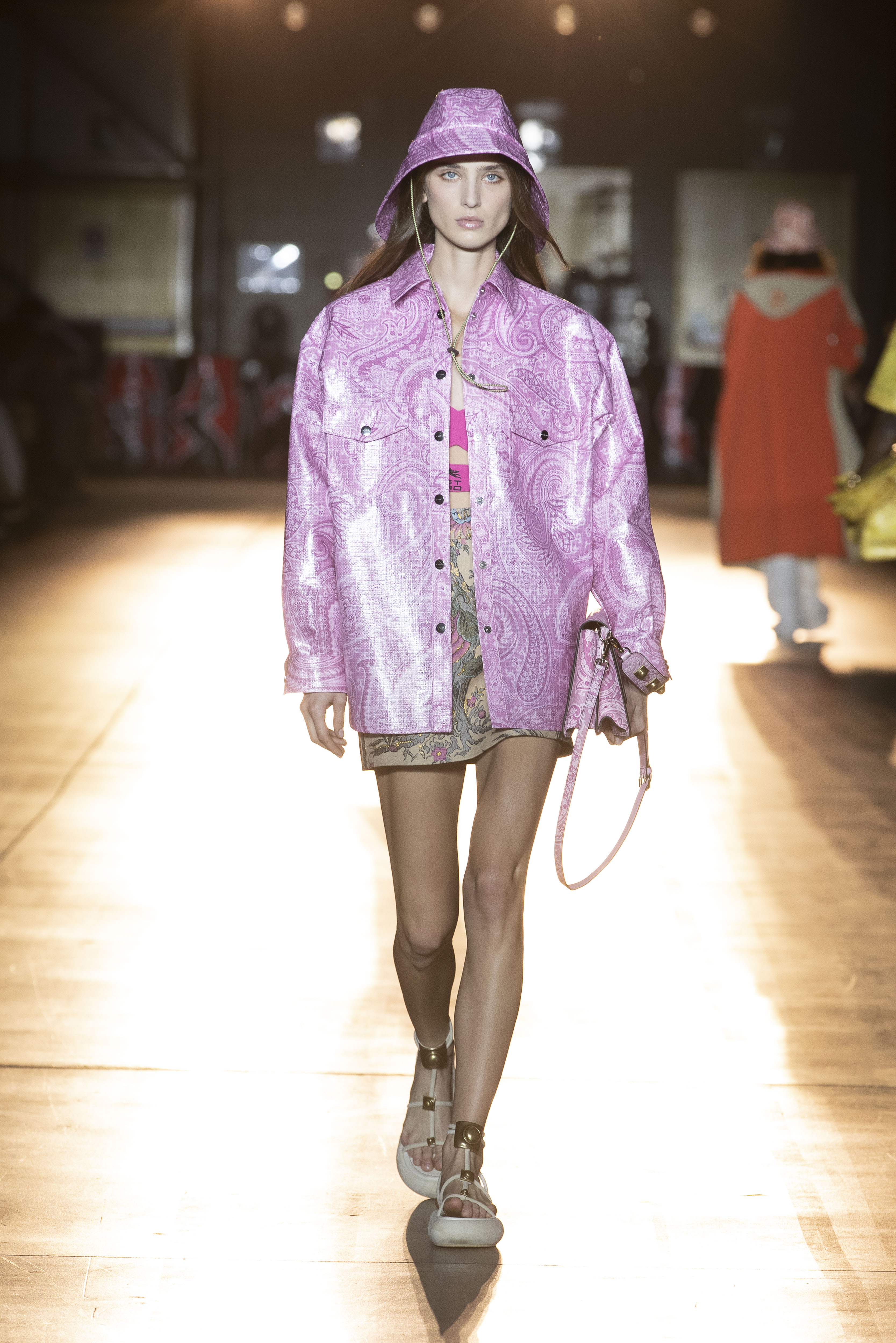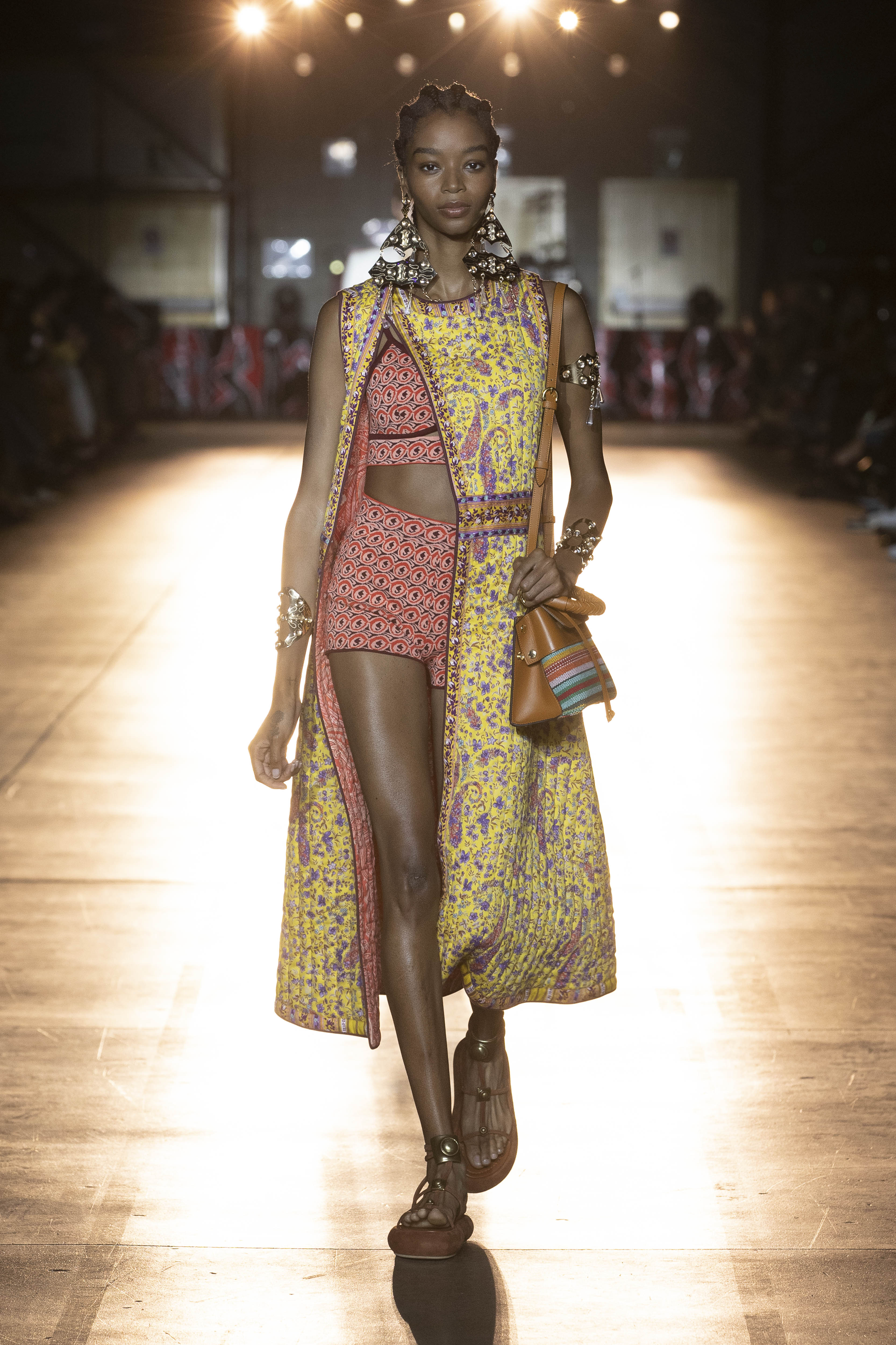 Engaging energy, contagious optimism and a rediscovered positivity characterize Etro’s SS22 show. The past becomes a source of inspiration, especially in the styles and fashions of the ’70s and’ 90s that blend by taking patterns and colors from one, shapes and style from the other. The iconic paisley becomes a spiritual mandala with a psychedelic flavor with references to sophisticated furnishing fabrics, this time mixing with new maxi prints such as multicolor daisies and material stripes. Orange, yellow and black are the protagonists of a palette that screams energy and audacity. The pants are super comfortable, the waist is low and formality is pushed aside. Etro, in fact, for the next SS22 wears its more gypsy soul with micro tops, bra crochet, stones, dress cutouts and oversized men’s shirts to be combined once with wide-leg trousers and another with leggings and knitted cyclists. To complete the look, sandals with wedges or heels with leather intertwining to be combined with tote and bucket bags in painted ray with Paisley motifs.
