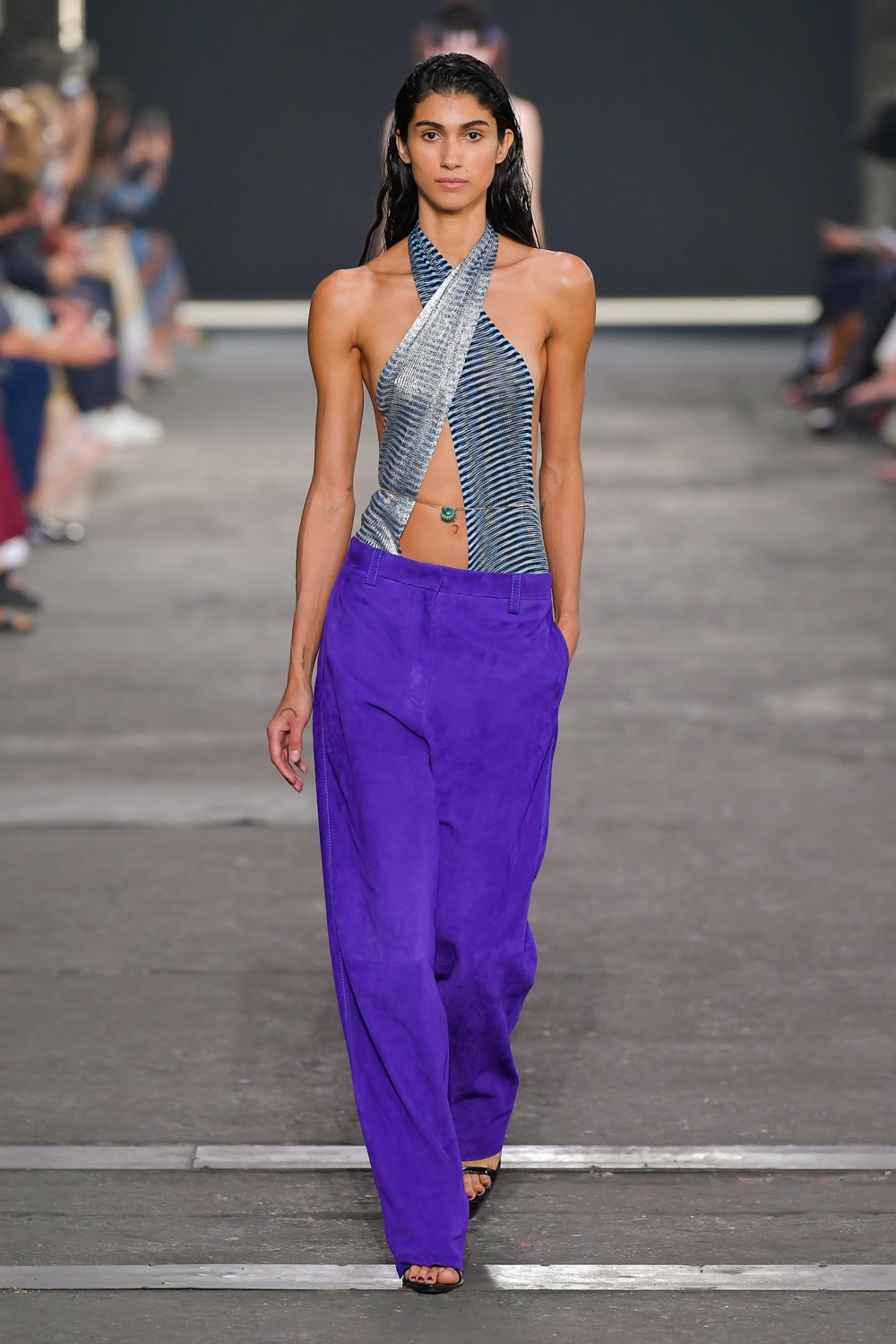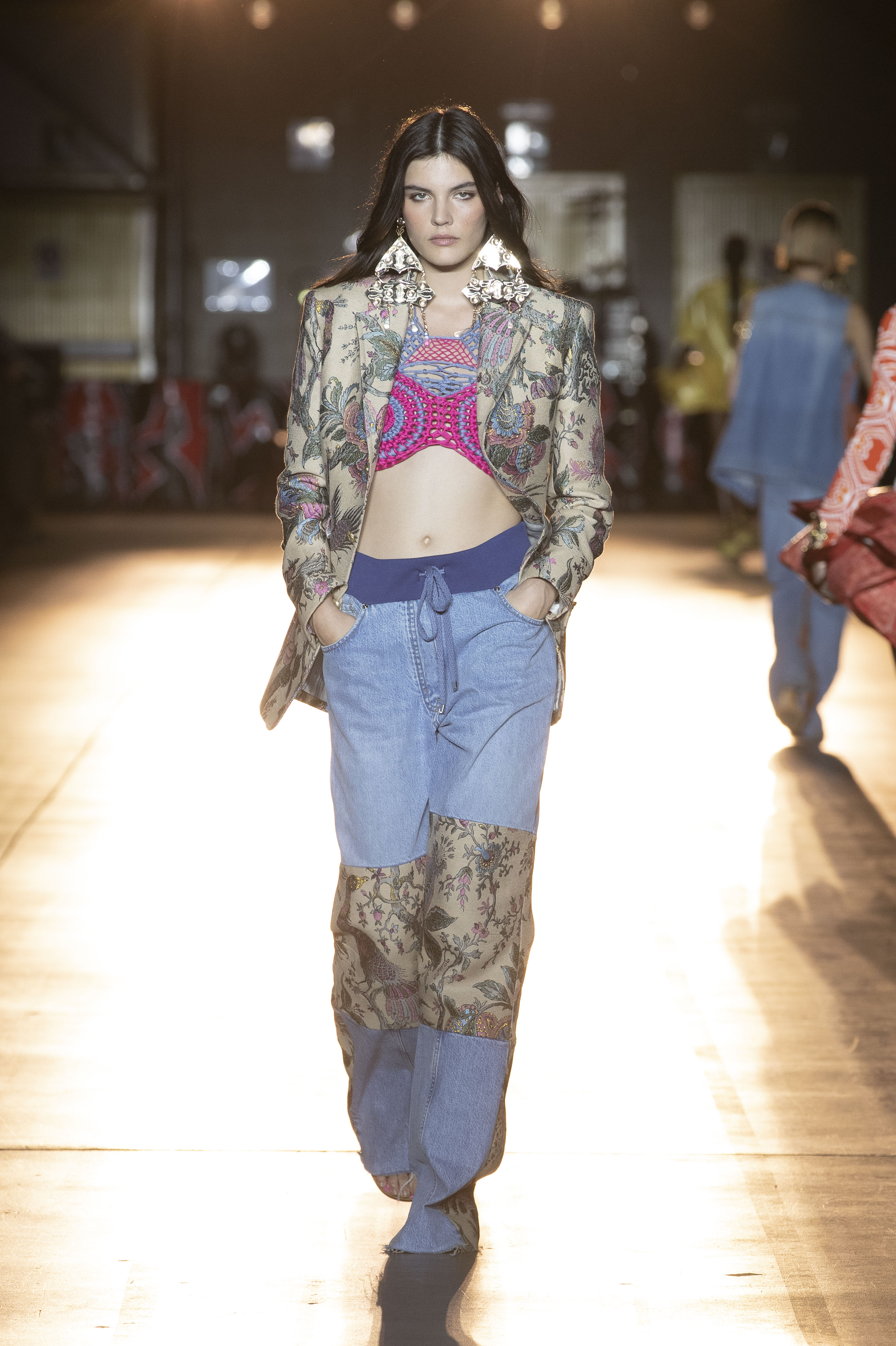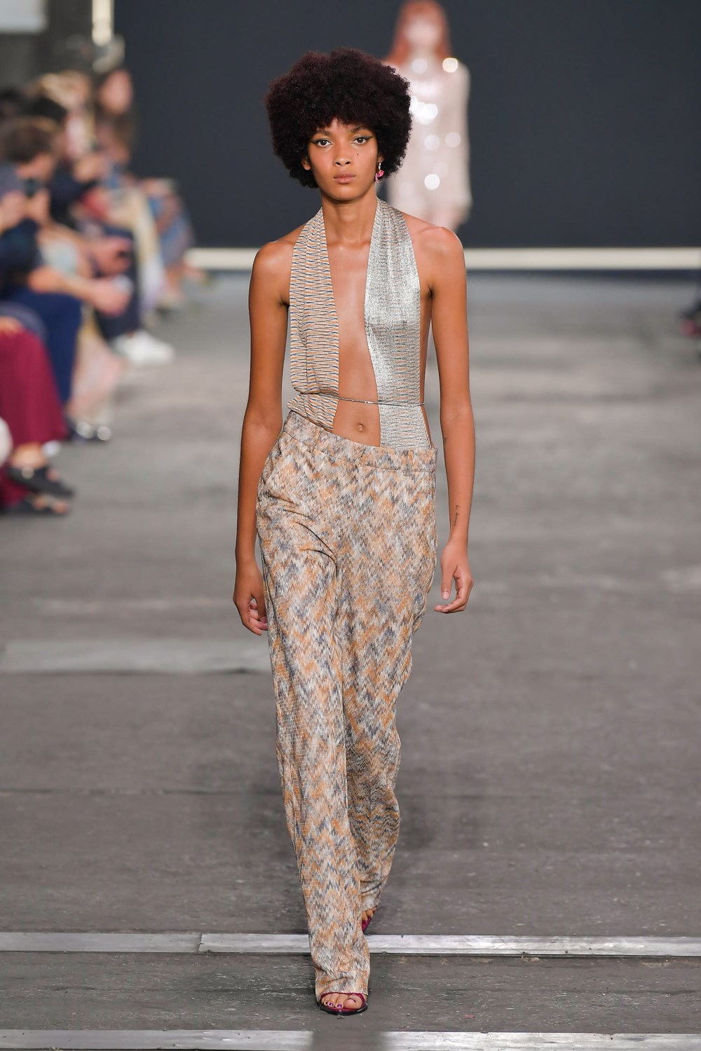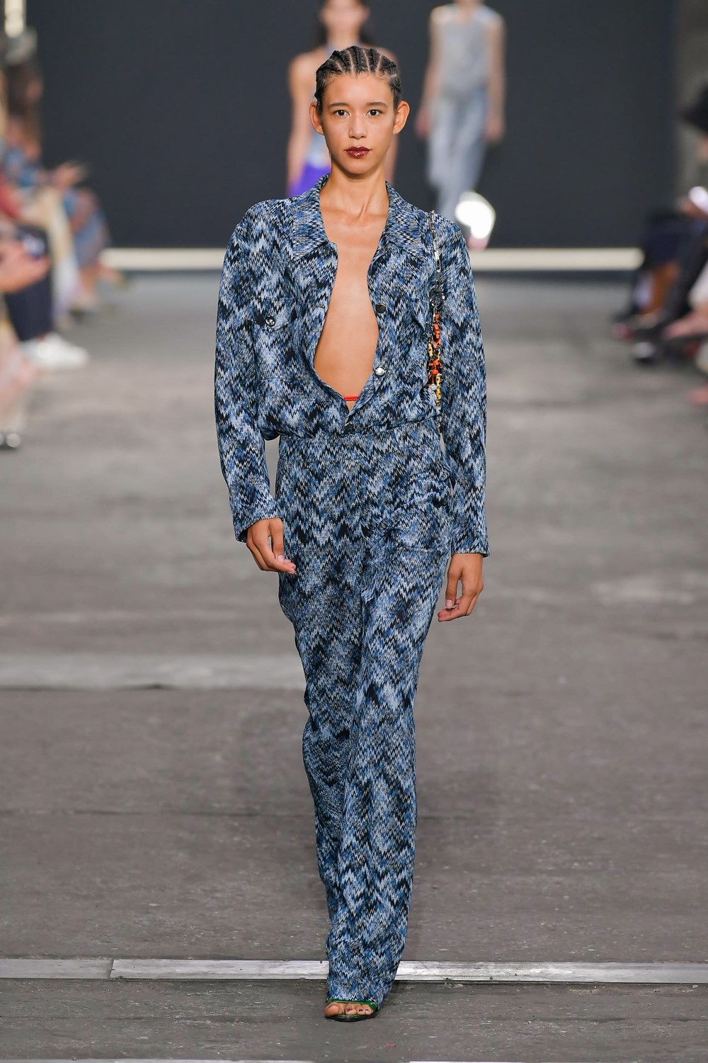 Missoni goes against the trend for the next SS22, if others prefer orange and yellow, the iconic colors of the Maison, Missoni opts for blue, purple and fluorescent colors. The style, reflected in amazing hair looks curated by GHD, is typically gypsy and takes up the most symbolic zigzag texture to renew it and offer a new and more casual version. The jeans have a very low waist and a wide leg to be worn with open bra and vests that reveal body and shapes. The Missoni logo becomes the pattern of coordinated leather suits made of almost invisible mini skirts and bra for a style that enhances femininity like never before. The long caftans in fact have given way to transparency and more material compositions that prefer cut-out bodysuits and suits and tailored trousers with a masculine cut.