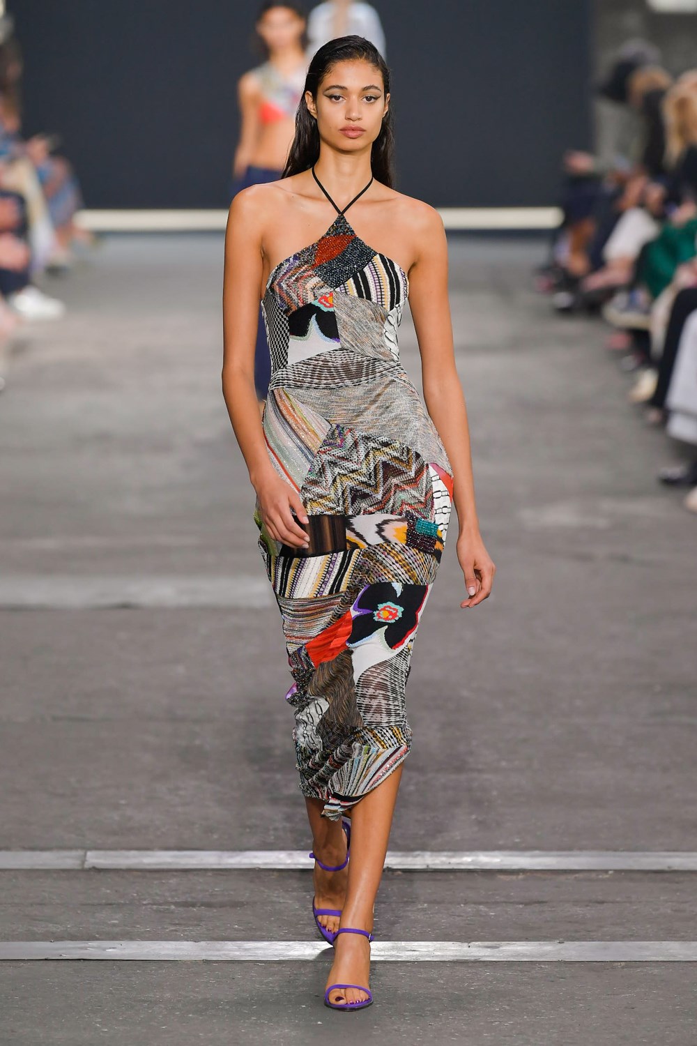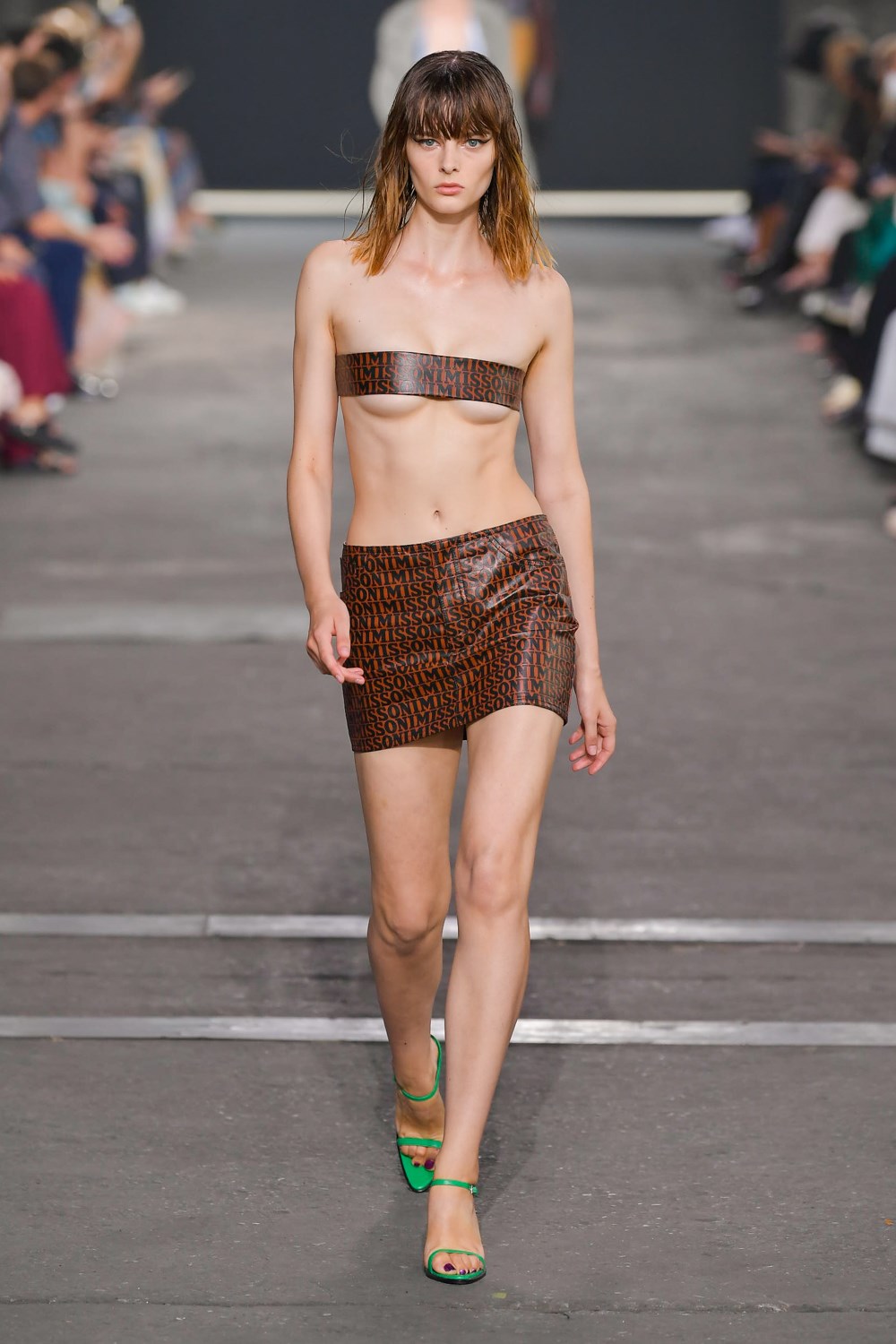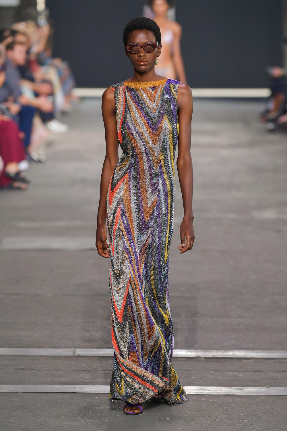 Missoni goes against the trend for the next SS22, if others prefer orange and yellow, the iconic colors of the Maison, Missoni opts for blue, purple and fluorescent colors. The style, reflected in amazing hair looks curated by GHD, is typically gypsy and takes up the most symbolic zigzag texture to renew it and offer a new and more casual version. The jeans have a very low waist and a wide leg to be worn with open bra and vests that reveal body and shapes. The Missoni logo becomes the pattern of coordinated leather suits made of almost invisible mini skirts and bra for a style that enhances femininity like never before. The long caftans in fact have given way to transparency and more material compositions that prefer cut-out bodysuits and suits and tailored trousers with a masculine cut.