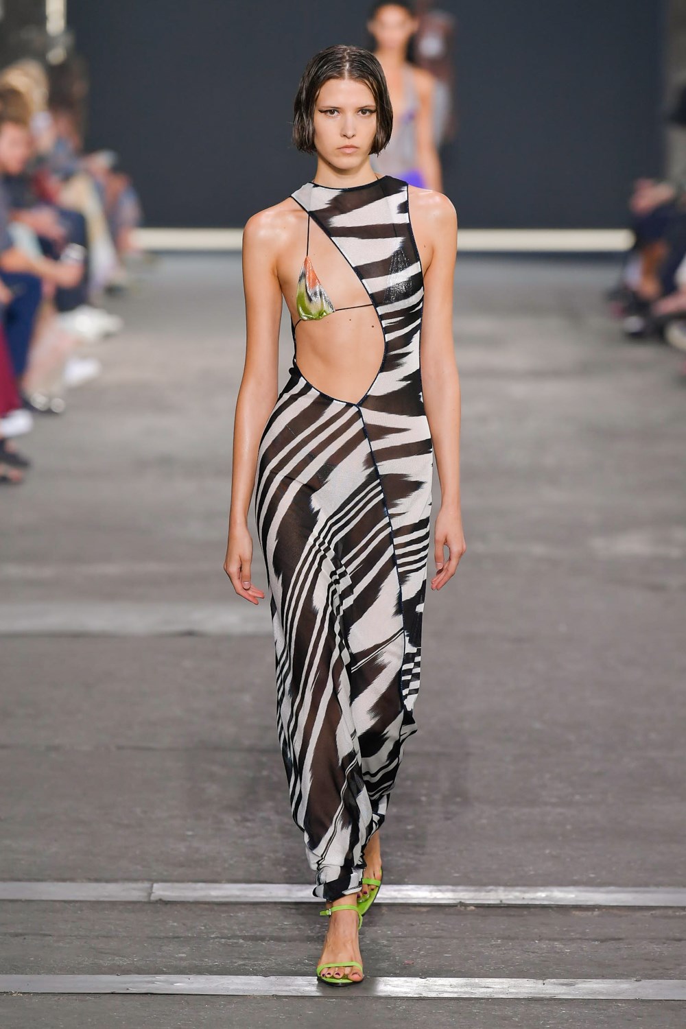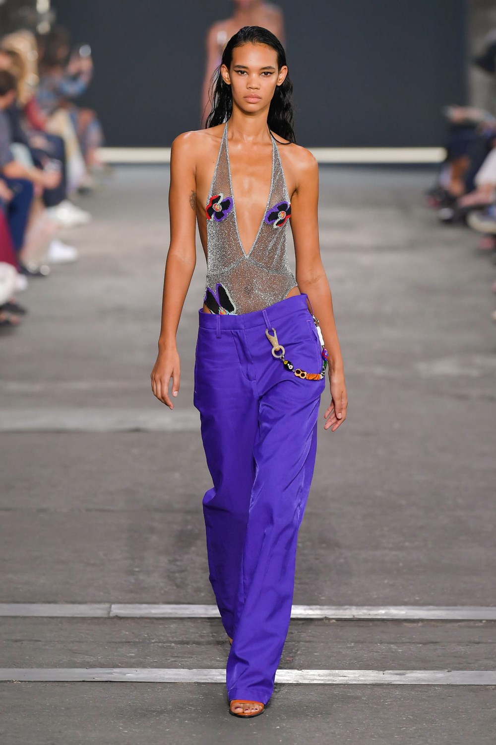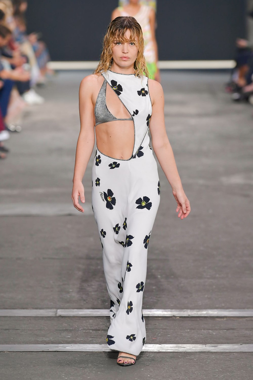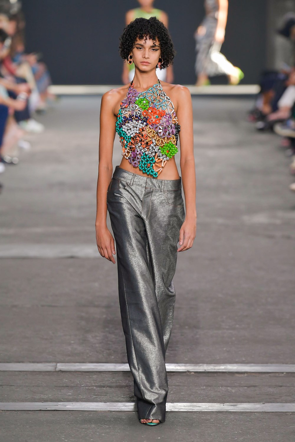 Missoni goes against the trend for the next SS22, if others prefer orange and yellow, the iconic colors of the Maison, Missoni opts for blue, purple and fluorescent colors. The style, reflected in amazing hair looks curated by GHD, is typically gypsy and takes up the most symbolic zigzag texture to renew it and offer a new and more casual version. The jeans have a very low waist and a wide leg to be worn with open bra and vests that reveal body and shapes. The Missoni logo becomes the pattern of coordinated leather suits made of almost invisible mini skirts and bra for a style that enhances femininity like never before. The long caftans in fact have given way to transparency and more material compositions that prefer cut-out bodysuits and suits and tailored trousers with a masculine cut.