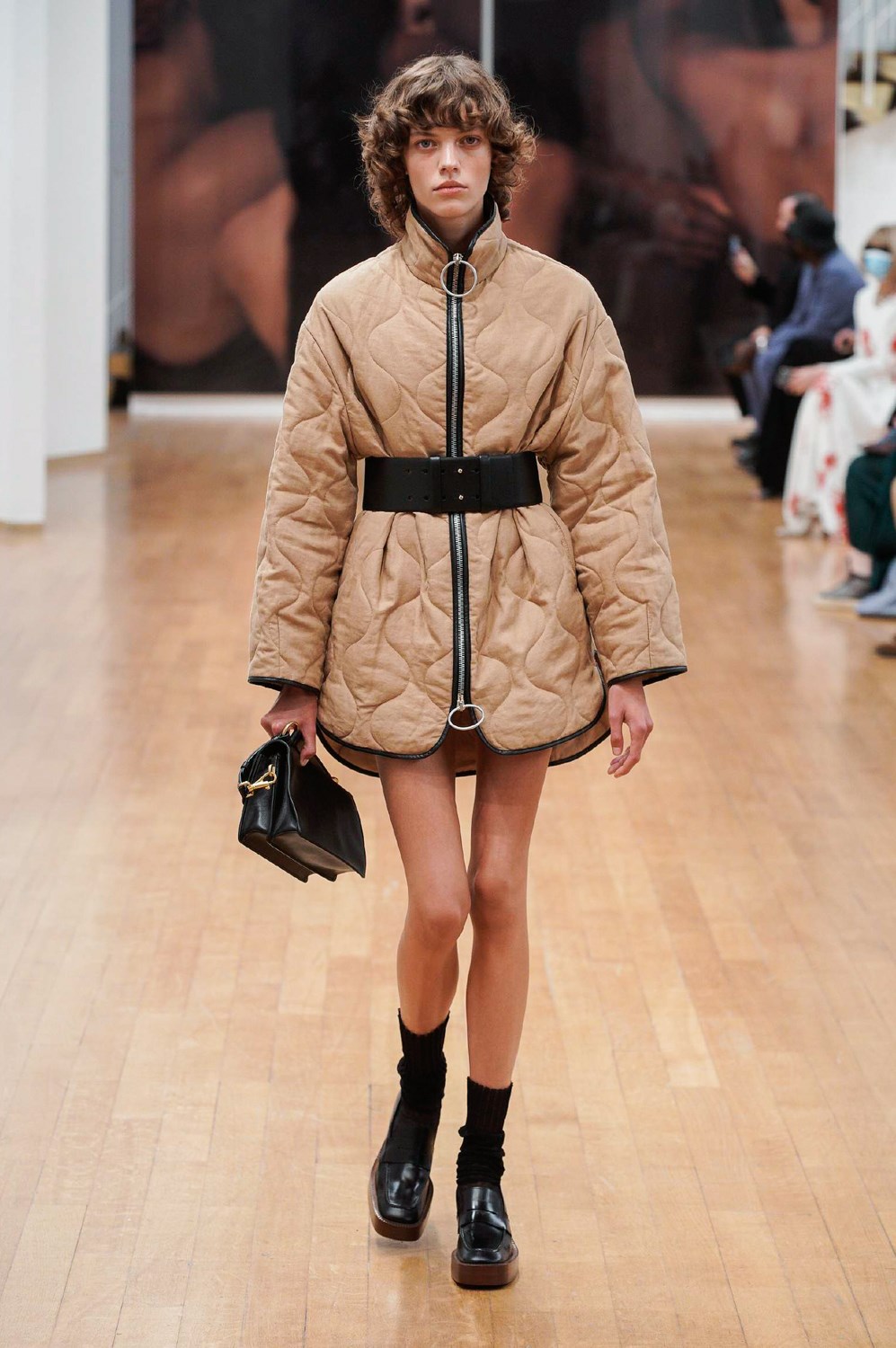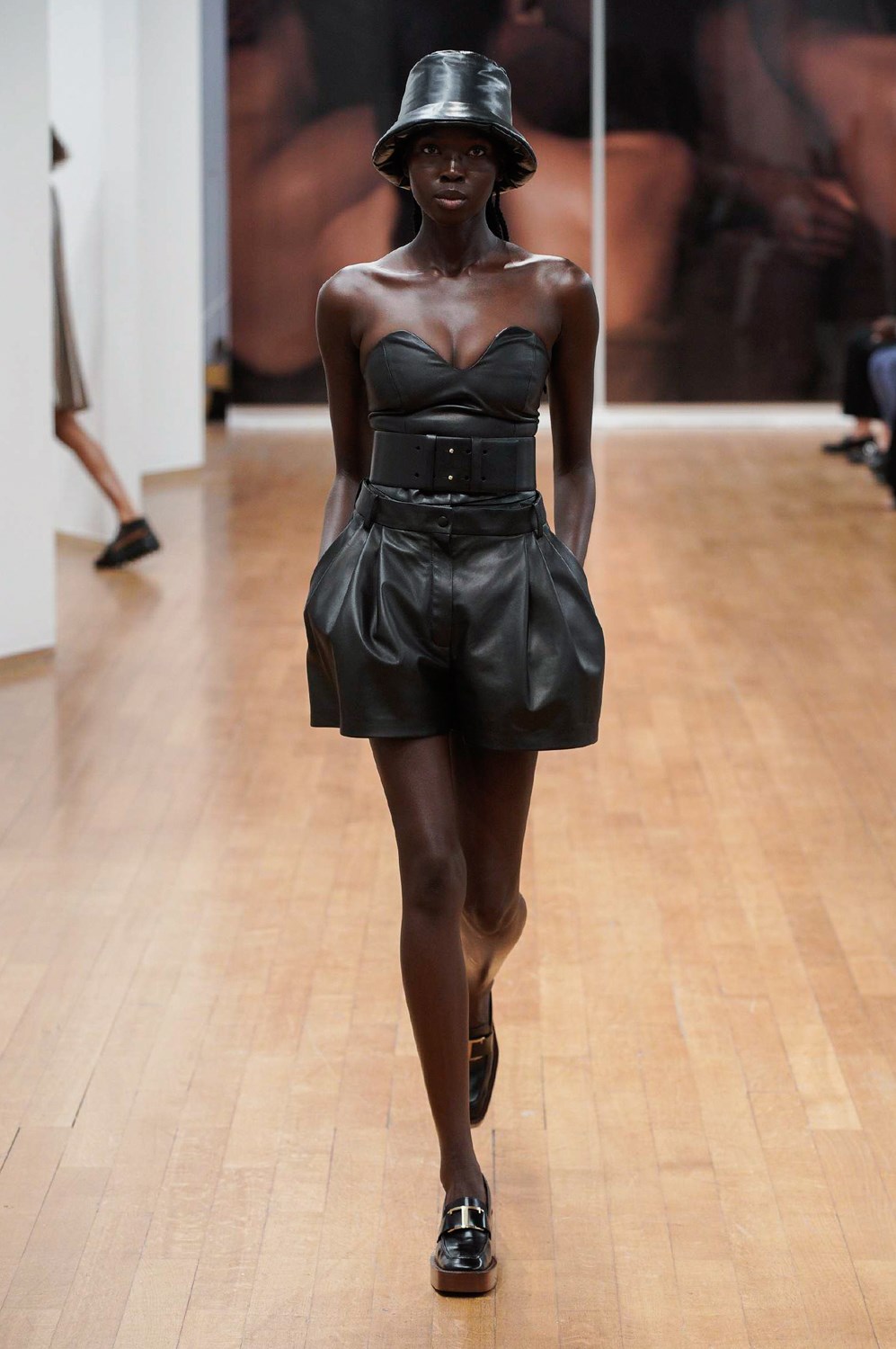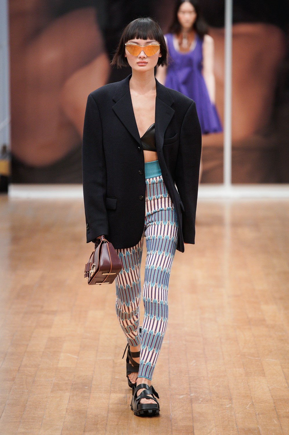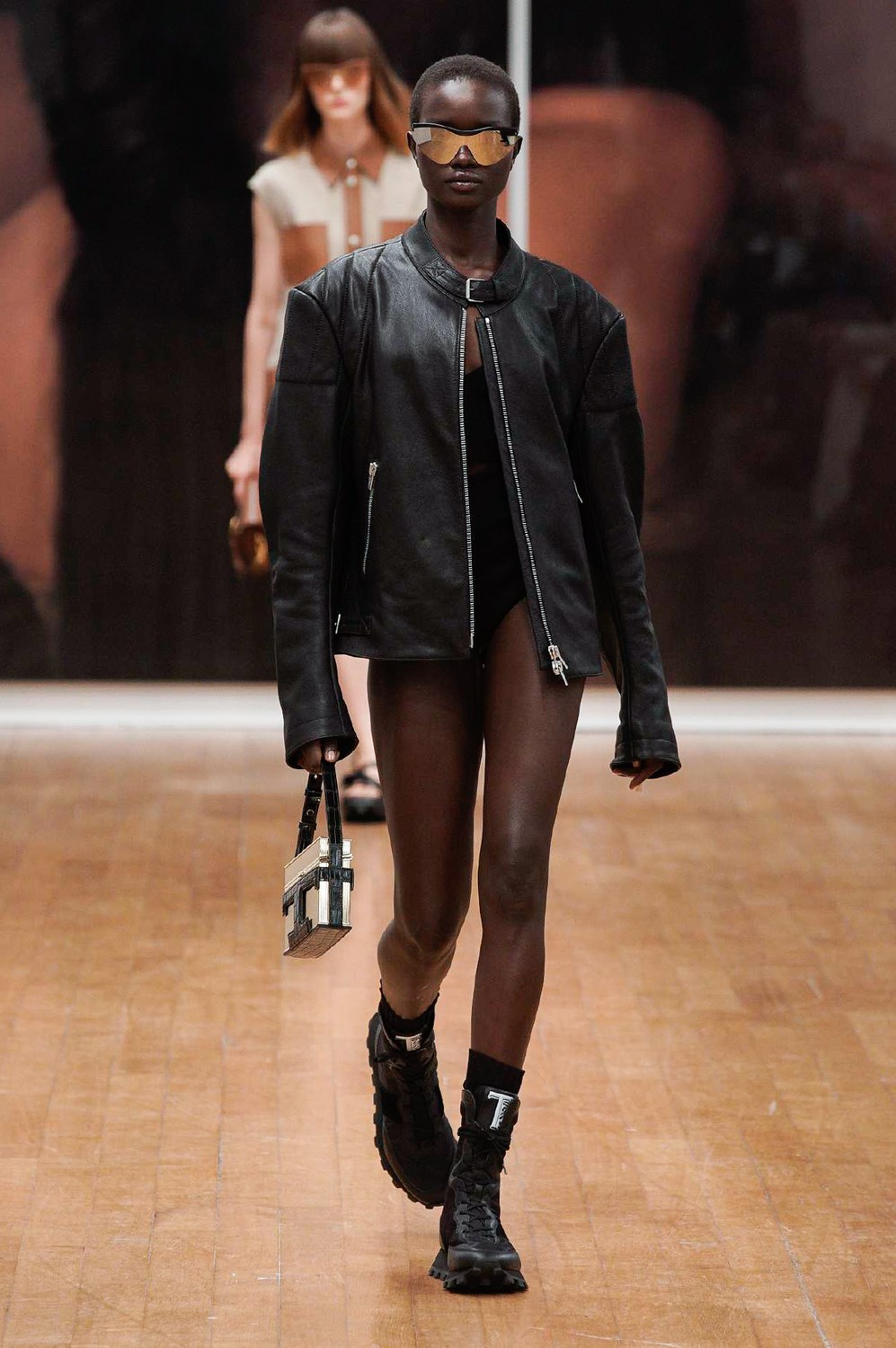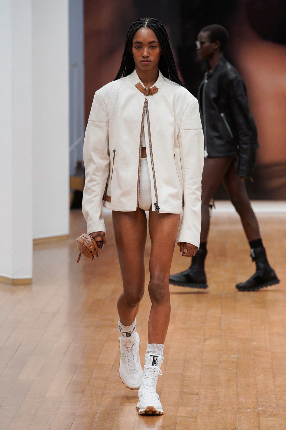 The collection proposed by Tod’s sets the rules for the textures and colors of the next SS22. White, black and beige are the gentle protagonists of looks that mix the iconic elegance of the brand with a new, bolder and more informal spirit. The boots are laced and high up to the calf and contrast with leather dad slippers for a new-found but no less cool comfort. The outerwear is in ultralight leather, with a straight cut and 60s style. To these are added oversized biker jackets that wink at boyfriend style and trapeze padded jackets. The shorts are high-waisted and balloon-shaped and the blazers, strictly with oversized straps, are combined with athletic leggings and bra. The bright blue and purple differ from the usual Tod’s palette to match the leather and make it indispensable.