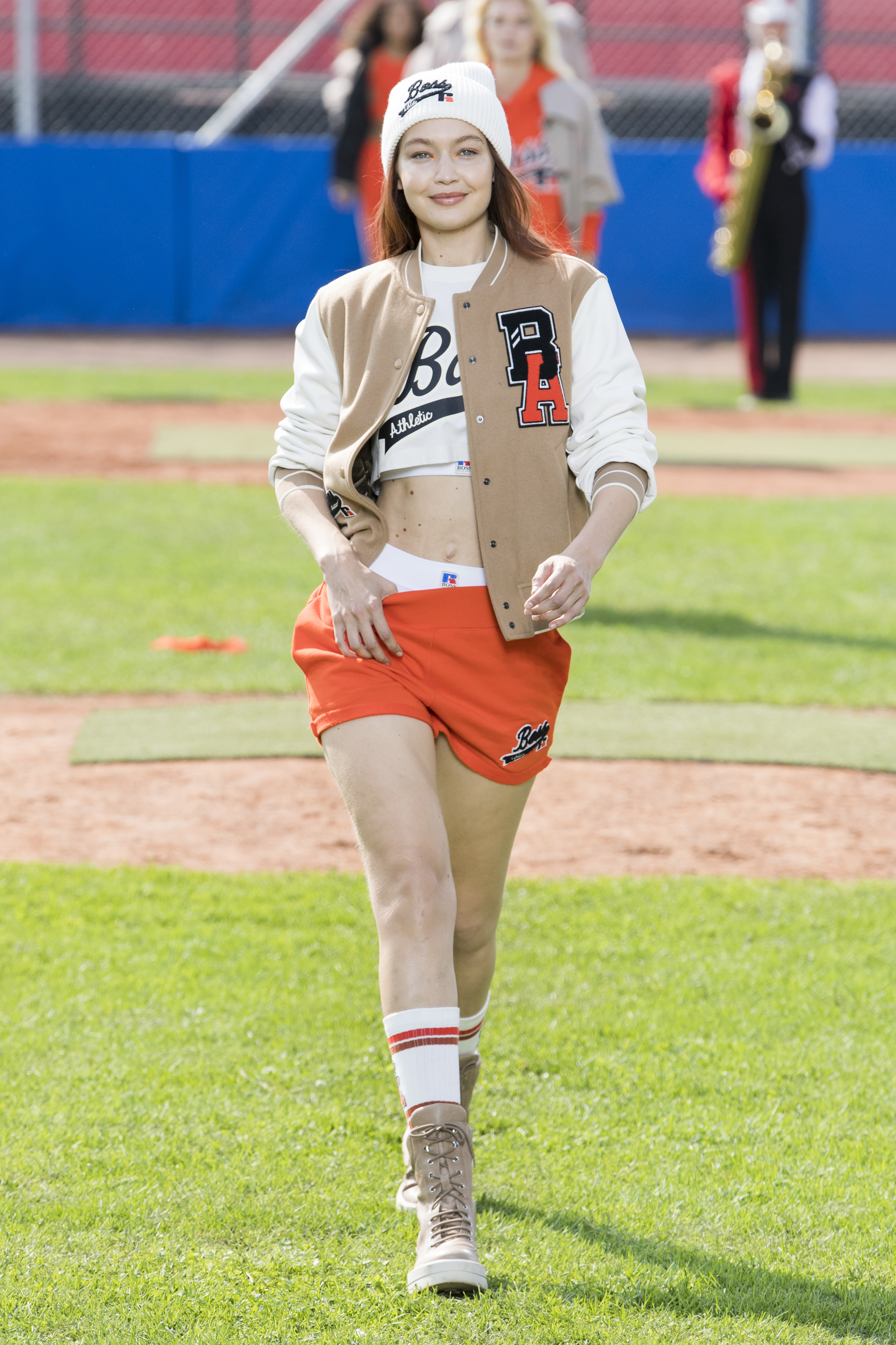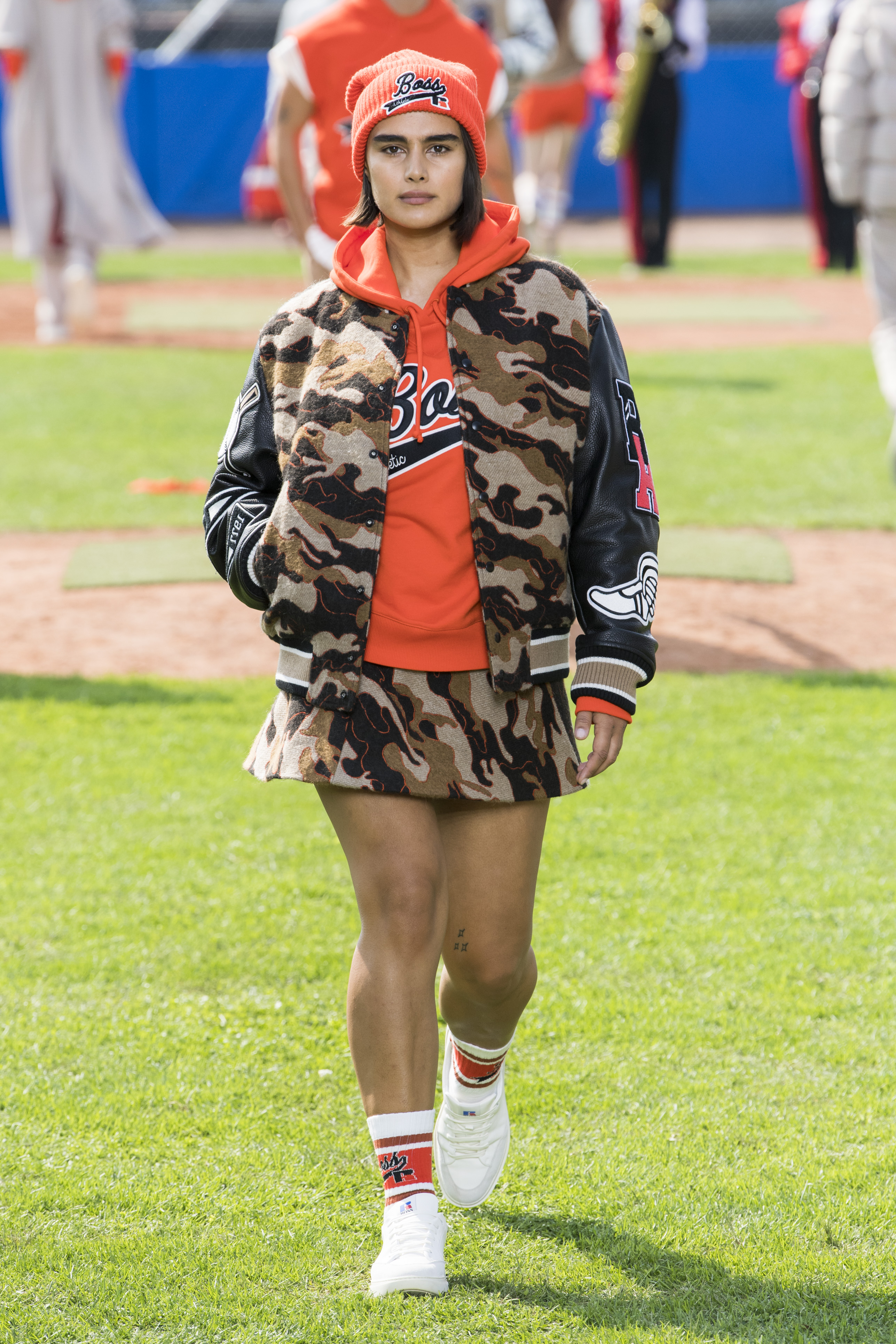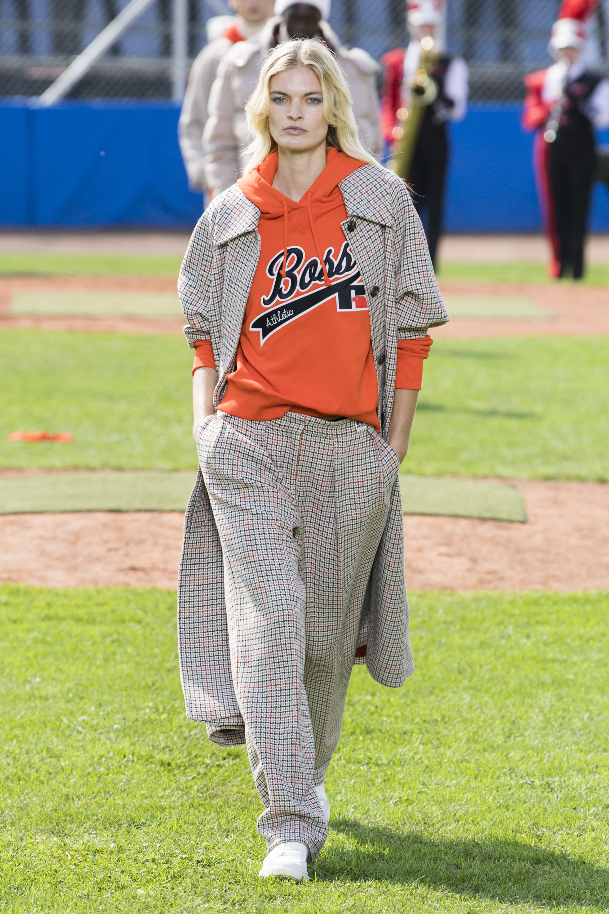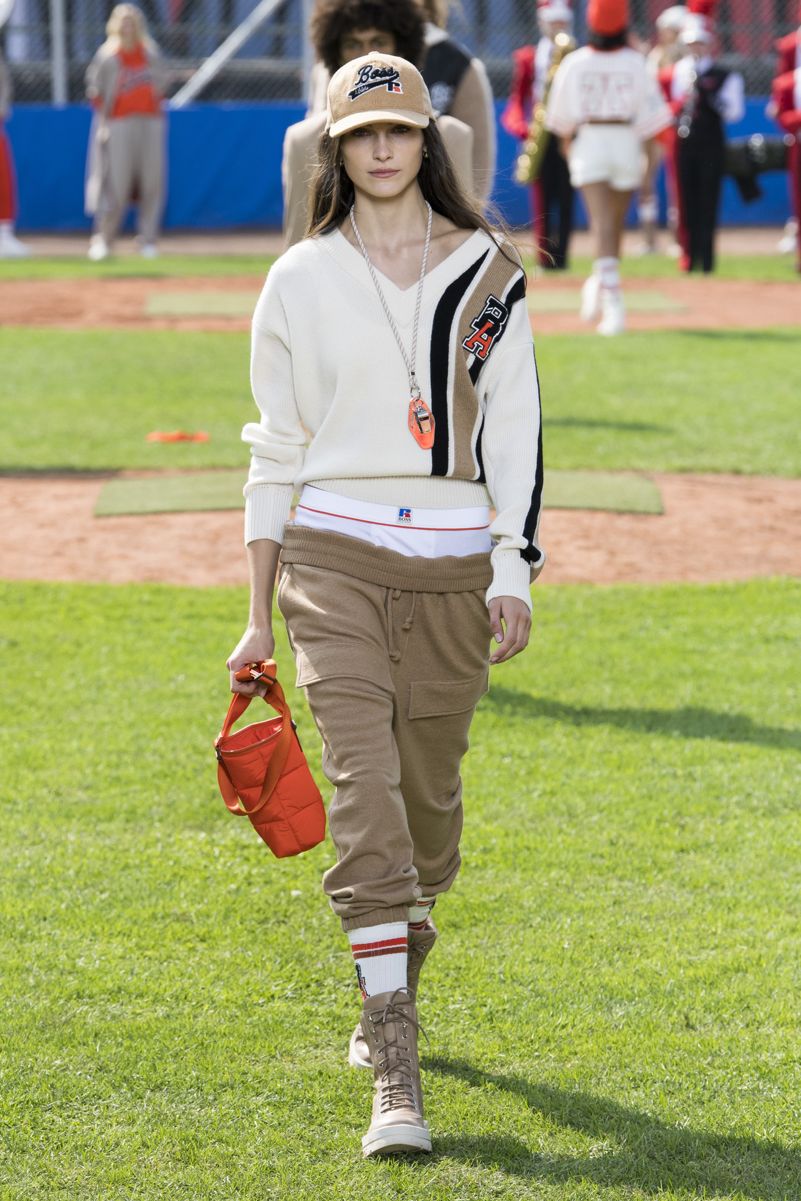 The tradition of the German Bundesliga moves to Milan in all its euphoria for the Hugo Boss SS22 collection. The Maison, in fact, has kidnapped its guests with an unprecedented and energetic show set in a baseball field in the Italian capital of prèt-à-porter. Cheerleaders, mascots and caddies roam the pitch frantically, becoming the backdrop for a decidedly casual and already trendy collection. Orange is the protagonist of the looks, mixing with beige, white, black and blue in knitted shorts to wear with a low waist to let a glimpse of masculine boxers. Jackets are varsity with extra-large patches and shapes, sweatshirts have hoods and match scarves, bags and beanies. Shirts become jackets to be worn with lace-up boots and trench coats the perfect ally of checked coord suits.