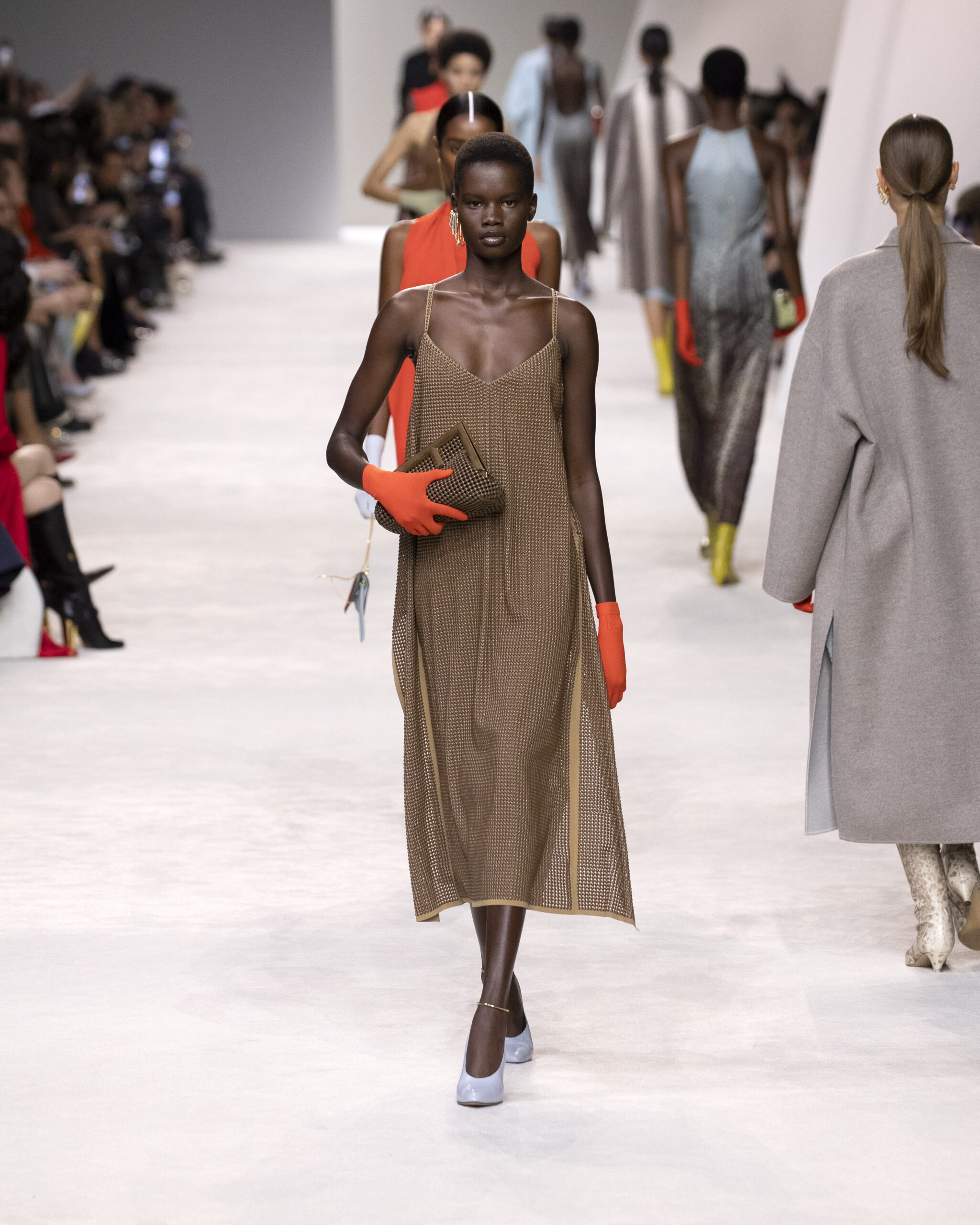Thus, Kim Jones’s Spring/Summer 2024 collection for Fendi is a perfect fusion of art and fashion, a concept embraced with extraordinary naturalness and elegance. To further enrich the show, an extraordinary lineup of designer’s friends and icons, including Linda Evangelista, Naomi Campbell, Amber Valletta, Kate Moss, Demi Moore, Cara Delevingne, and Chiara Ferragni.