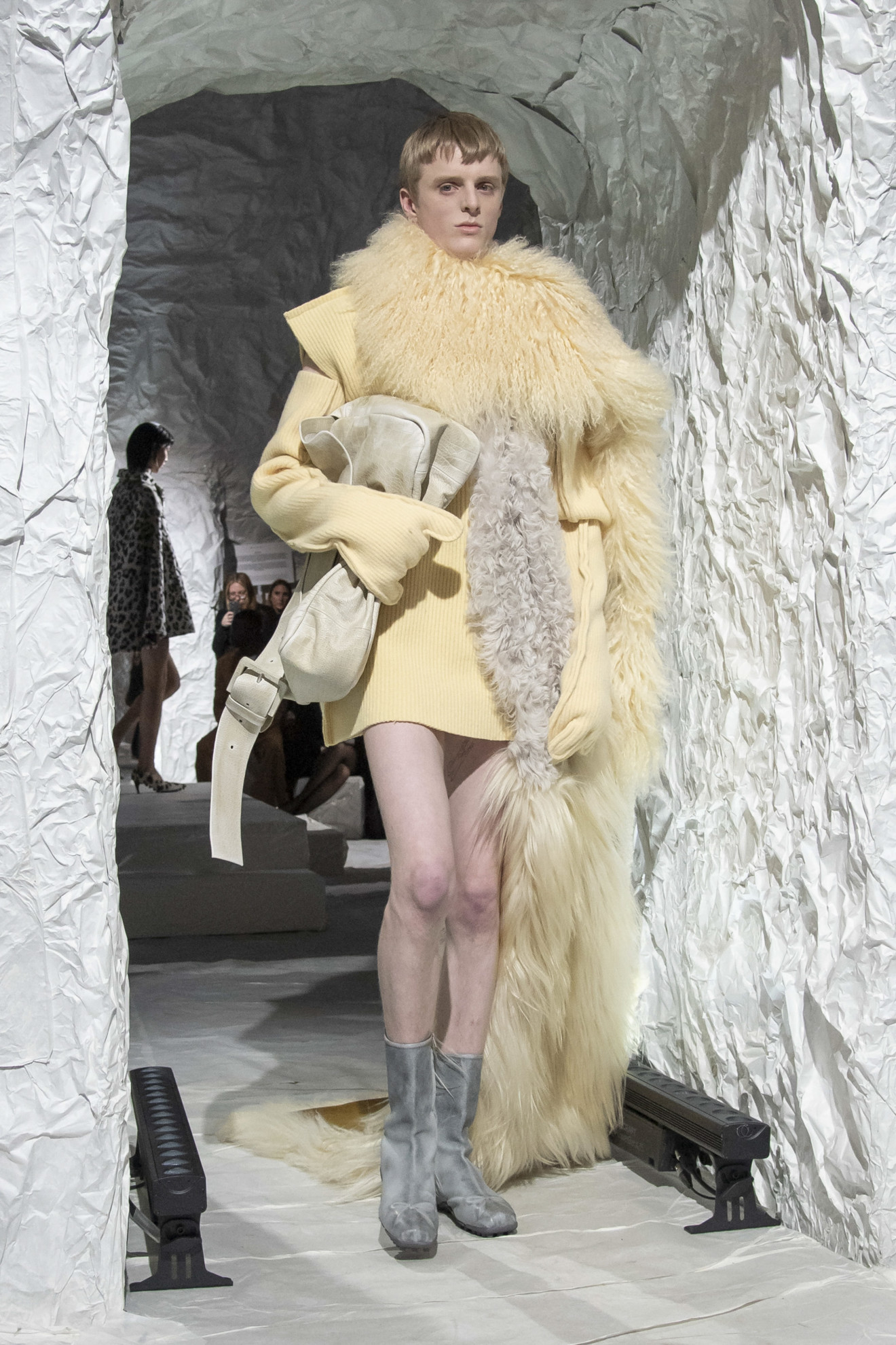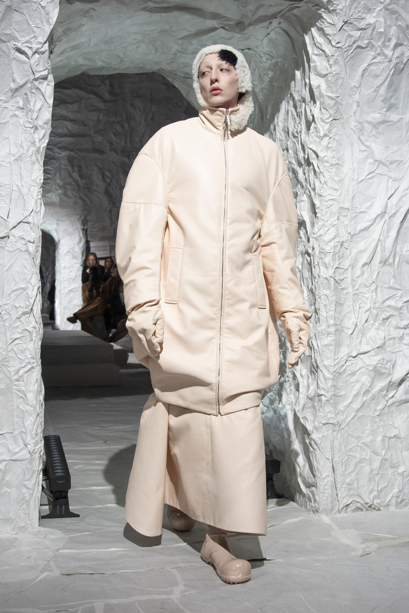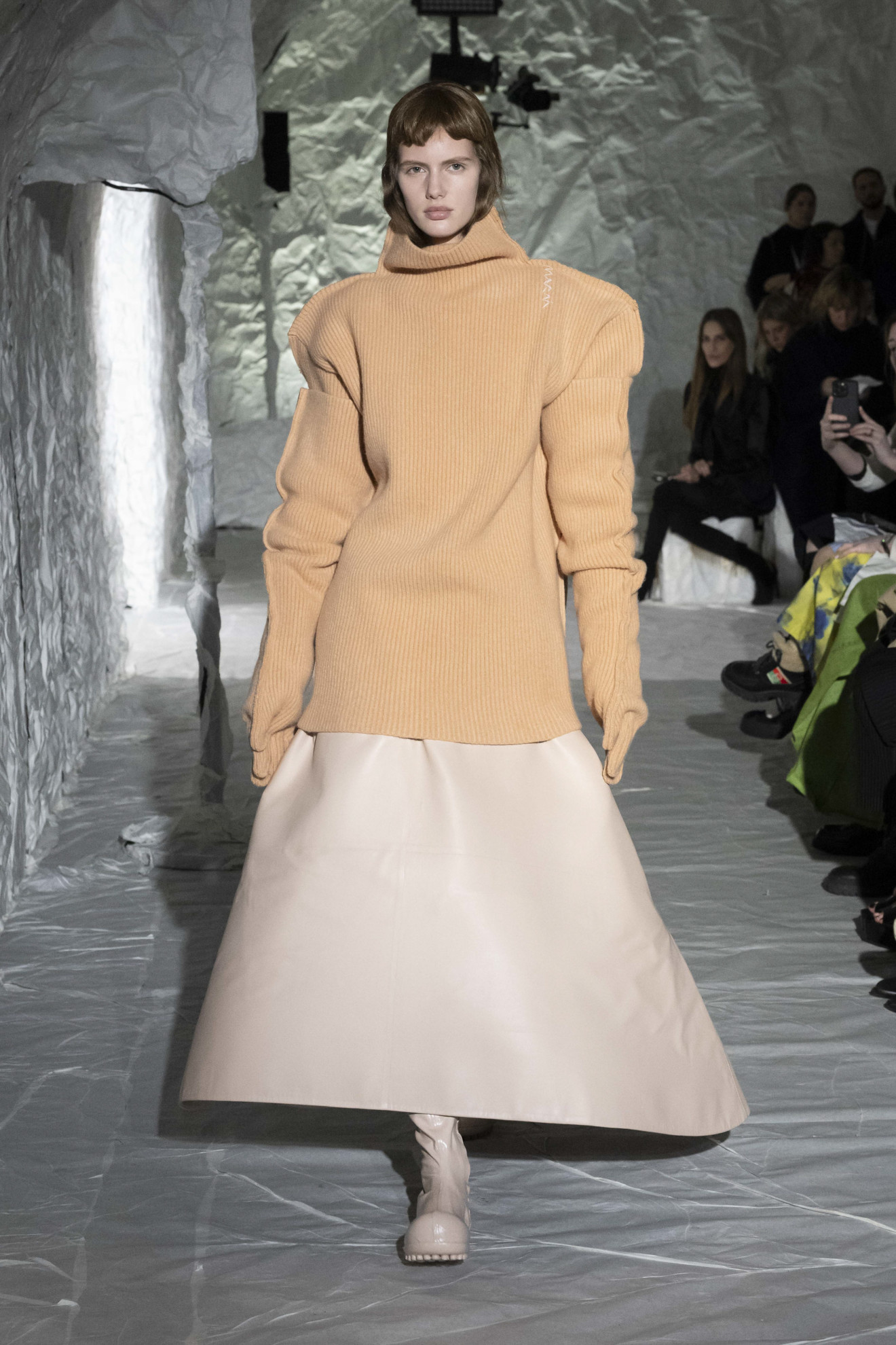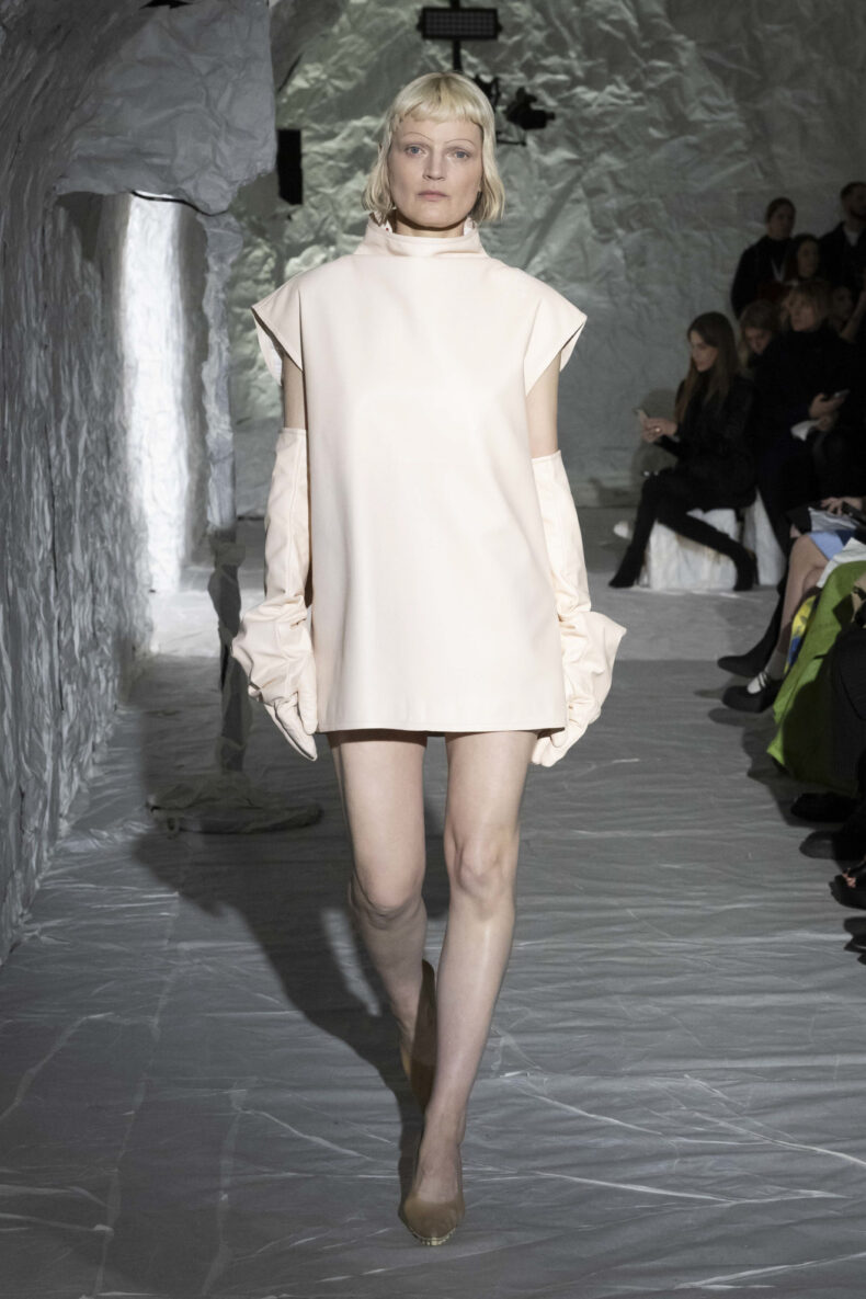 Marni depicted amplified shapes and volumes. The collection was presented in a suggestive space, completely covered in white paper, emphasizing the surreal and conceptual atmosphere of the show. The bold use of materials and textures created a stunning effect, while clean cuts and essential lines paid homage to the purity of form. Overall, this imagery represented a celebration of art and creativity, with a unique and innovative aesthetic.