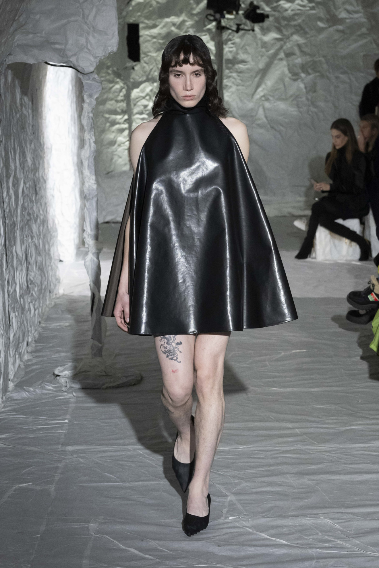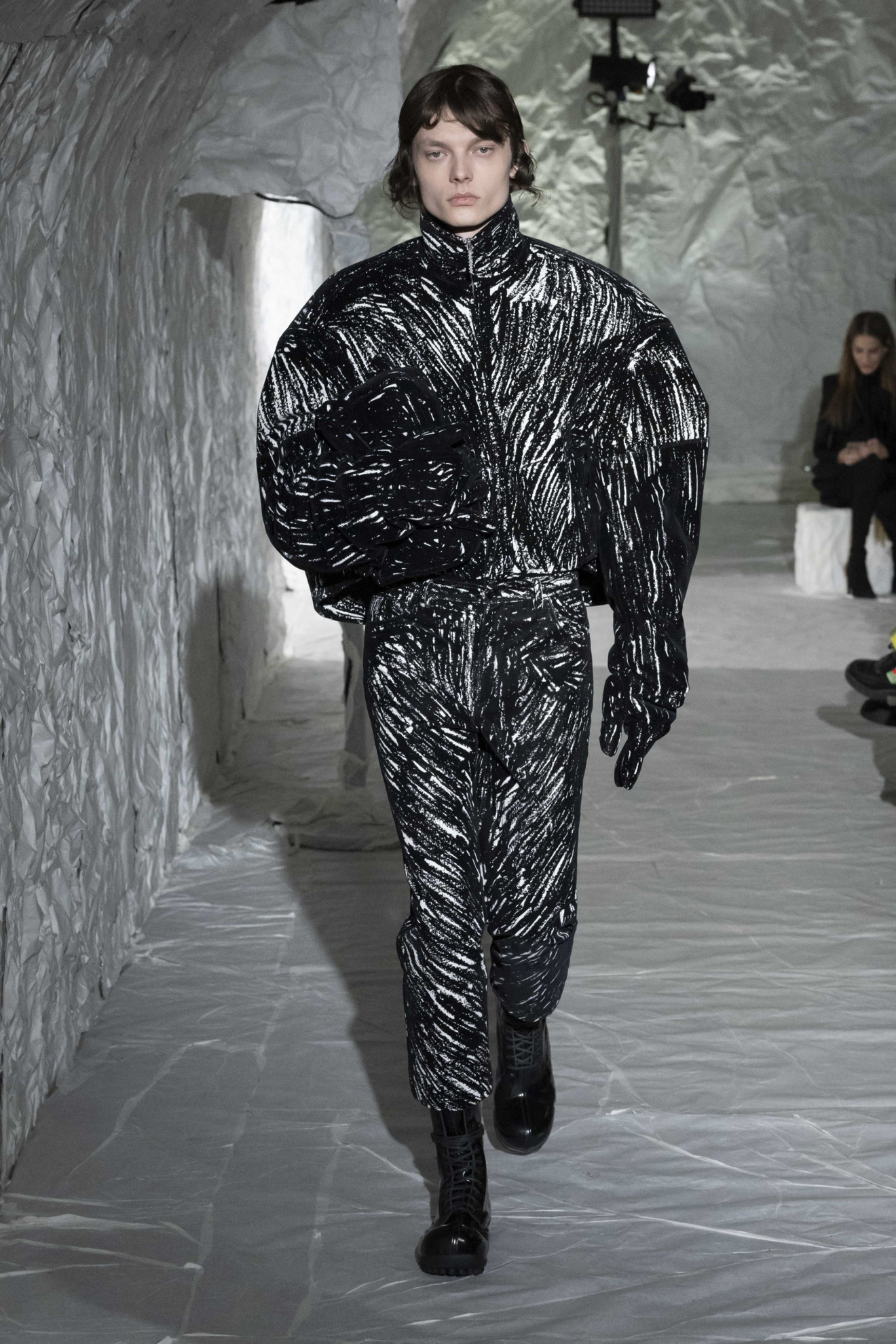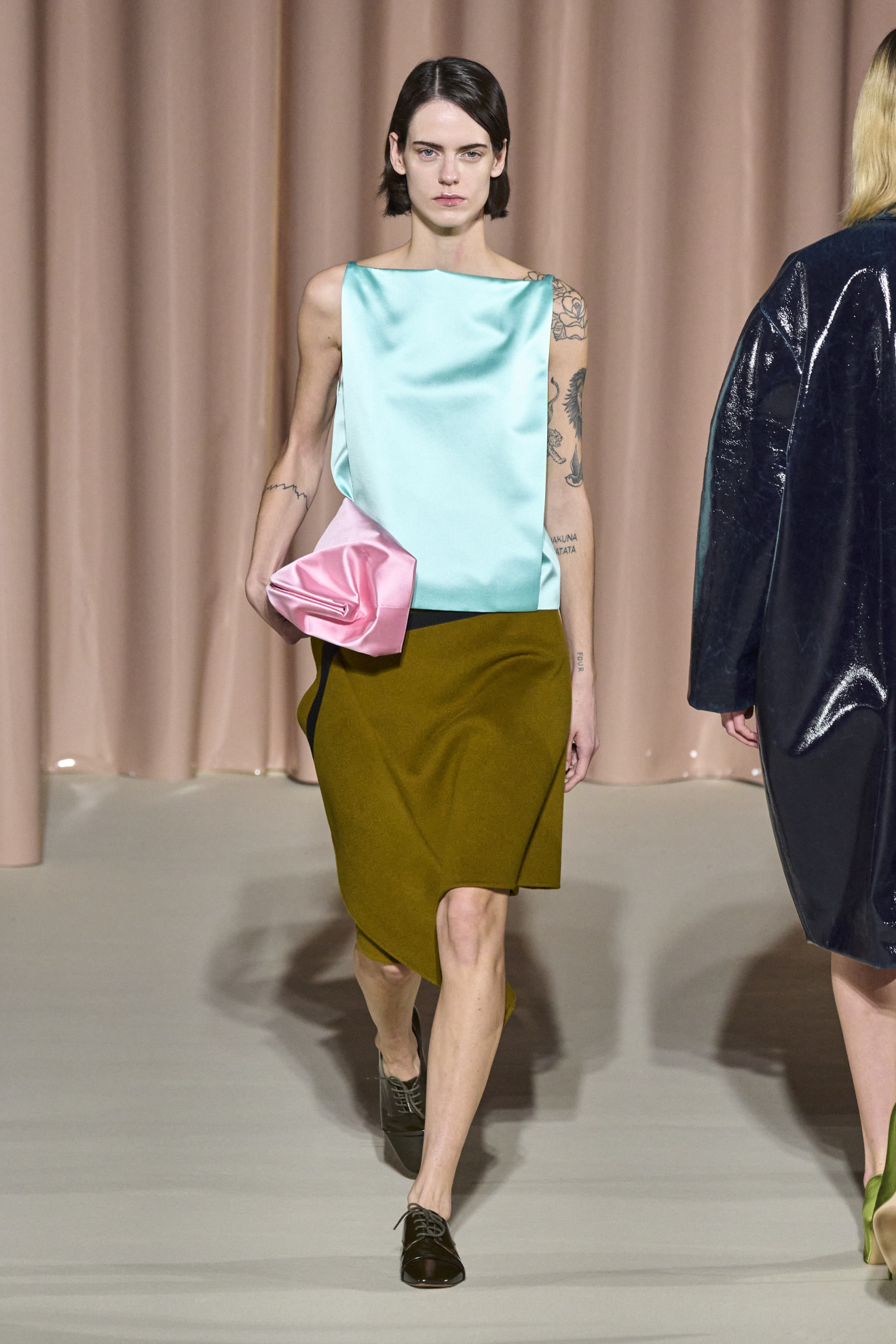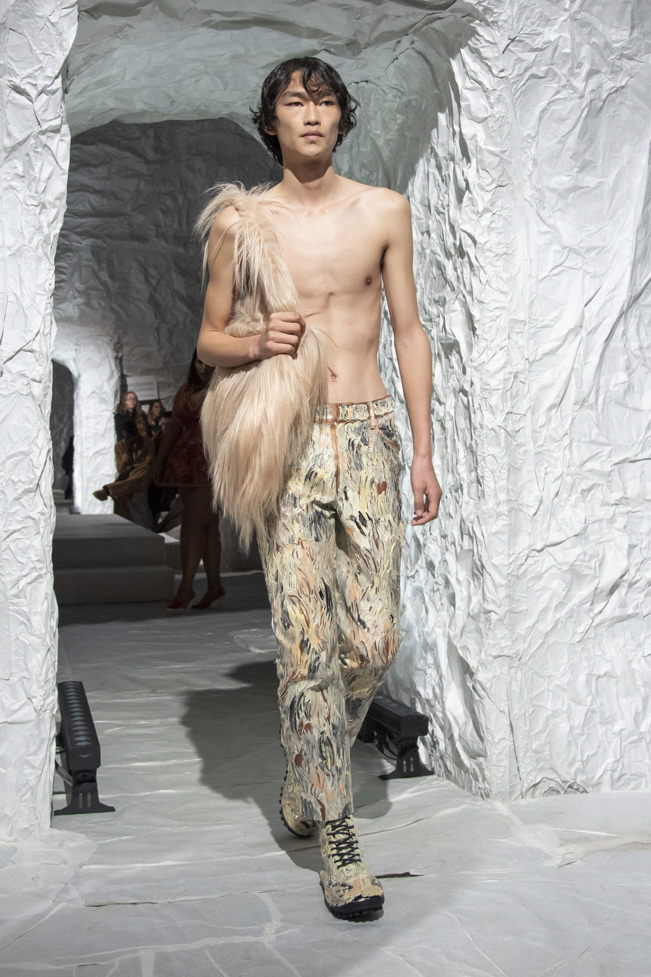 Marni depicted amplified shapes and volumes. The collection was presented in a suggestive space, completely covered in white paper, emphasizing the surreal and conceptual atmosphere of the show. The bold use of materials and textures created a stunning effect, while clean cuts and essential lines paid homage to the purity of form. Overall, this imagery represented a celebration of art and creativity, with a unique and innovative aesthetic.