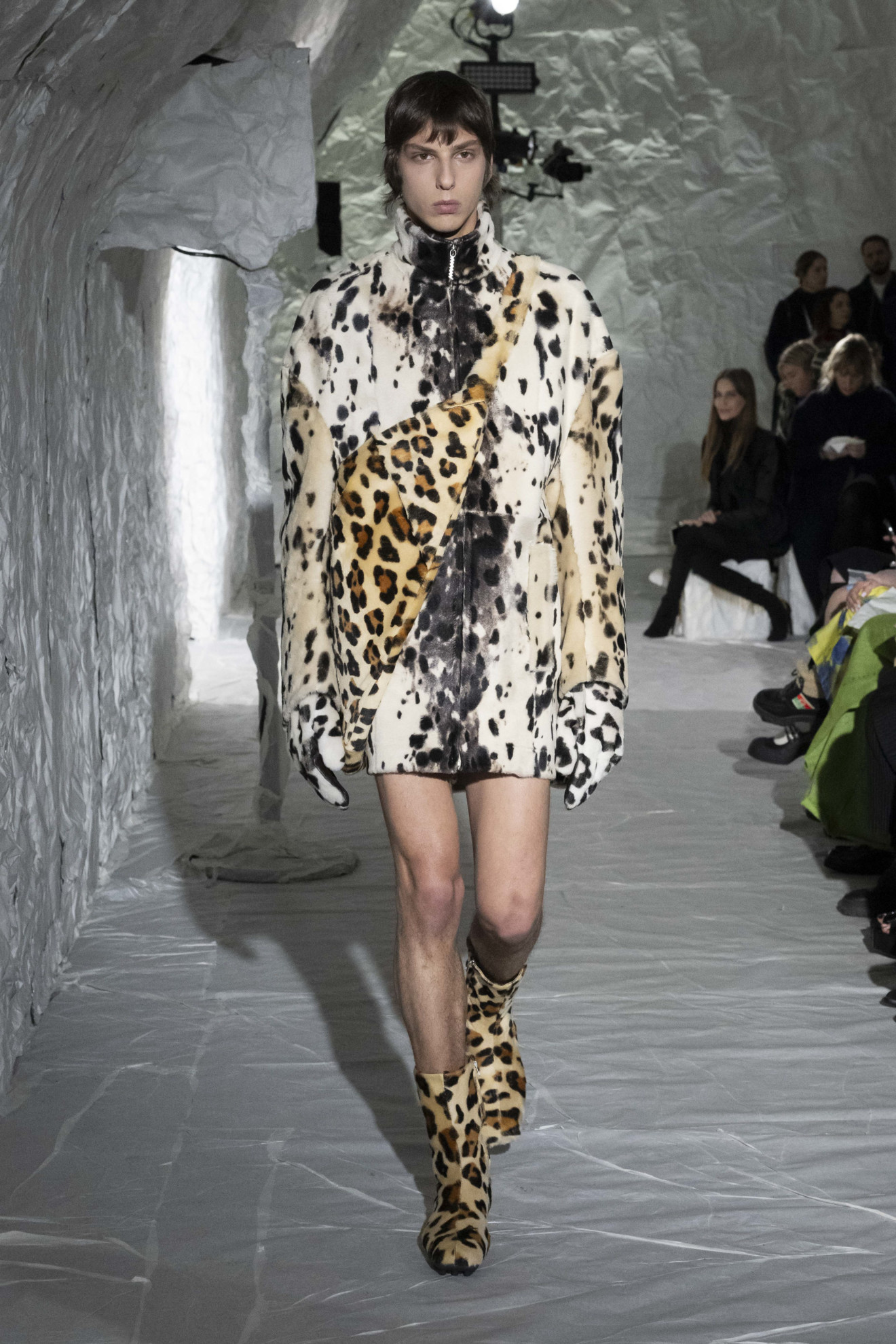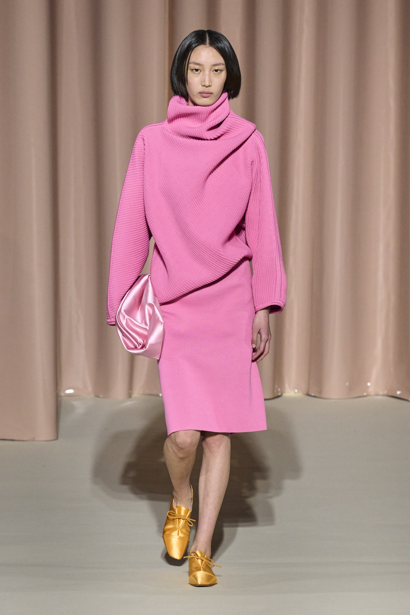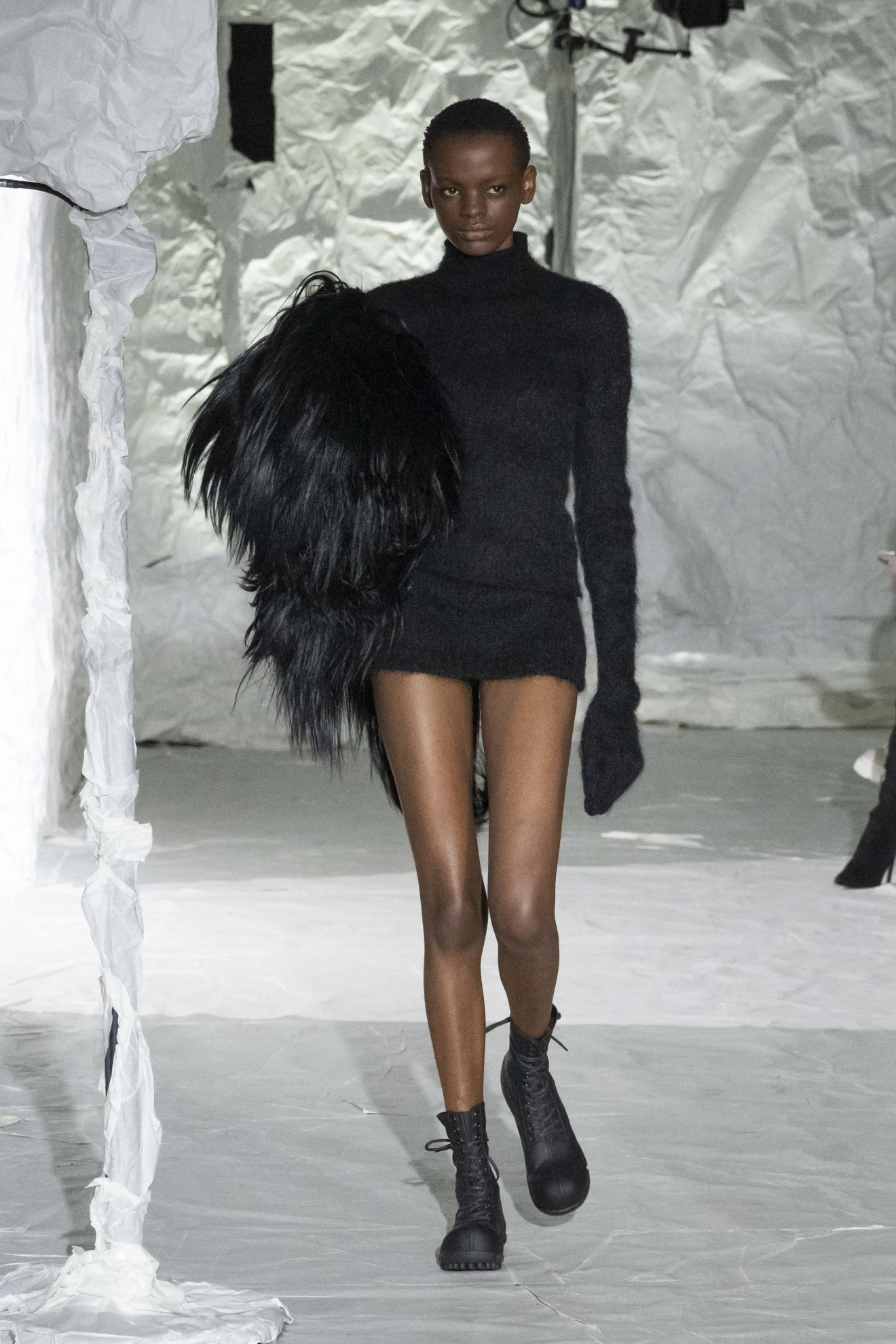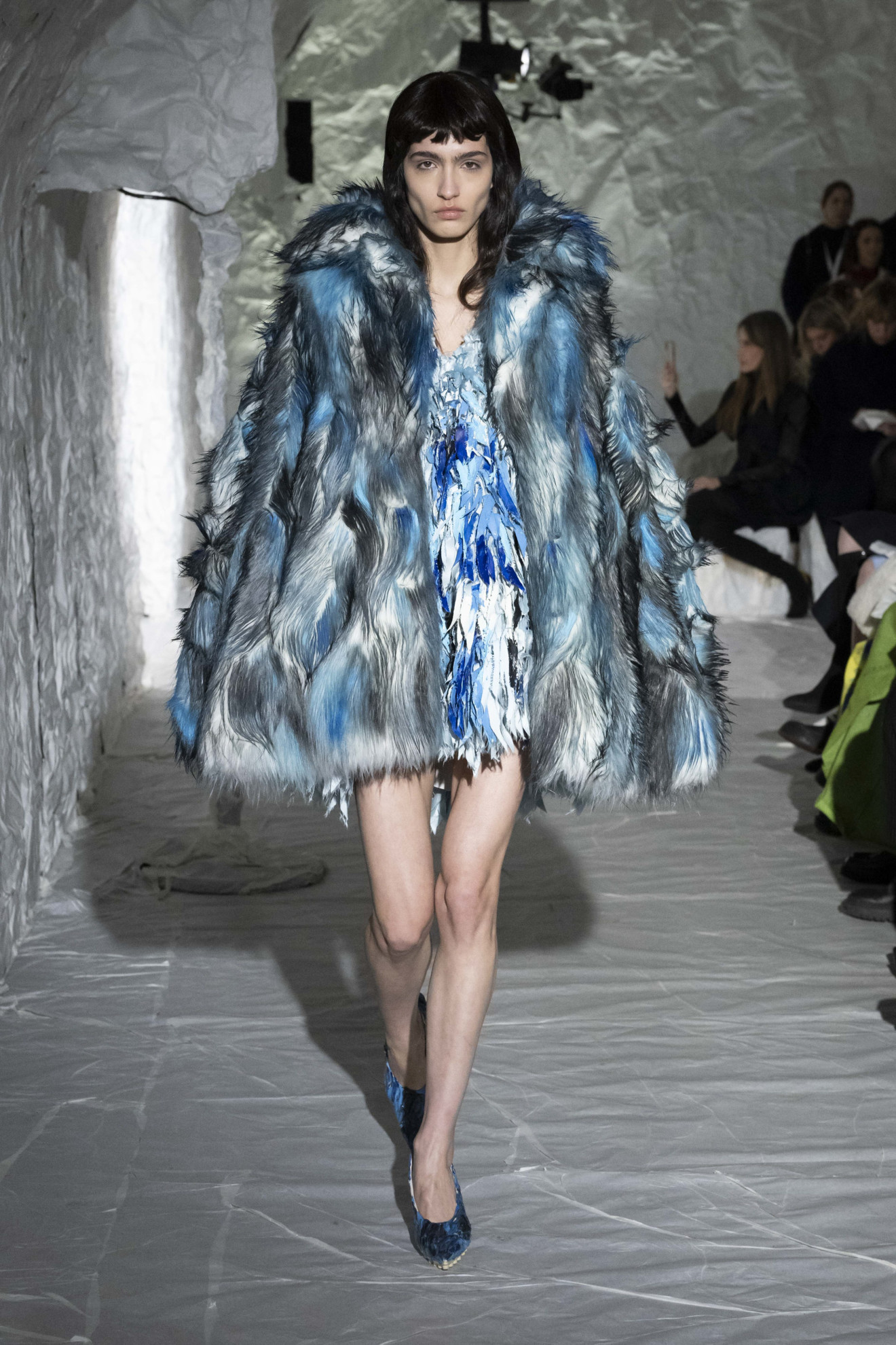 Marni depicted amplified shapes and volumes. The collection was presented in a suggestive space, completely covered in white paper, emphasizing the surreal and conceptual atmosphere of the show. The bold use of materials and textures created a stunning effect, while clean cuts and essential lines paid homage to the purity of form. Overall, this imagery represented a celebration of art and creativity, with a unique and innovative aesthetic.