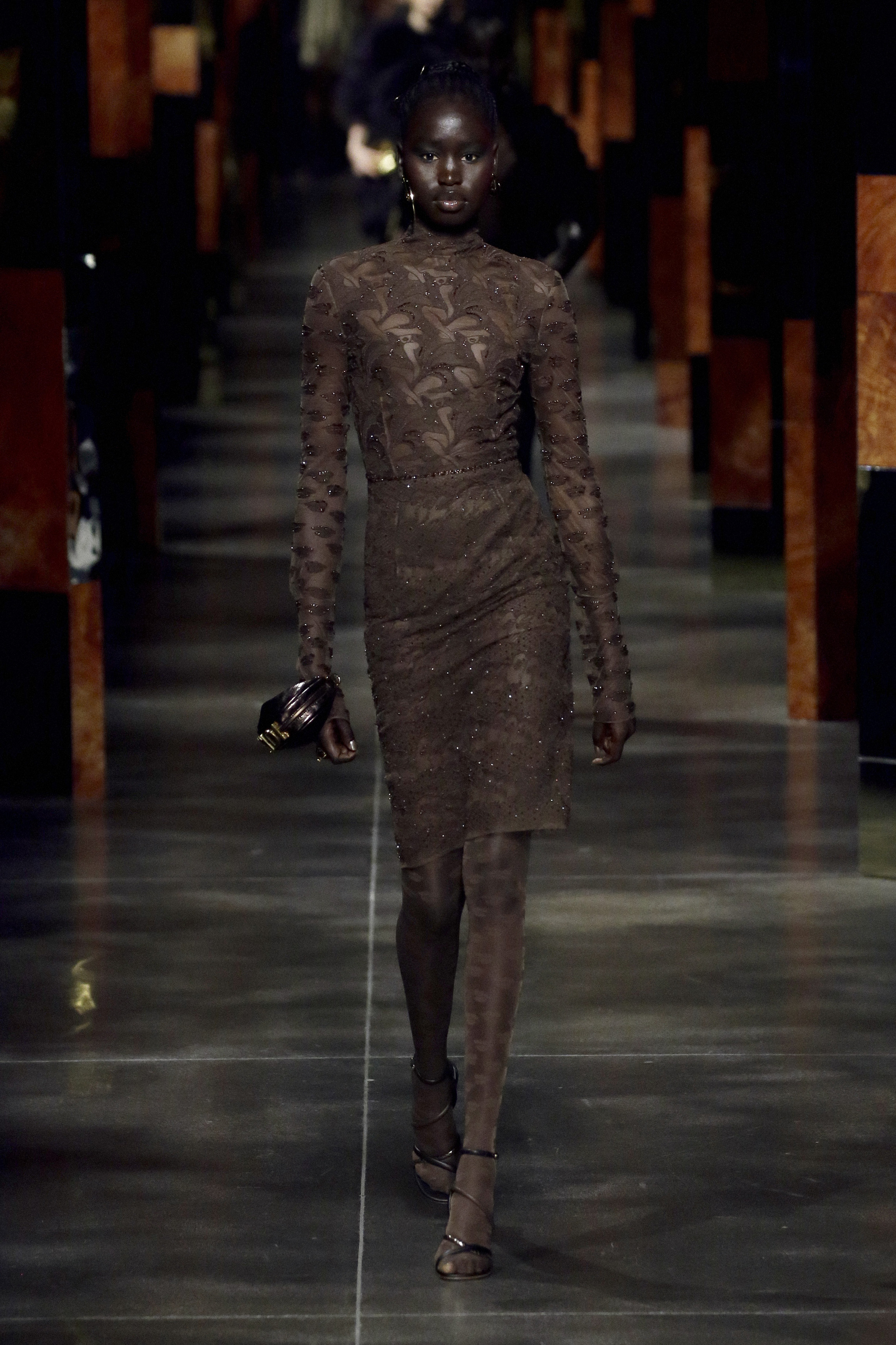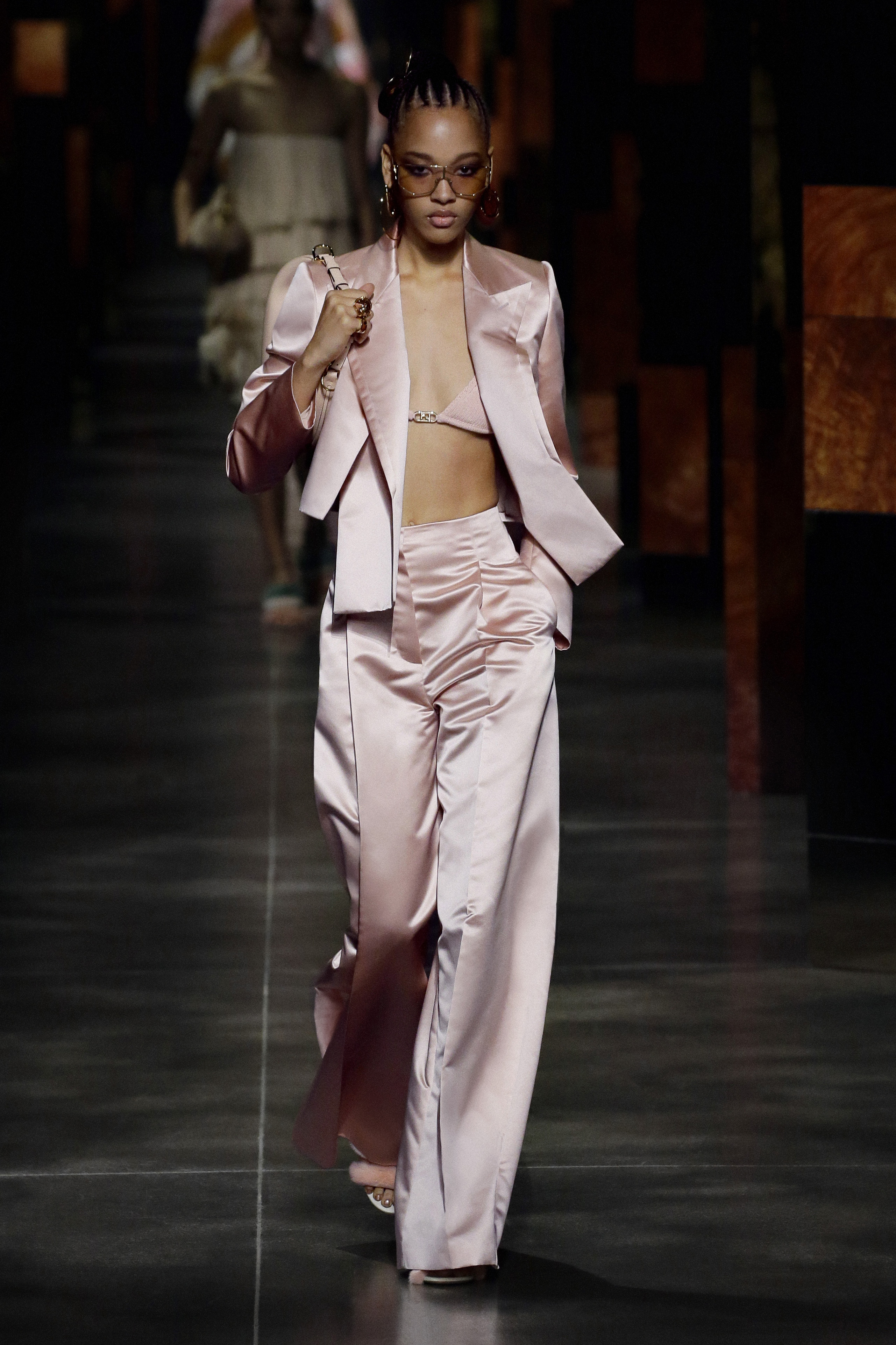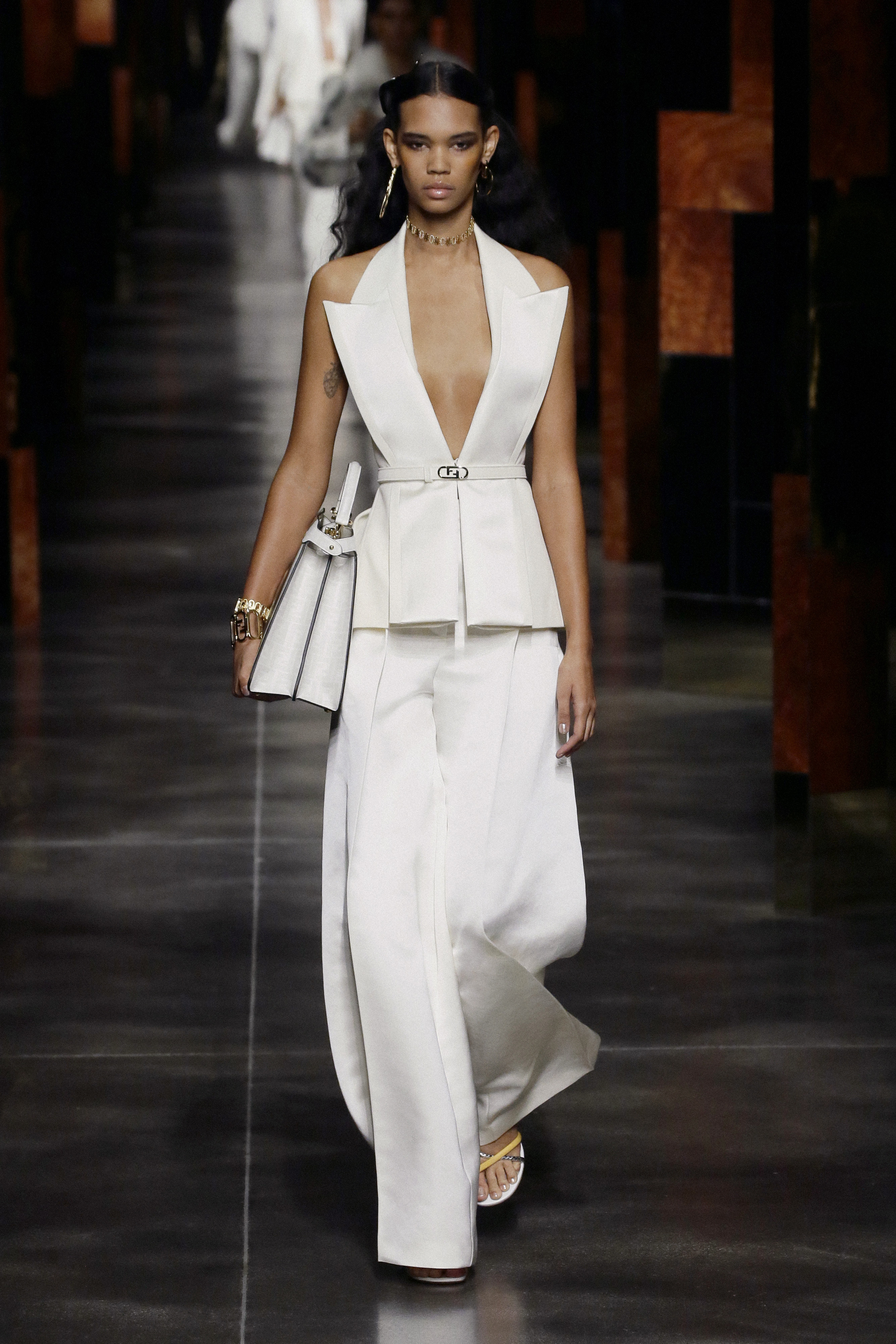 Mr. Kim Jones for Fendi revisits the joyful irreverence that has characterized the Maison since the beginning. He winks at the lines and style of the 90s disco by combining very short rectangle sheath dresses with over-the-knee boots. Fendi’s femininity for summer 2022 is different, it is powerful, it captures the beauty of the past and reincarnates it in a future with a thousand perspectives. The drawings of the illustrator Antonio Lopez dig into the archives of the Roman brand and become the starting point for prints that seem to be an ode to Studio 54 and to his loyal artists Andy Warhol, Steven Meisel, David Hockney. The designs become the favorite pattern of pastel-colored caftans, silk shirts, inlaid leathers, lace, and shimmering jacquards. Together with them, proud one-color suits with cropped blazers and waistcoats with unusual volumes and wide-leg trousers with a very high waist parade. The Maison’s iconic bags adorn the looks by rediscovering themselves in rainbow-hued Baguette, Peekaboo transformed into graphic works of art and a bold FENDI First becomes the symbol of rebirth.